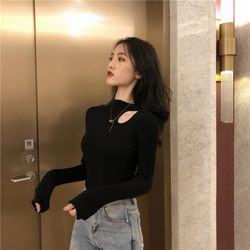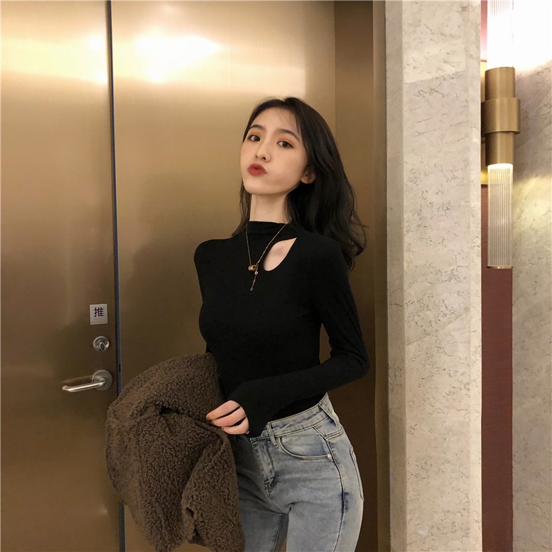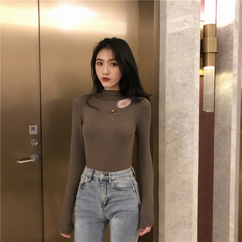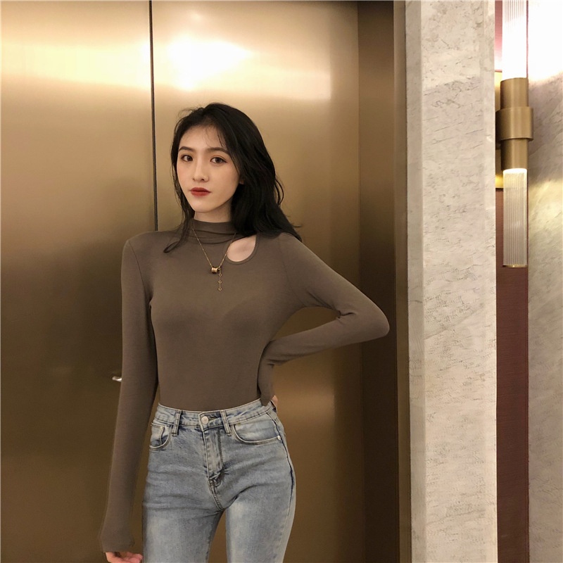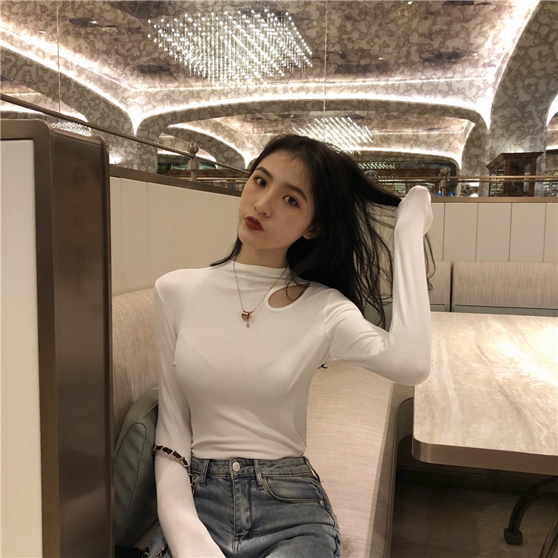 纯棉半高领打底衫女秋冬季洋气内搭修身小心机上衣露锁骨长袖T恤