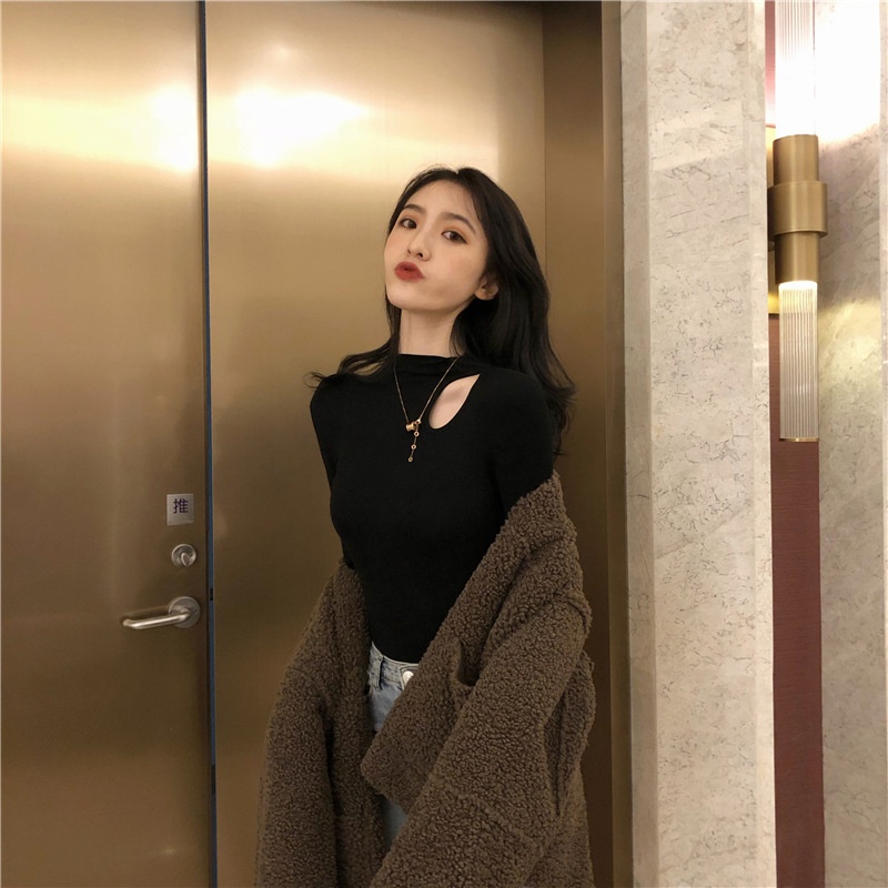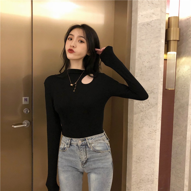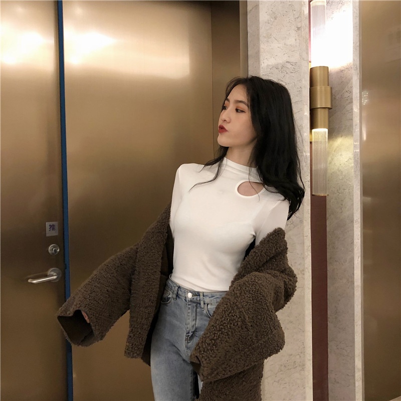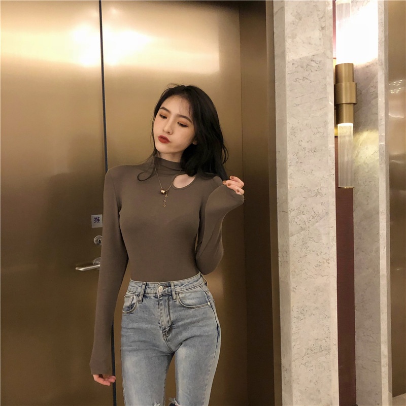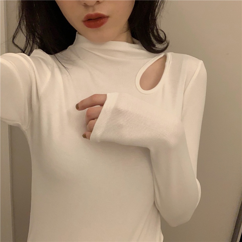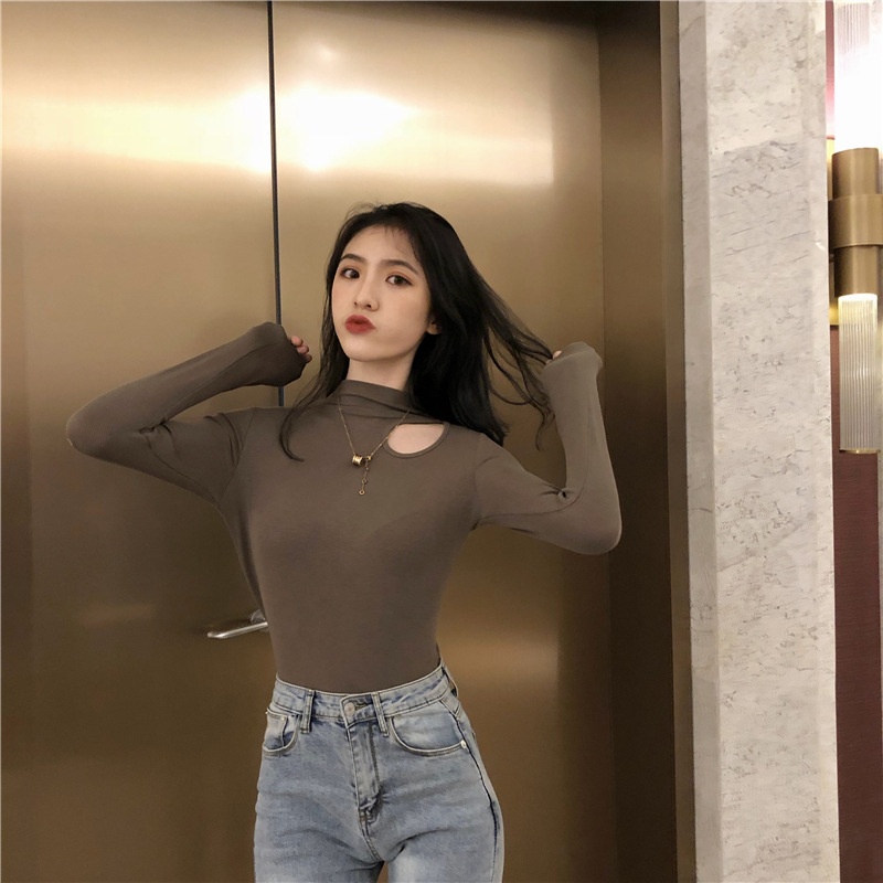 纯棉半高领打底衫女秋冬季洋气内搭修身小心机上衣露锁骨长袖T恤