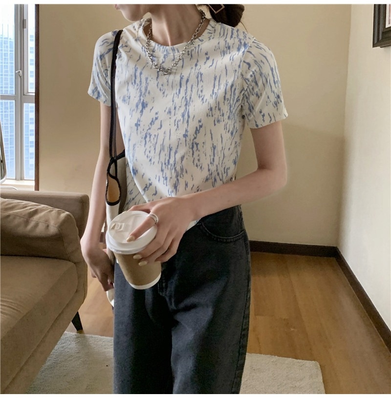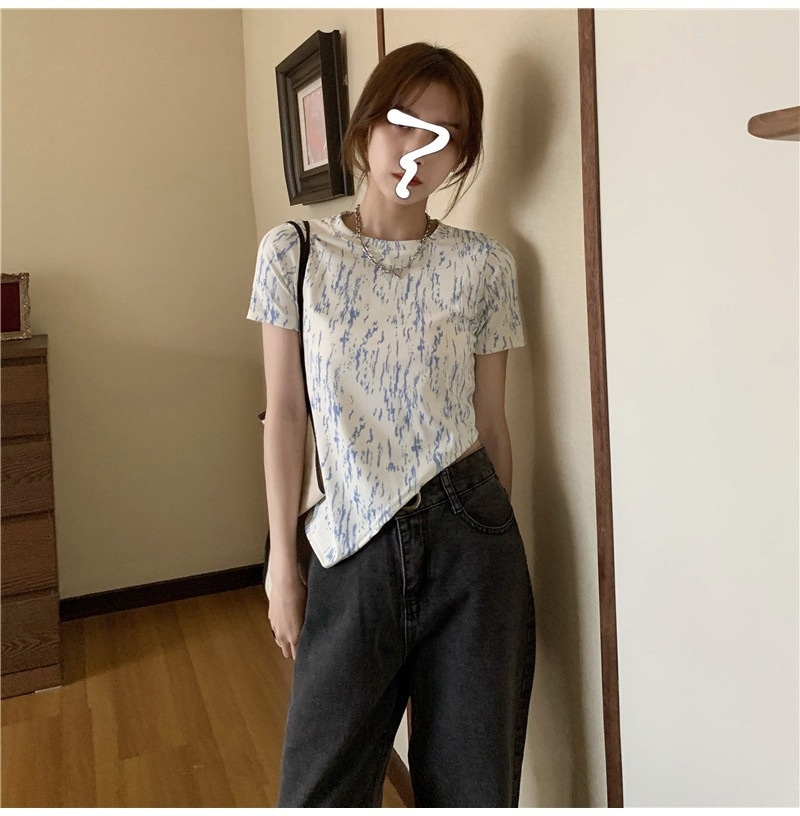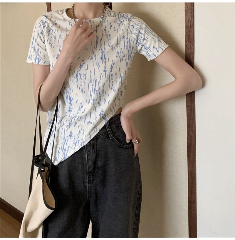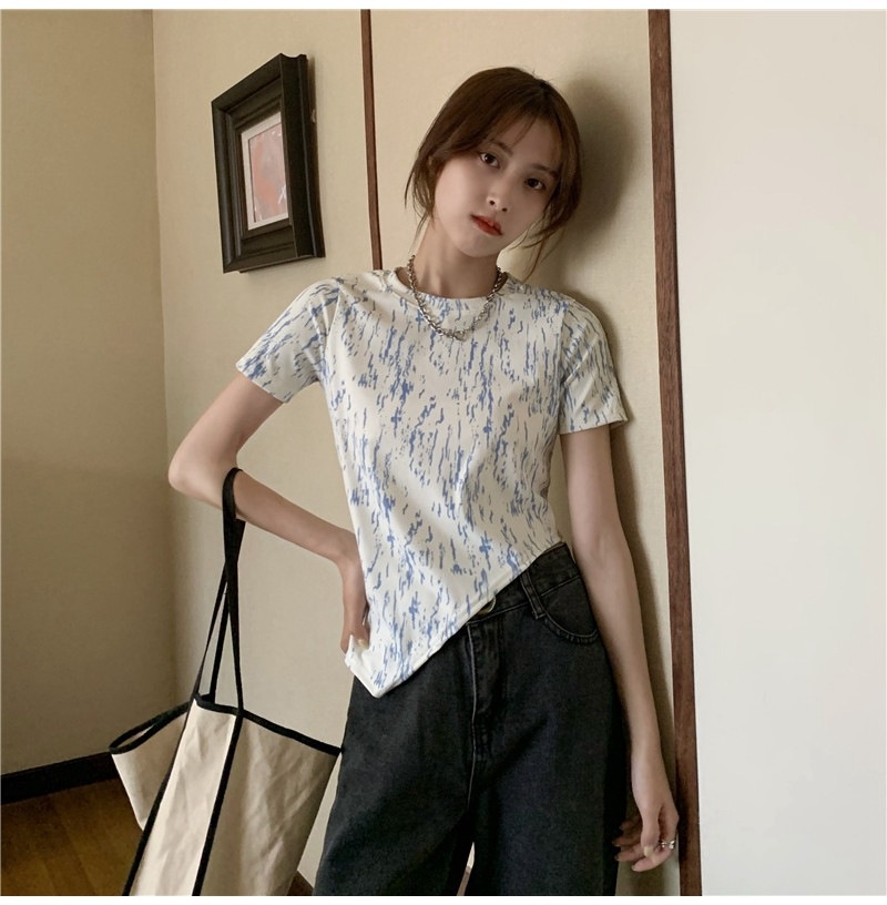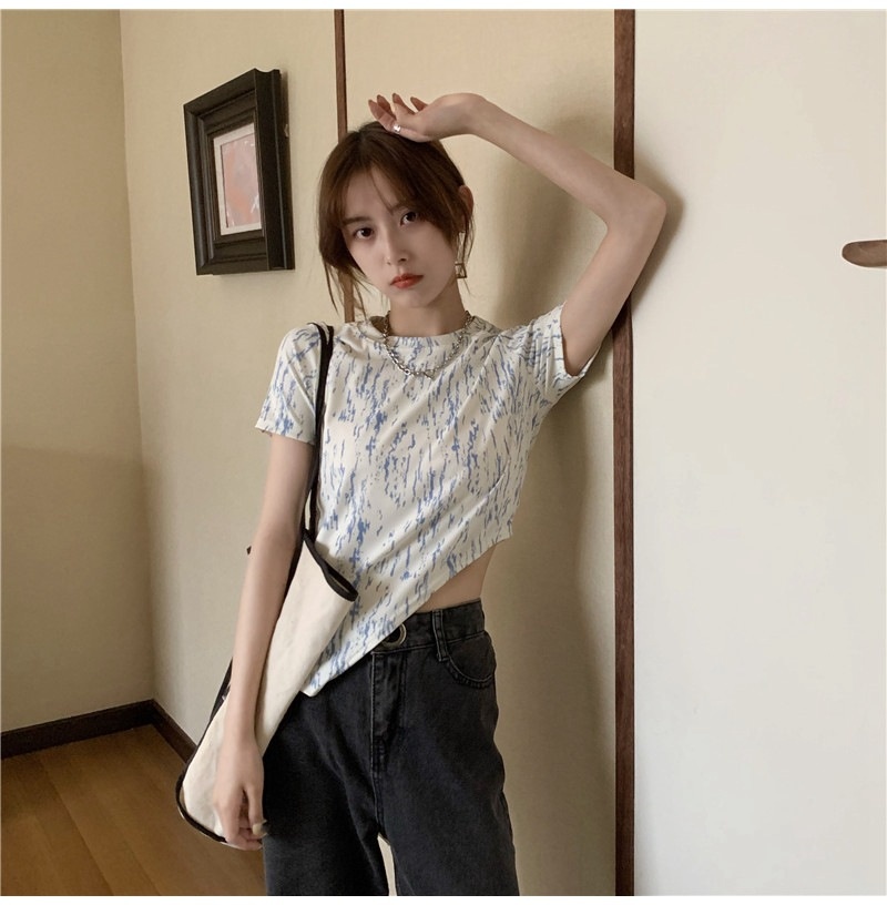 夏季2025年新款韩版修身显瘦扎染上衣不规则斜叉短袖T恤女装ins潮