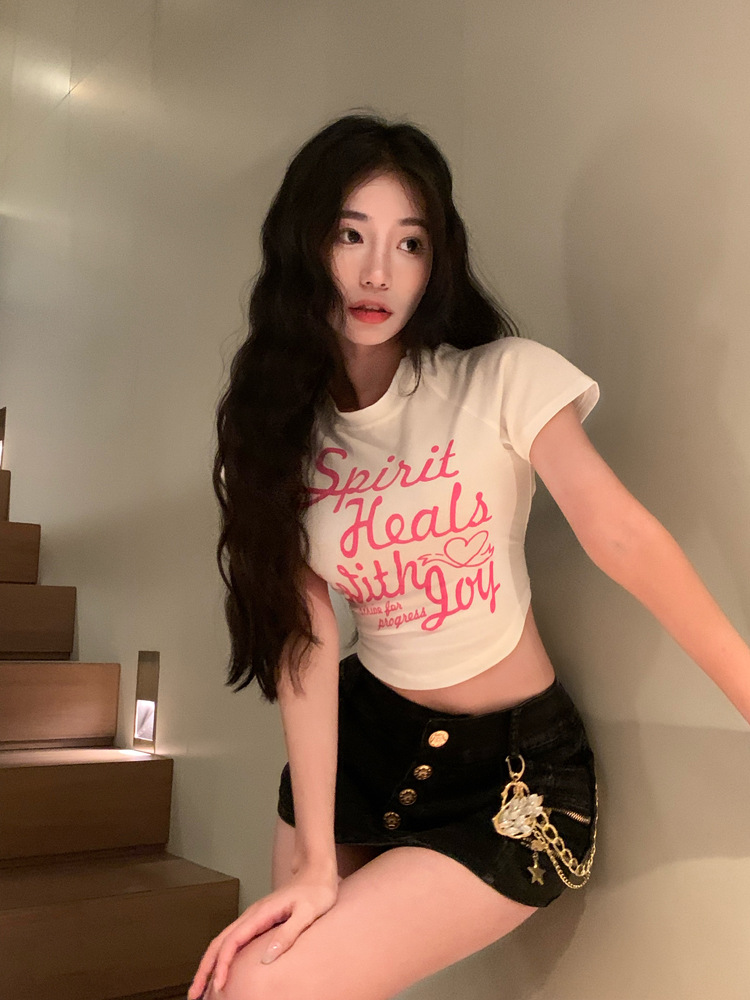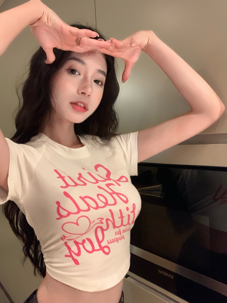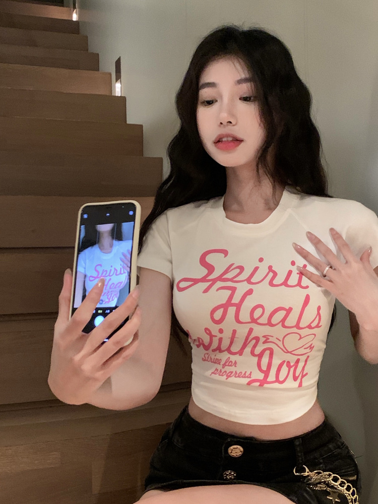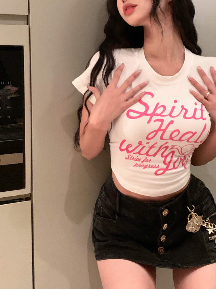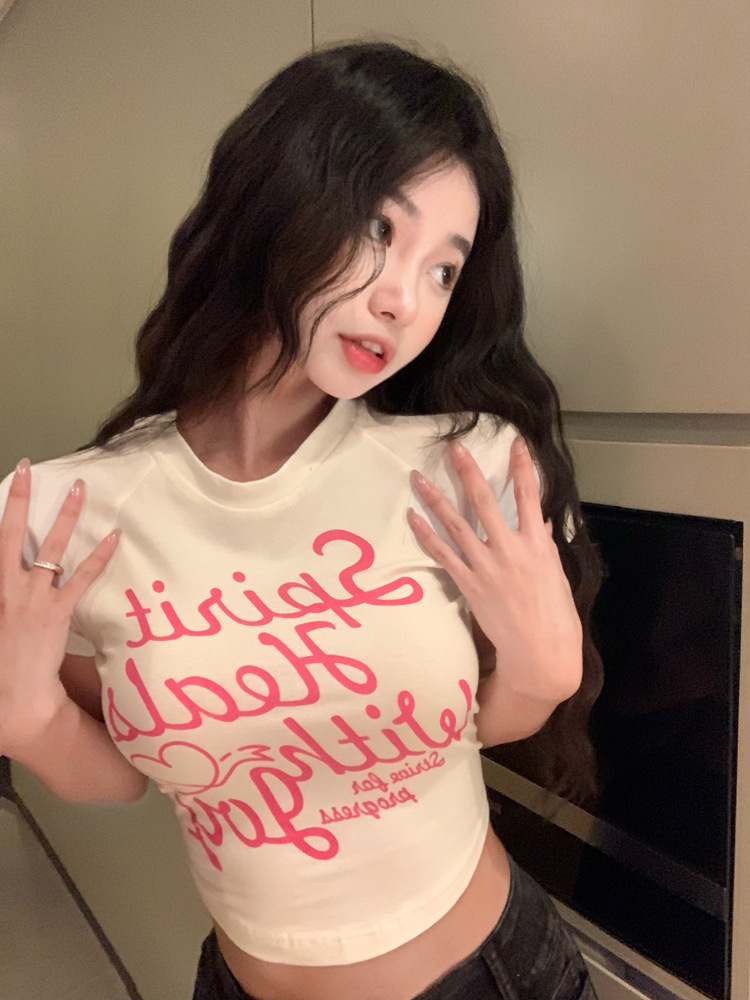 甜辣印花T恤女装ins潮夏季白色辣妹高腰修身性感短袖短款打底上衣