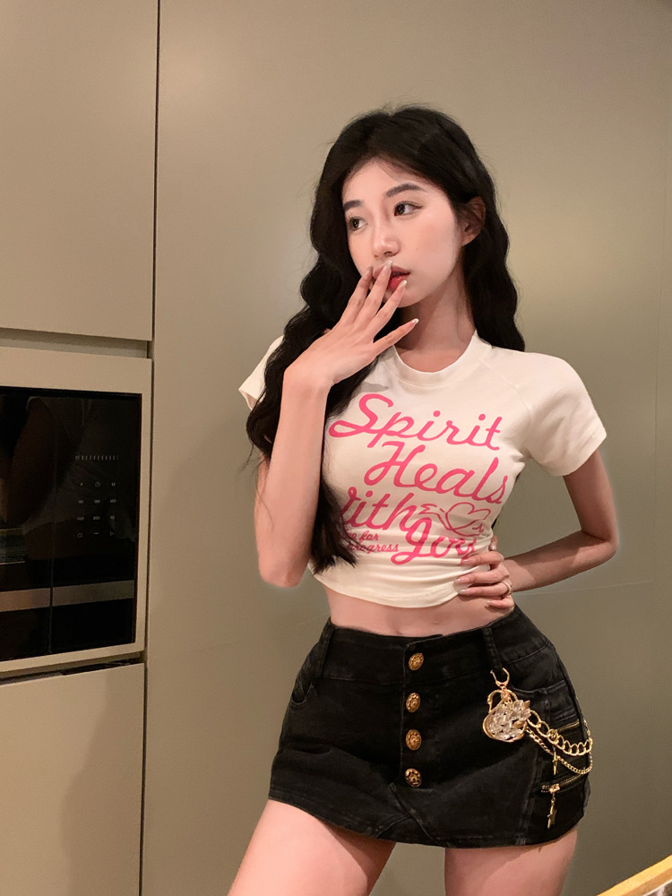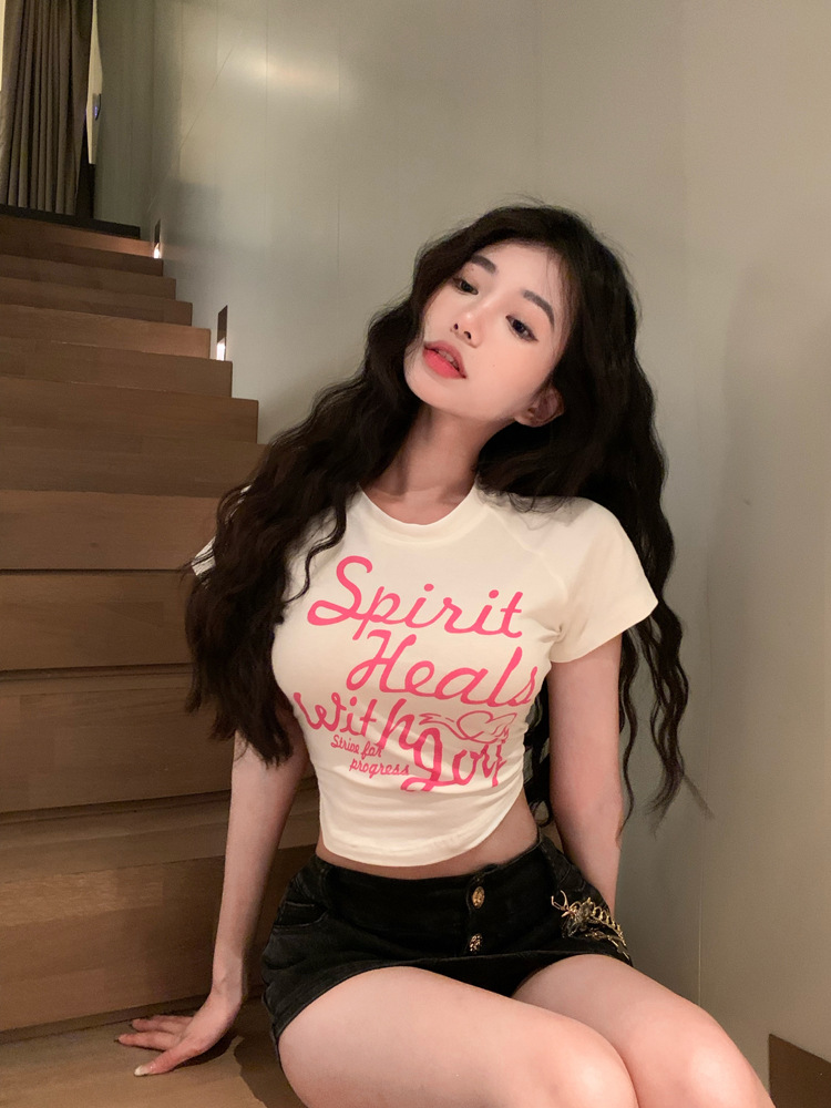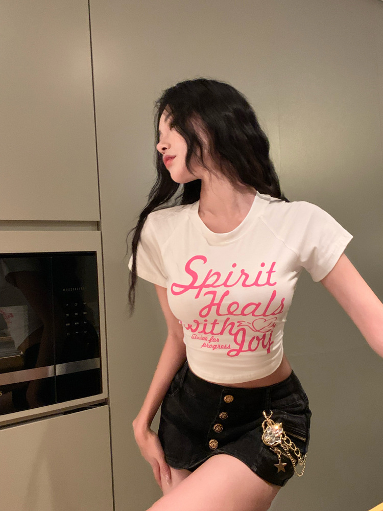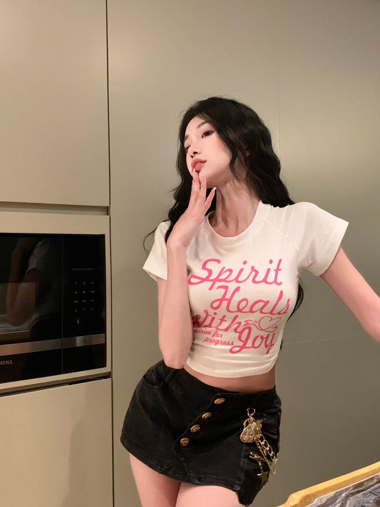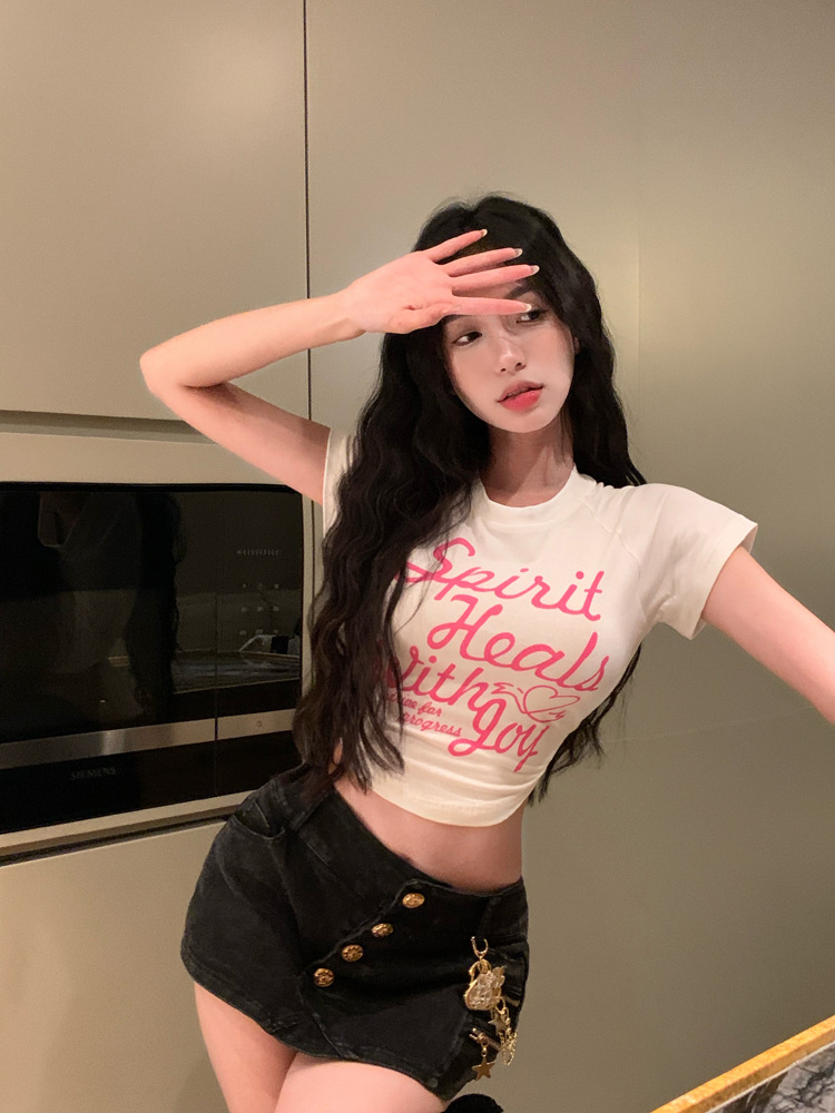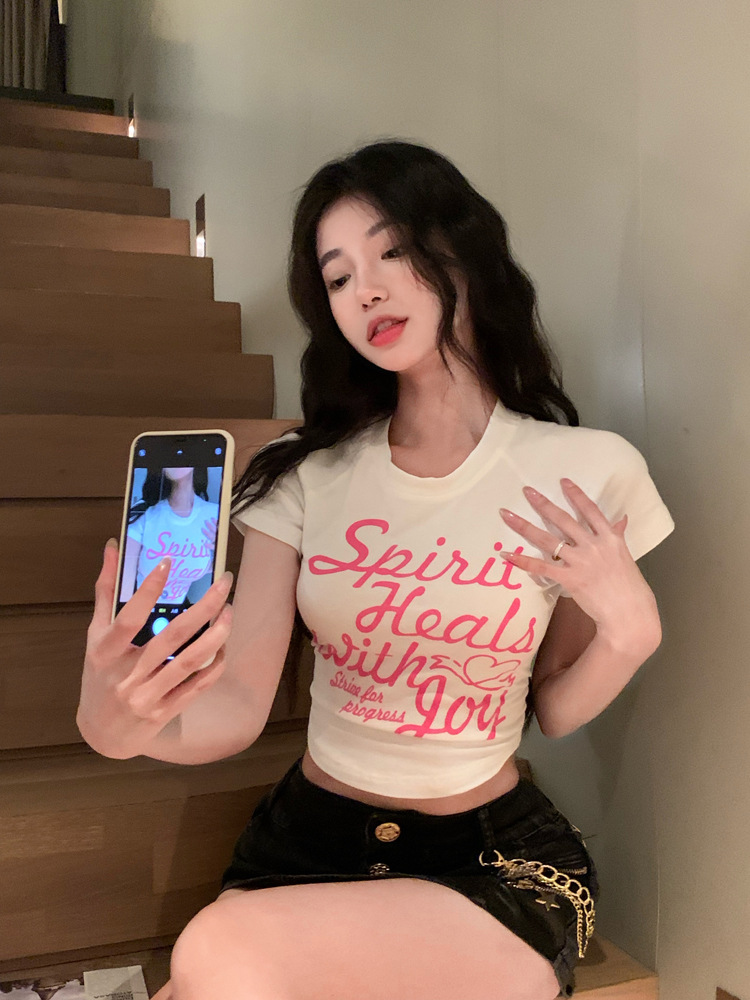 甜辣印花T恤女装ins潮夏季白色辣妹高腰修身性感短袖短款打底上衣