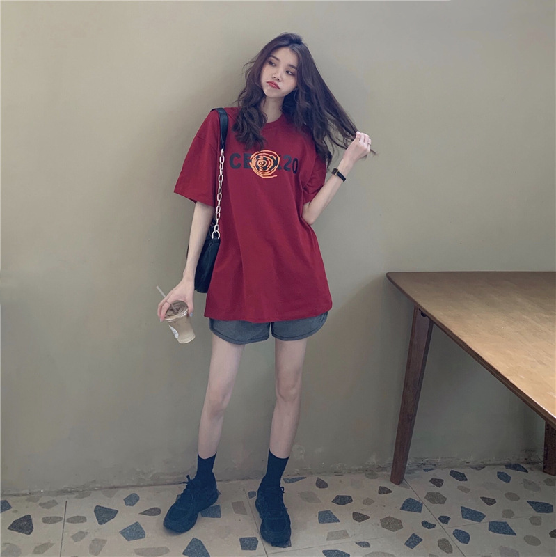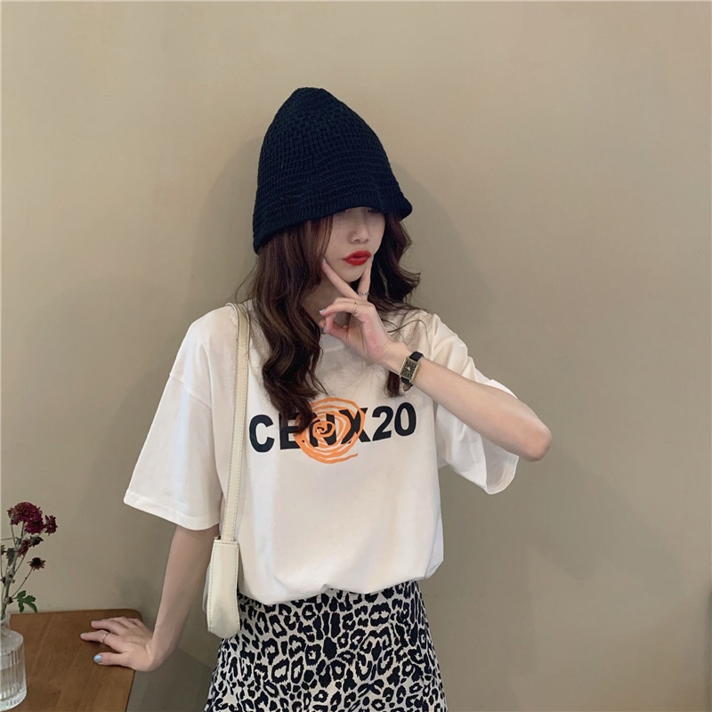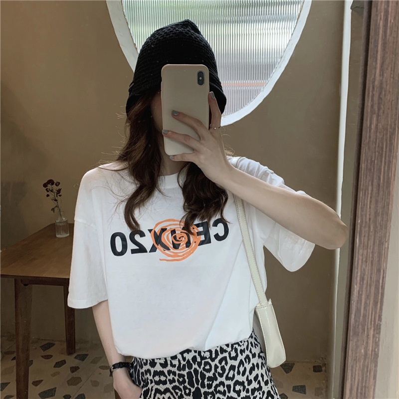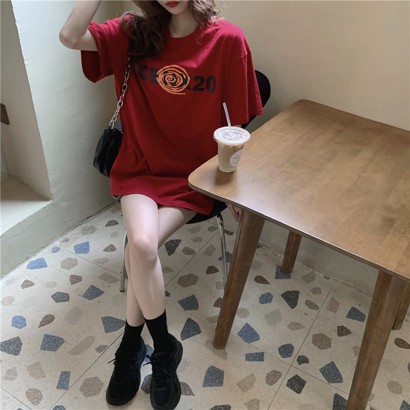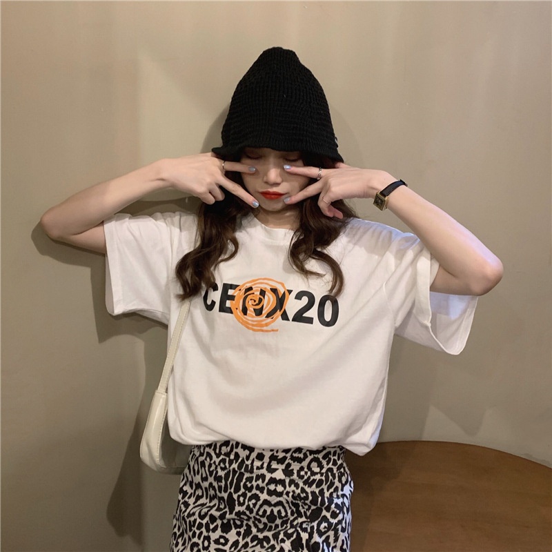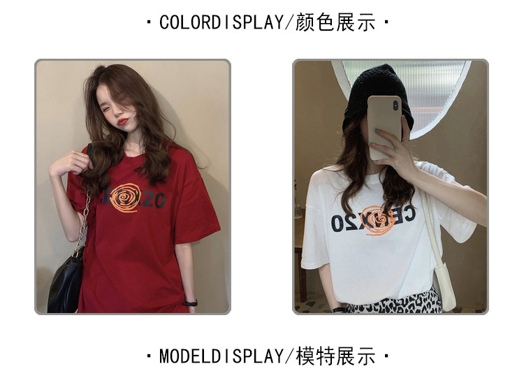 2025夏季韩版新款宽松圆领字母印花中长款休闲百搭短袖T恤女上衣