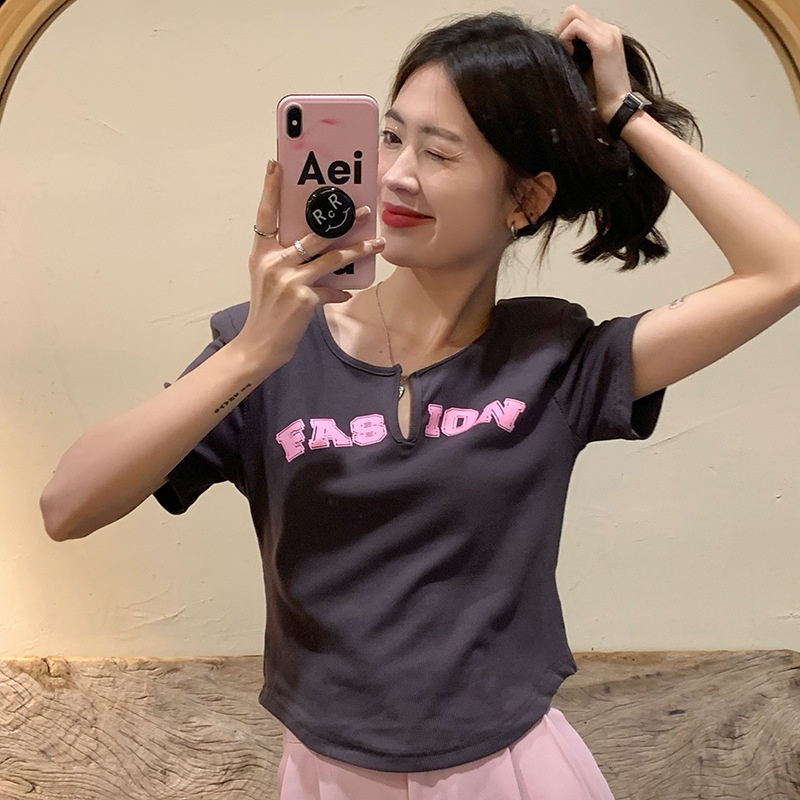 V领设计感甜辣学生短款修身上衣2025年夏季新款字母螺纹短袖t恤女