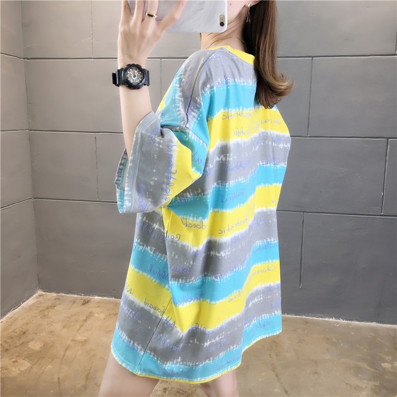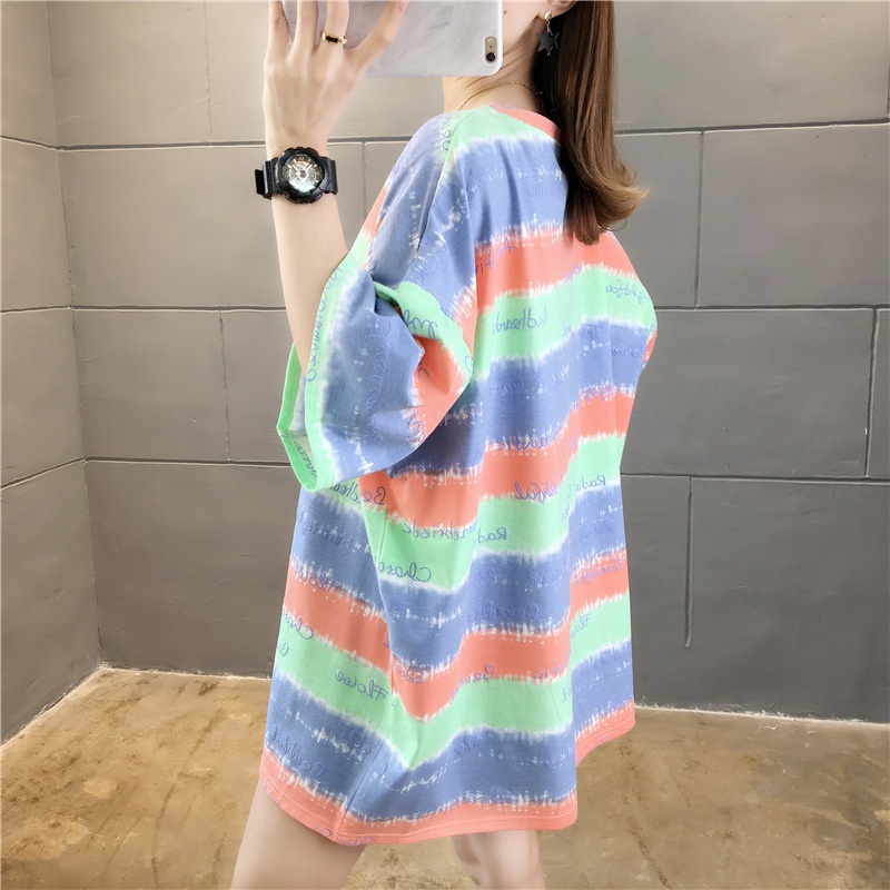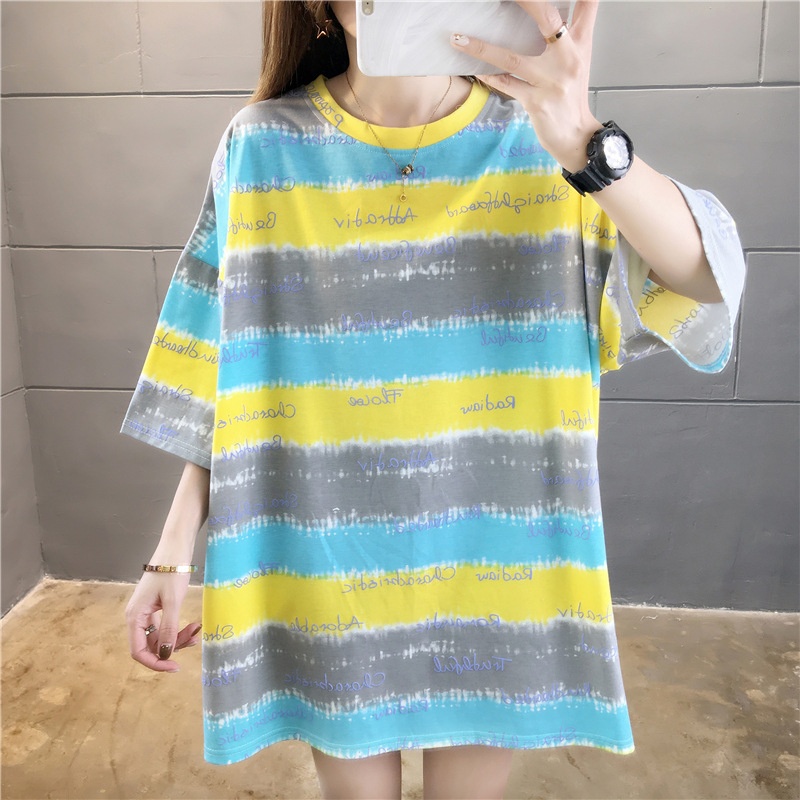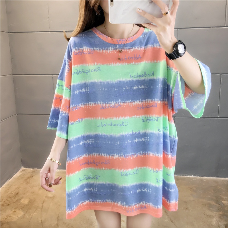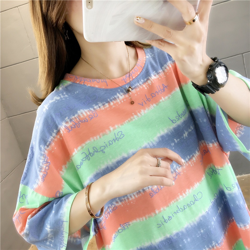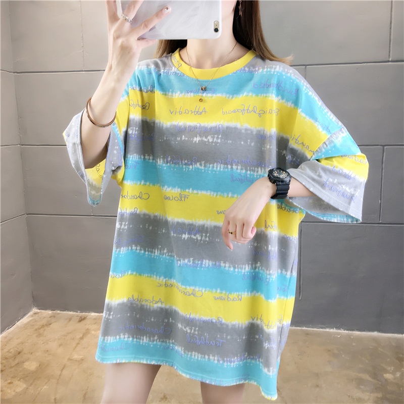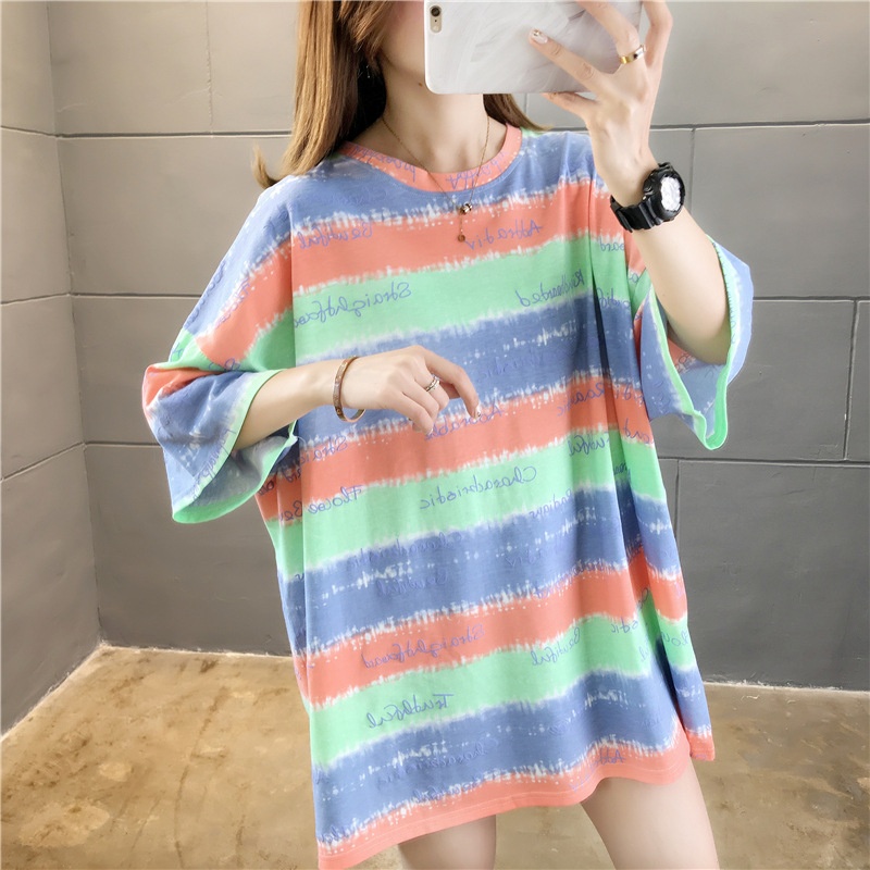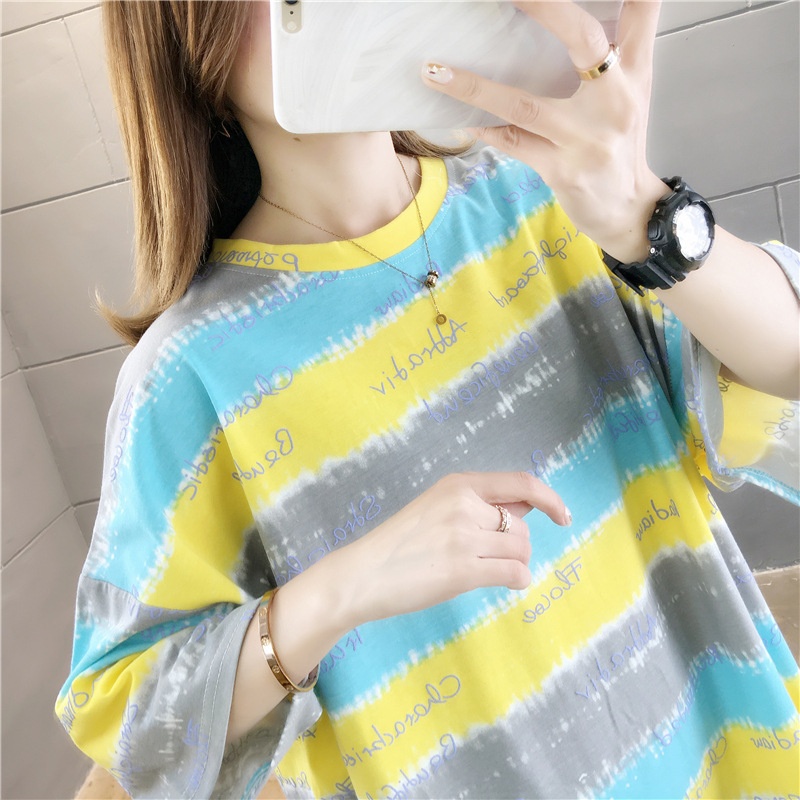 夏装2025新款韩版条纹字母宽松大码休闲短袖T恤女学生上衣服女潮