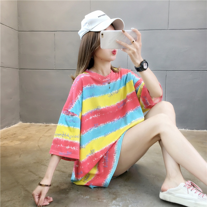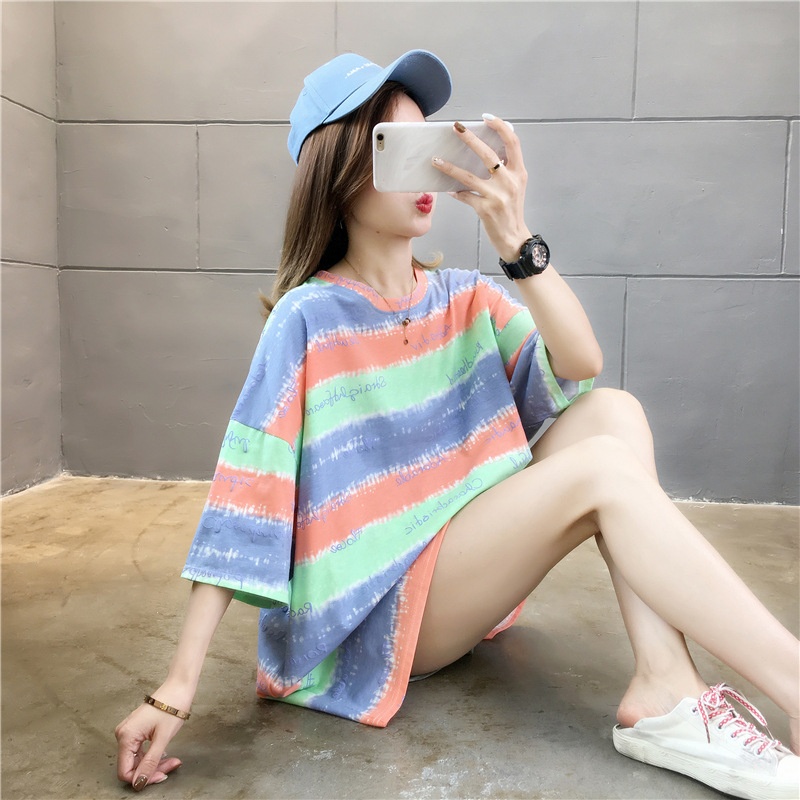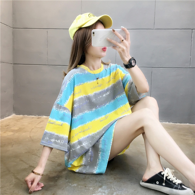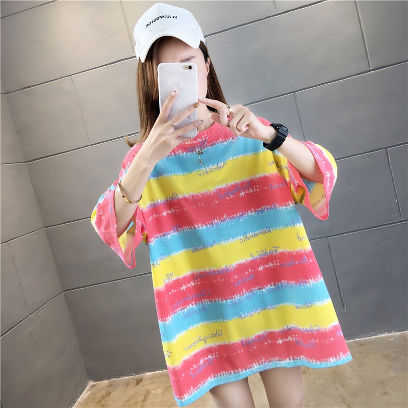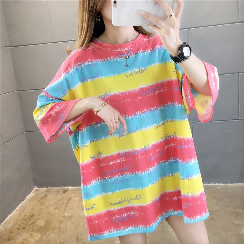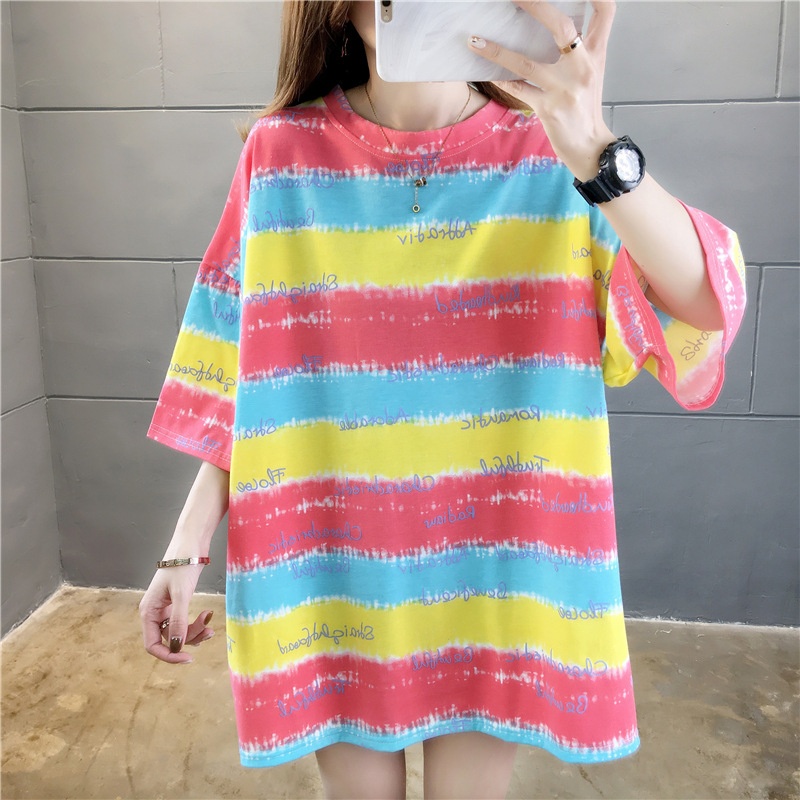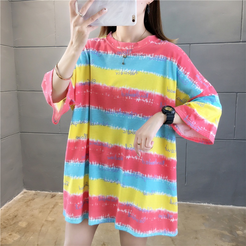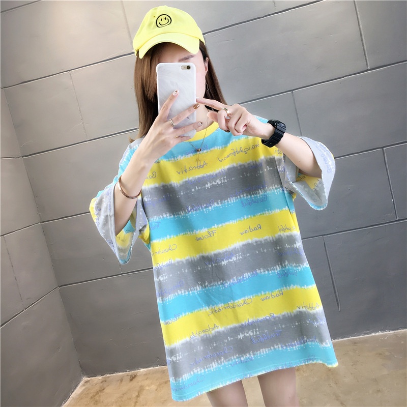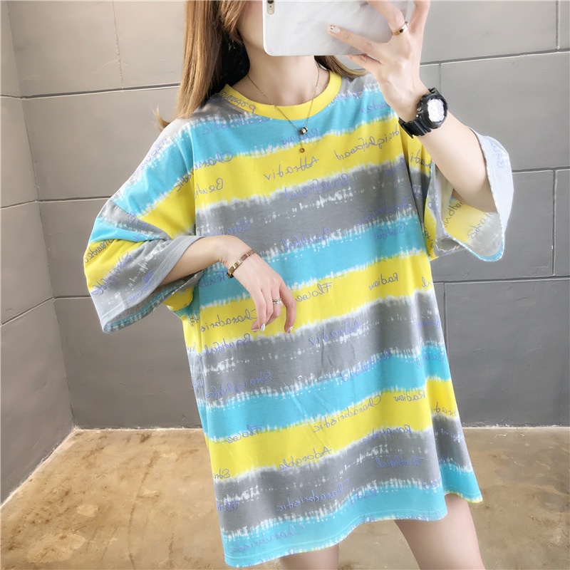 夏装2025新款韩版条纹字母宽松大码休闲短袖T恤女学生上衣服女潮
