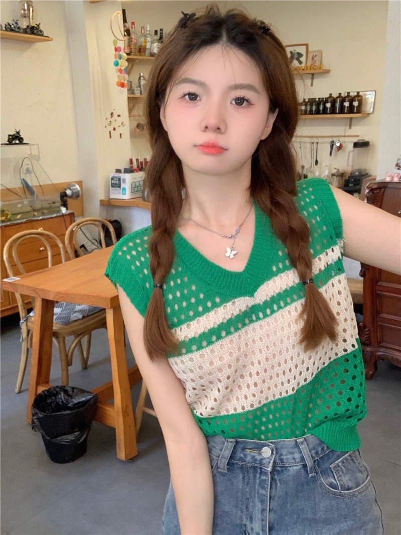 条纹镂空V领背心马甲女夏季韩版宽松外搭叠穿坎肩无袖甜辣上衣女