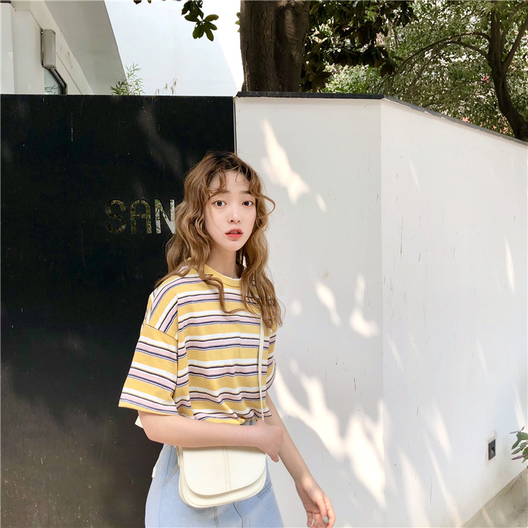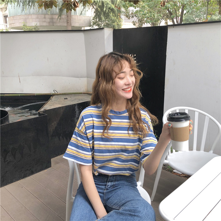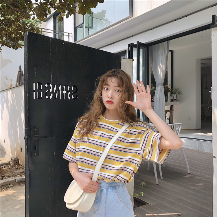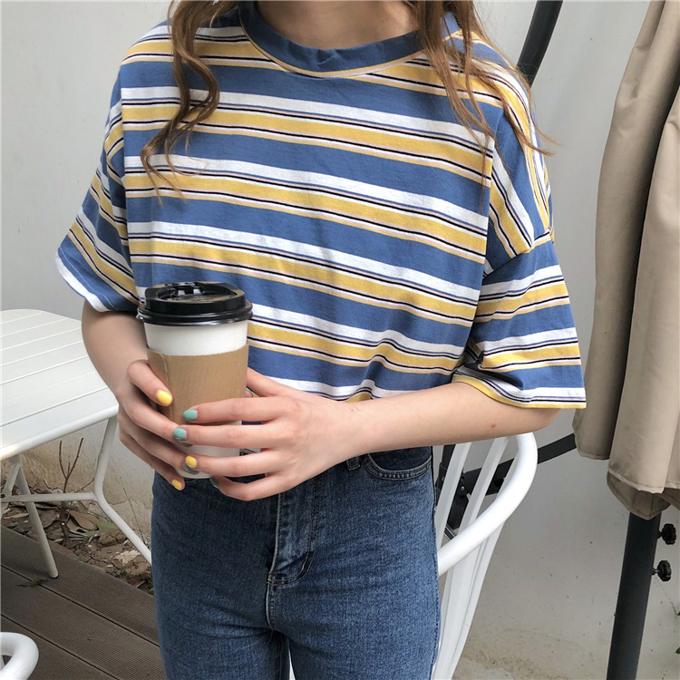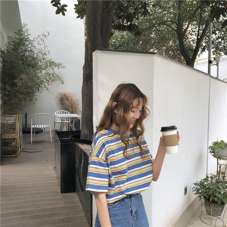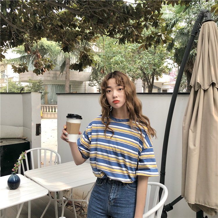 2025年夏季新款韩版宽松条纹休闲T恤女短袖学生上衣女装外贸批发
