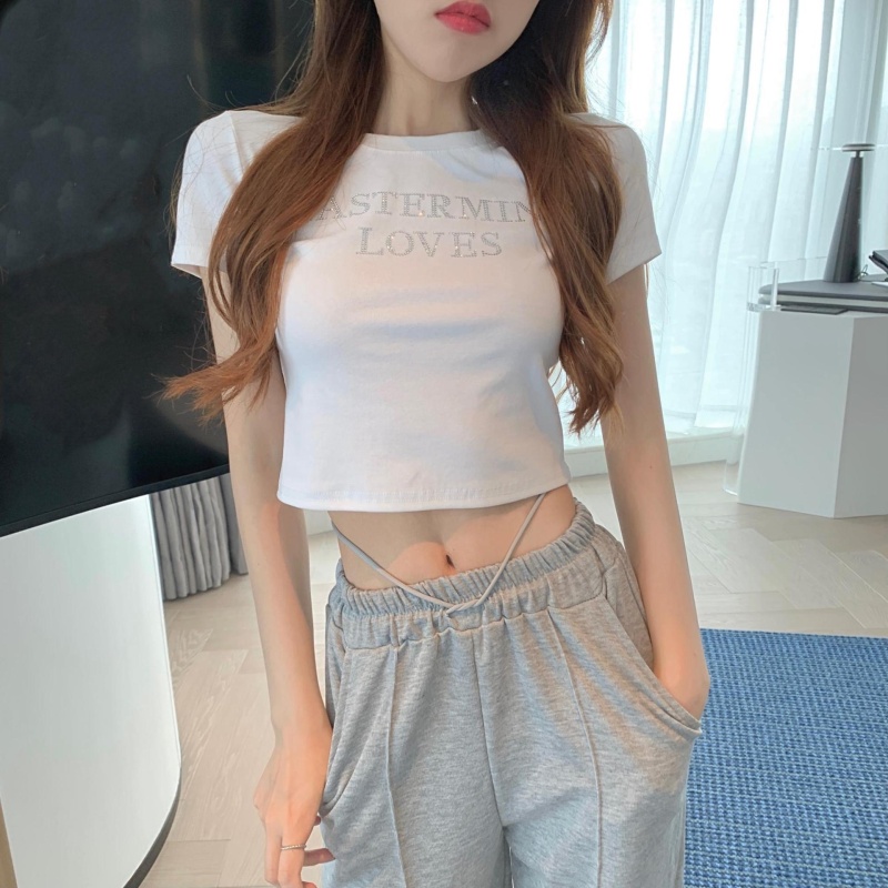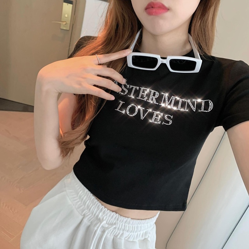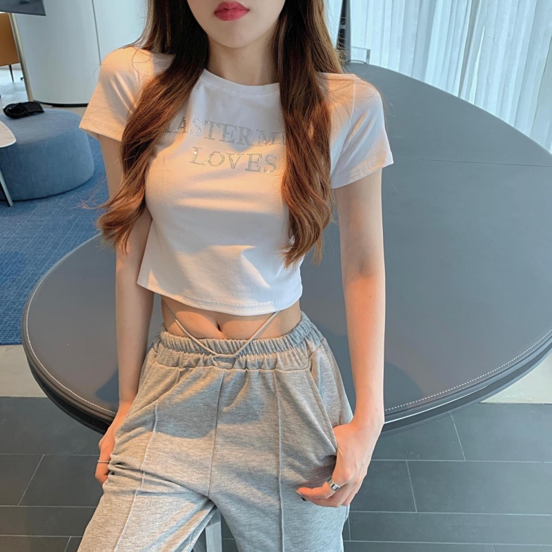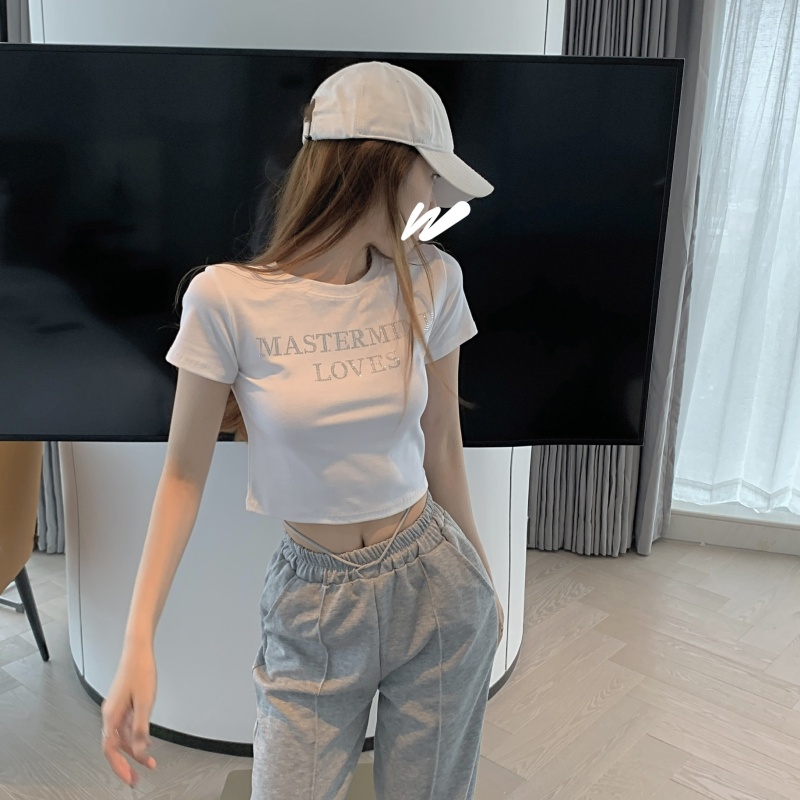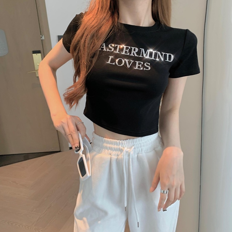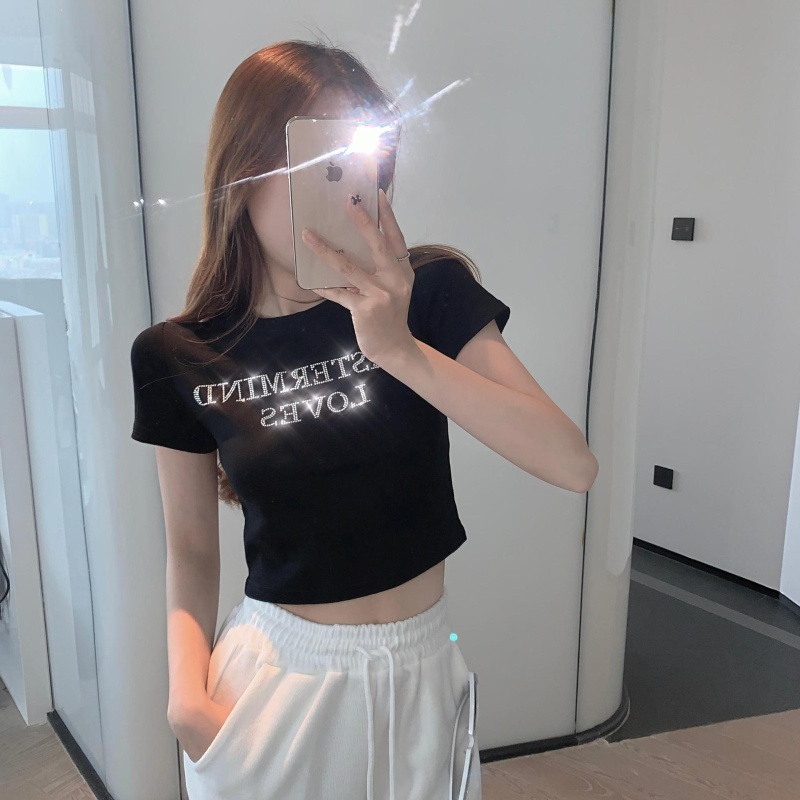 网红打底衫高腰露脐短款上衣女烫钻字母修身夏季短袖T恤女ins潮