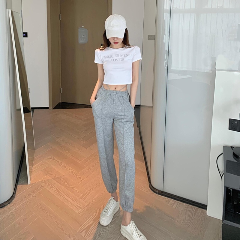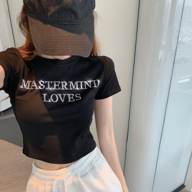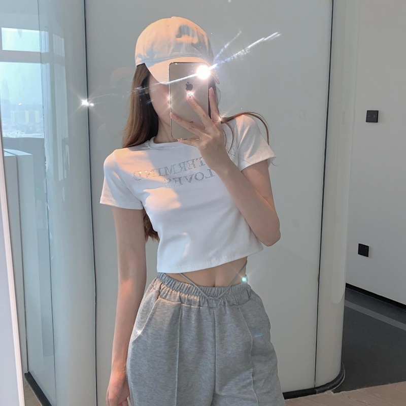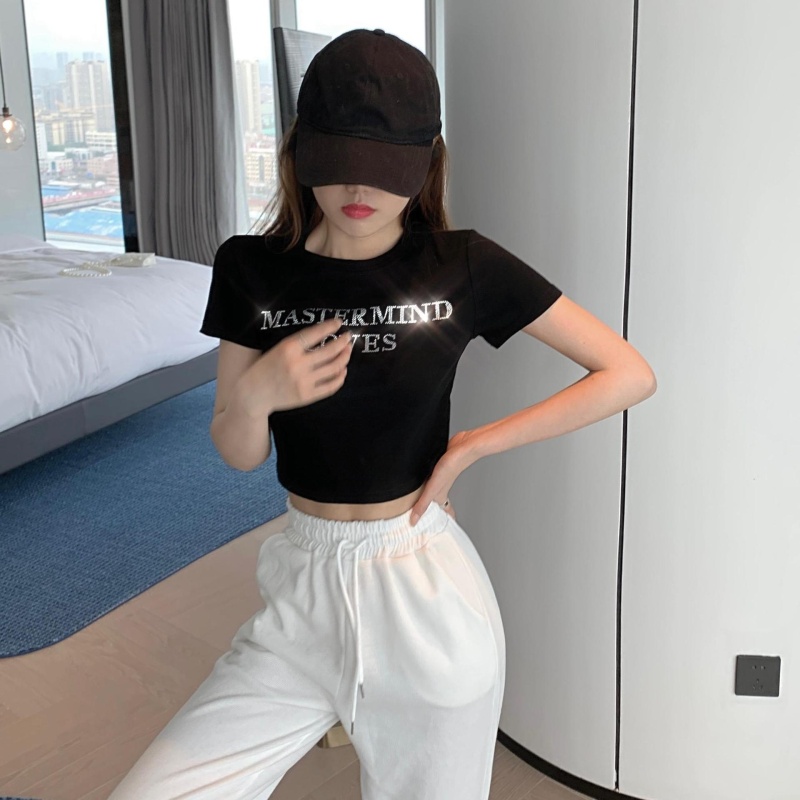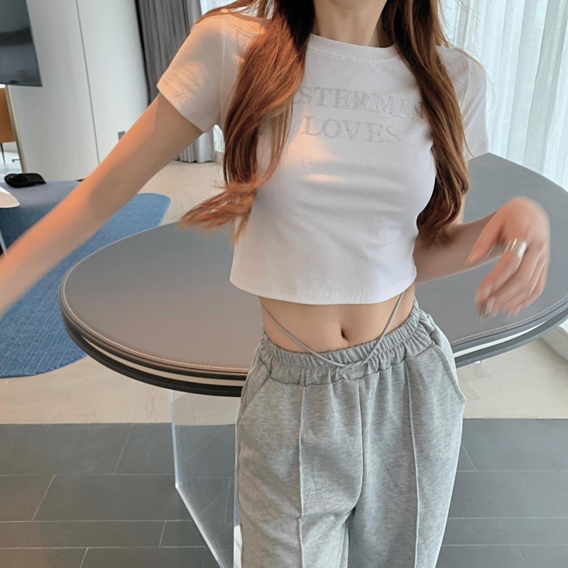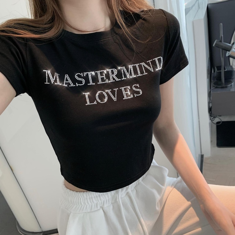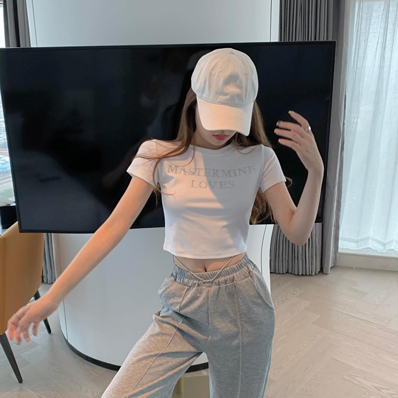网红打底衫高腰露脐短款上衣女烫钻字母修身夏季短袖T恤女ins潮
