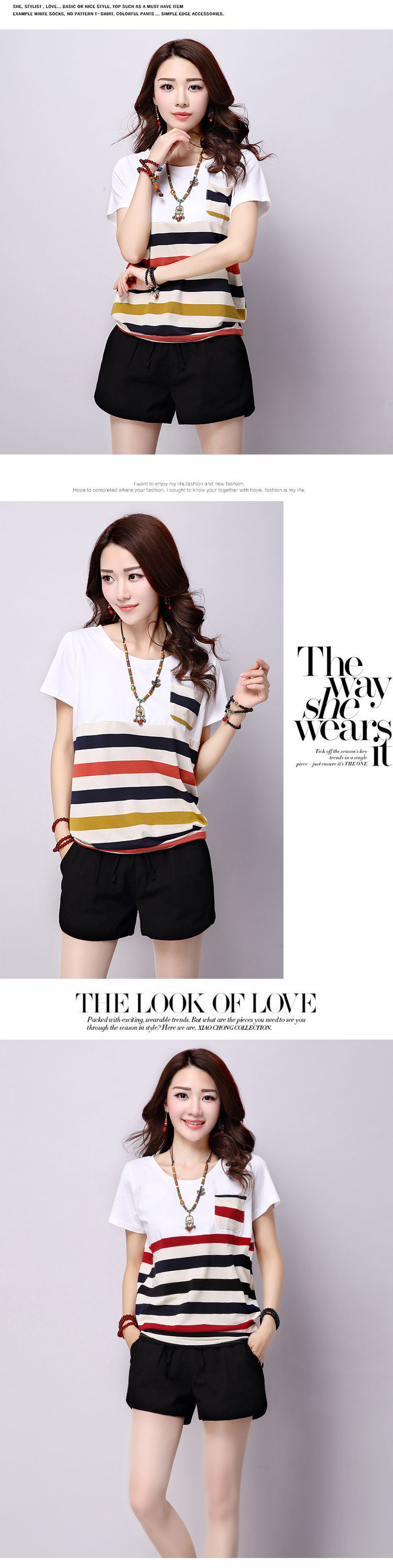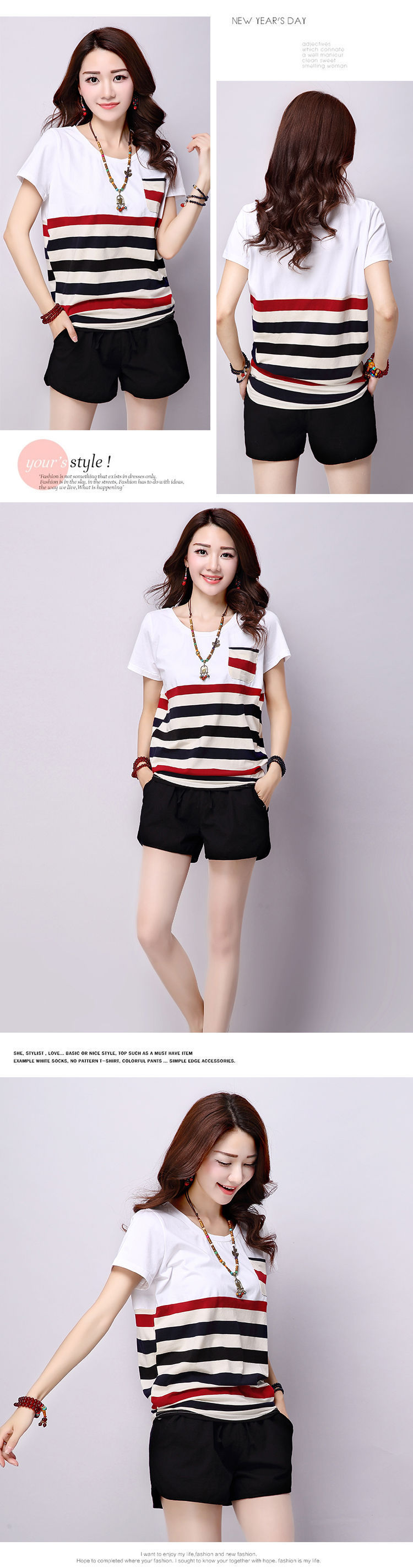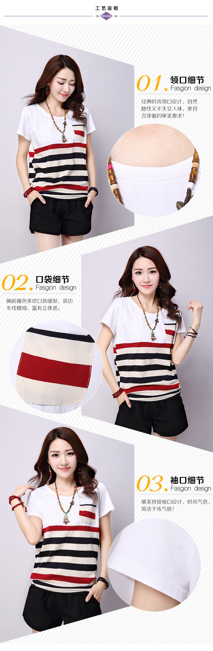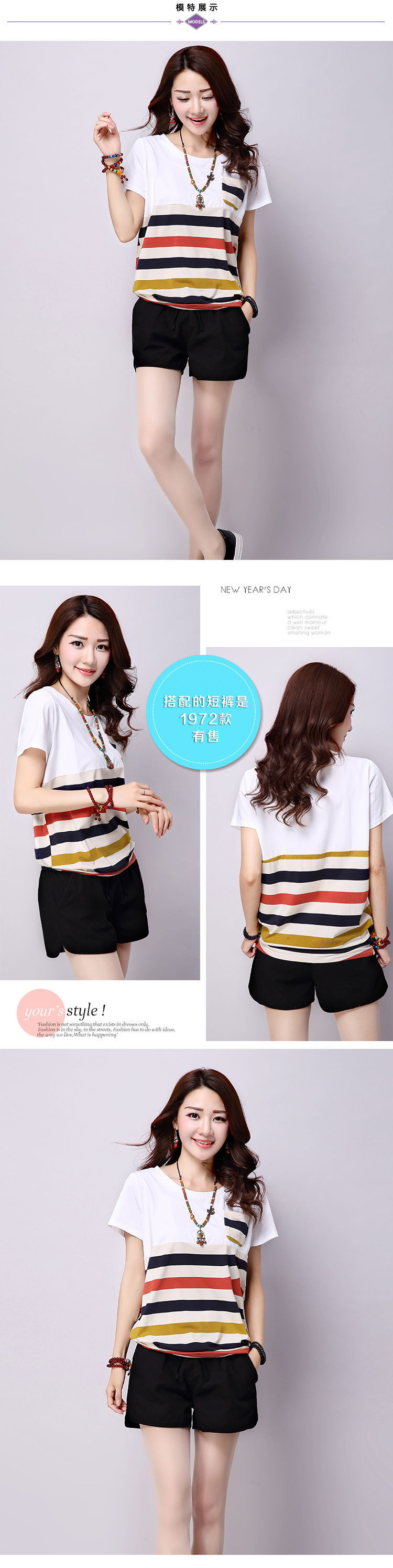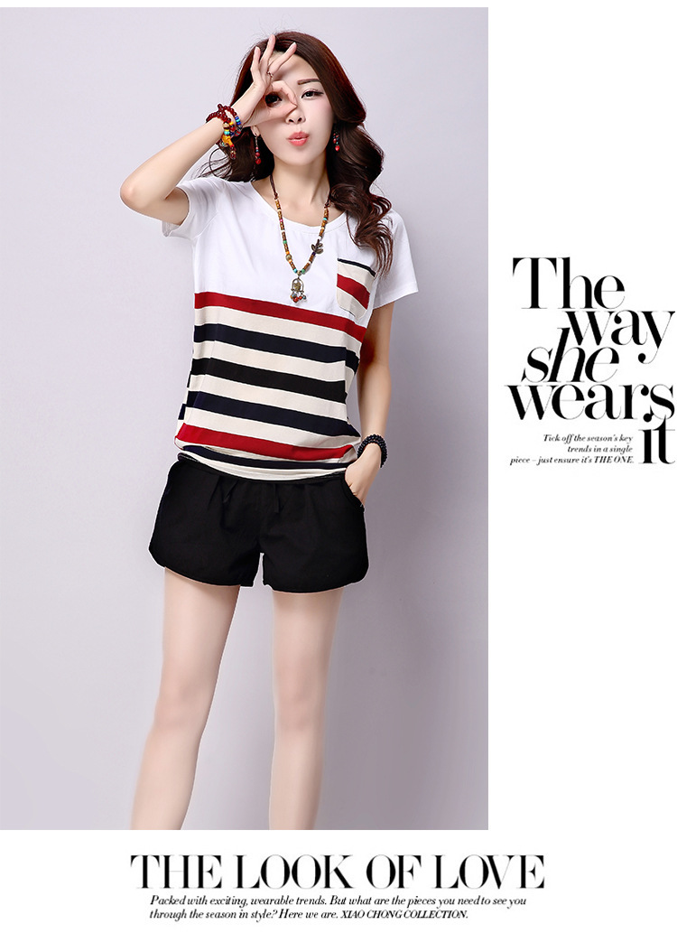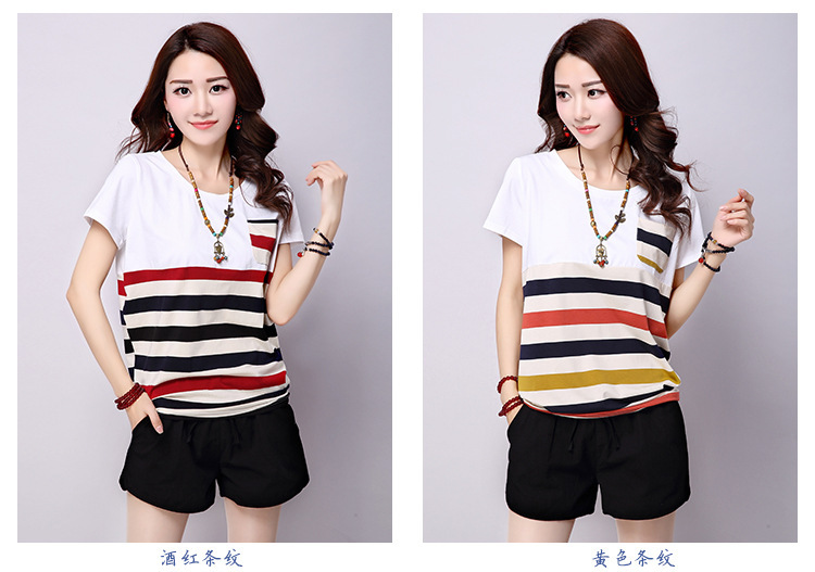 2025夏装新款条纹拼接短袖T恤女上衣宽松大码女装圆领学生t恤衫潮