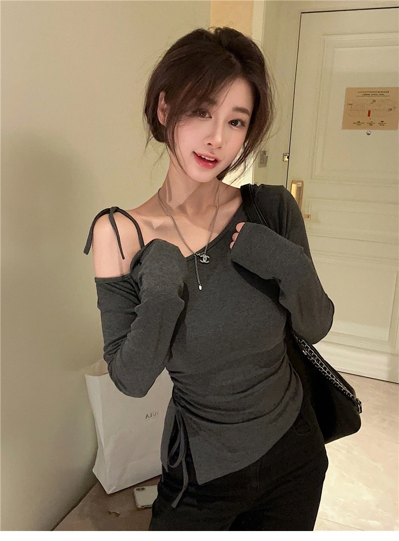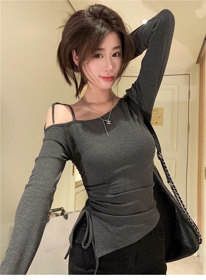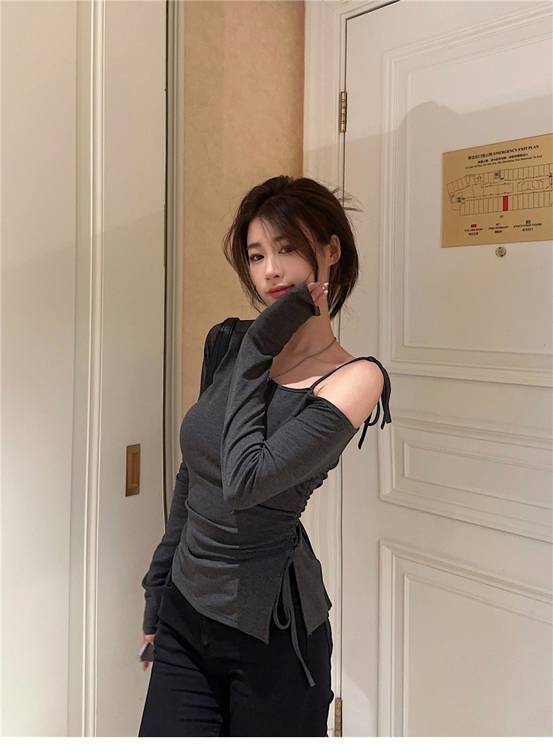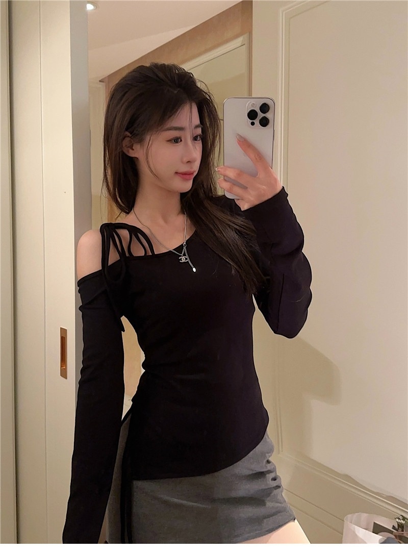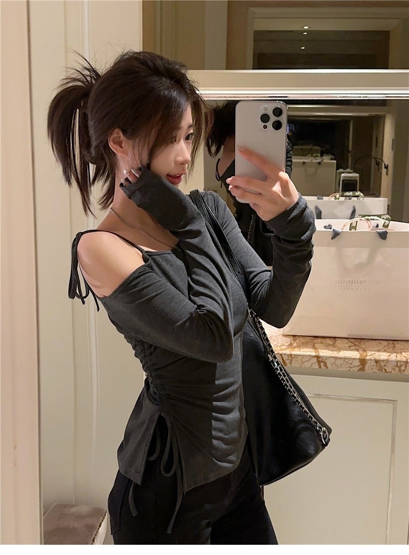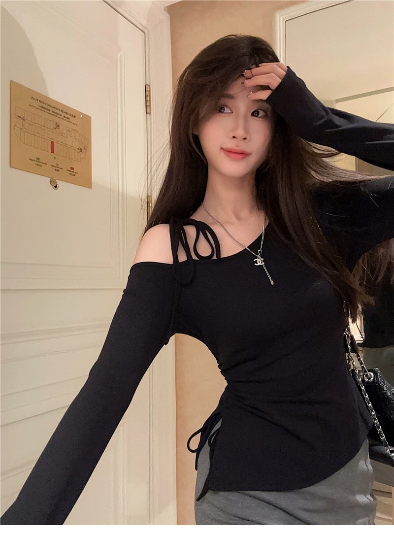 甜辣妹性感露肩长袖T恤女2025早秋新款不规则系带开叉设计感上衣