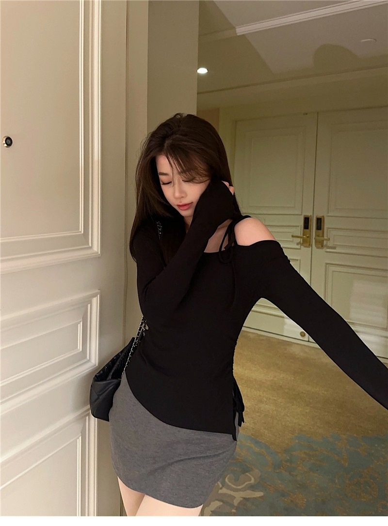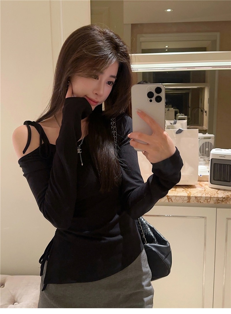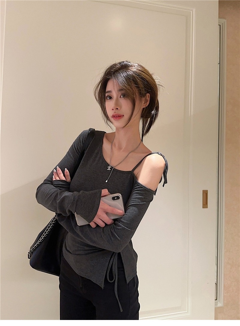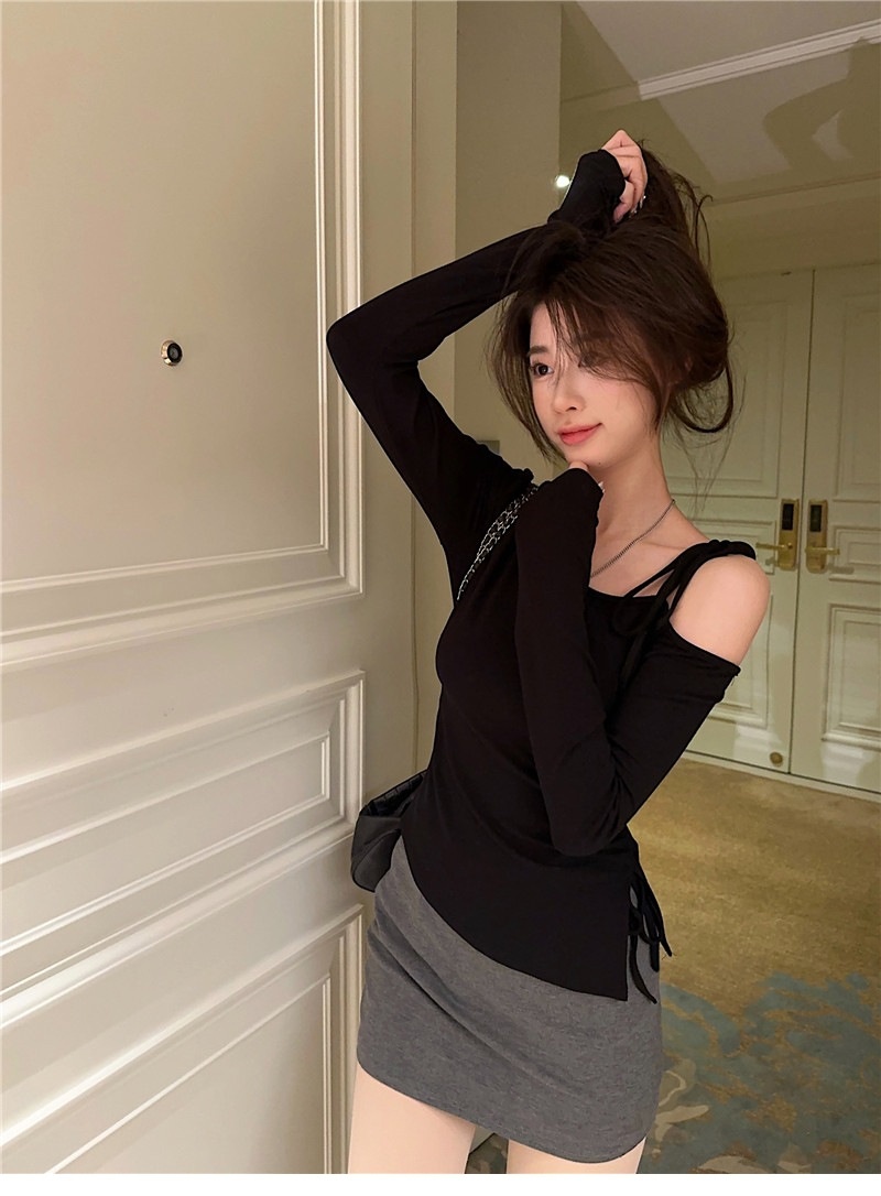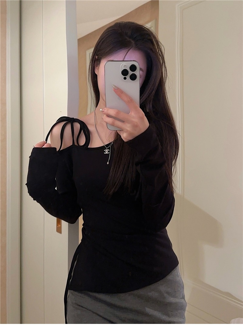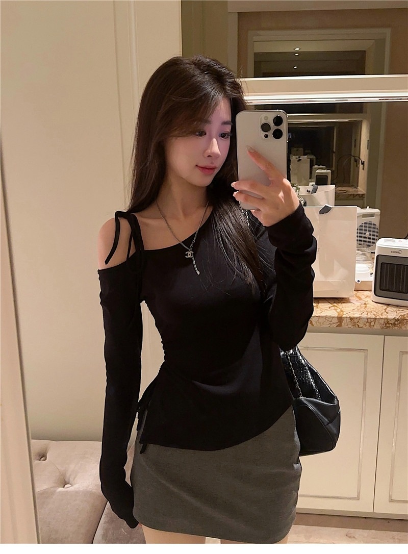 甜辣妹性感露肩长袖T恤女2025早秋新款不规则系带开叉设计感上衣