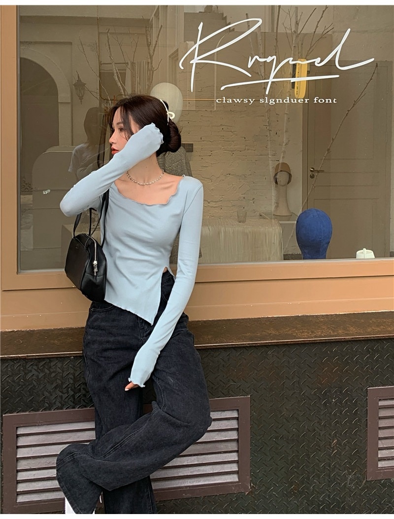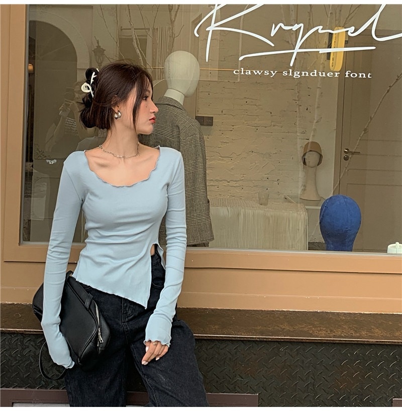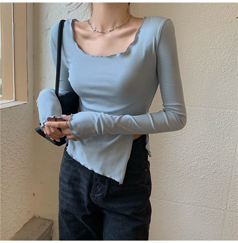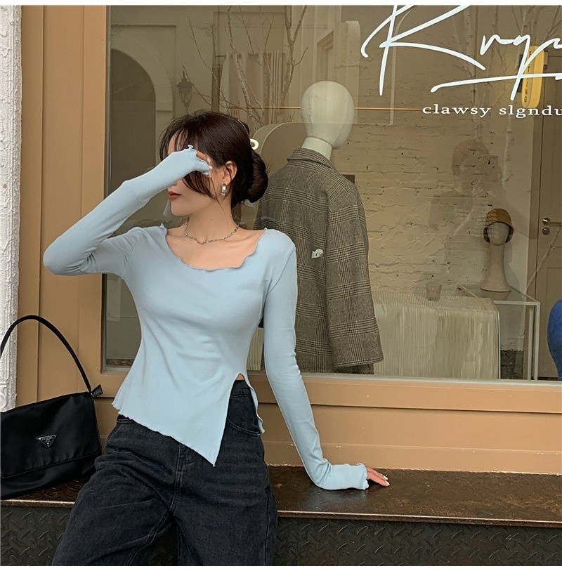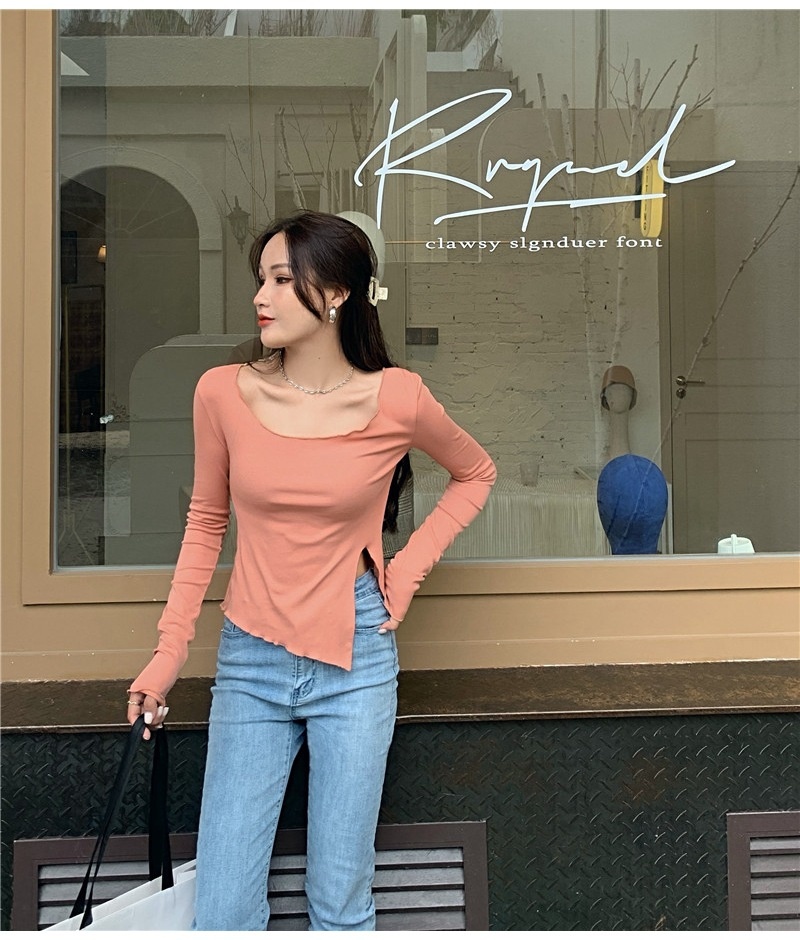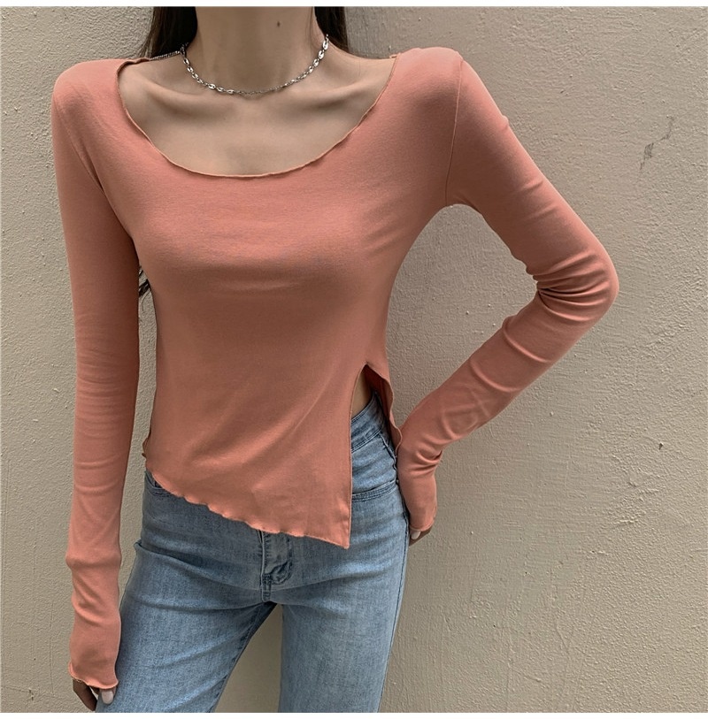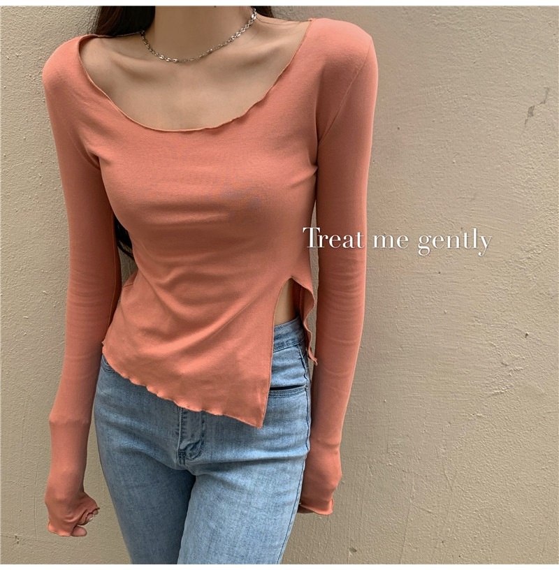 纯色T恤女短款不规则修身开叉长袖内搭打底衫2025秋季修身上衣潮