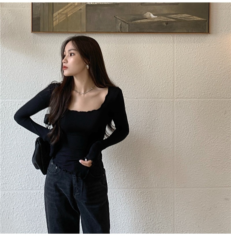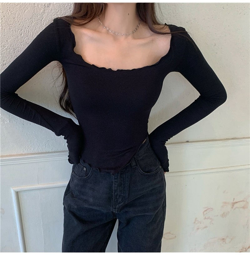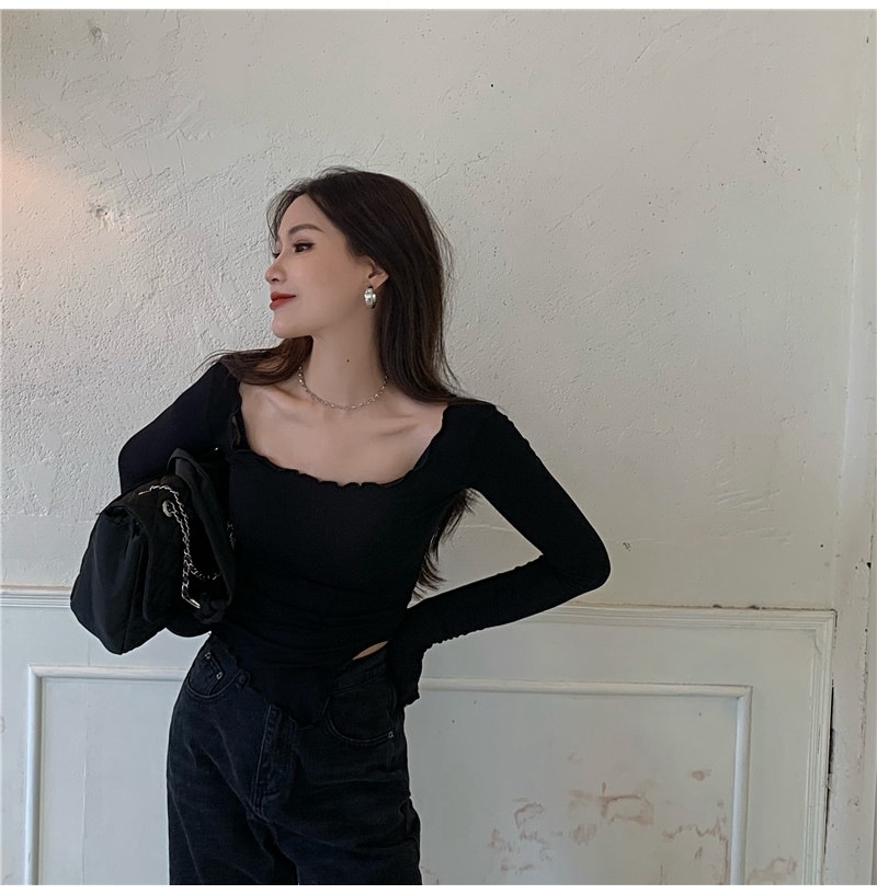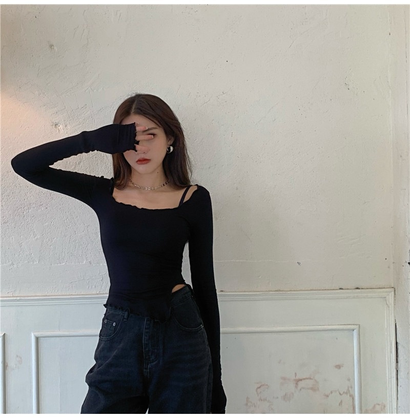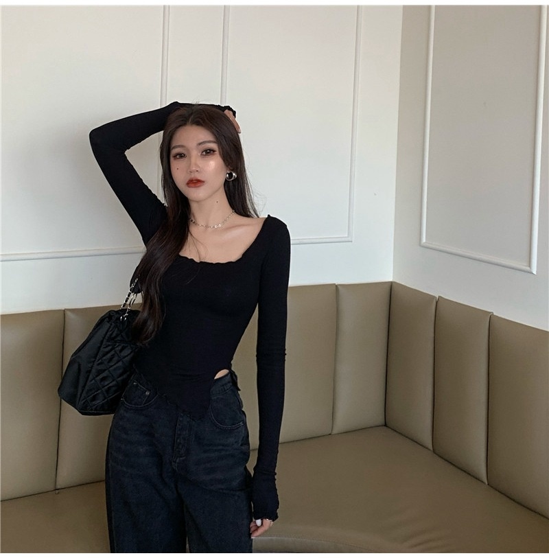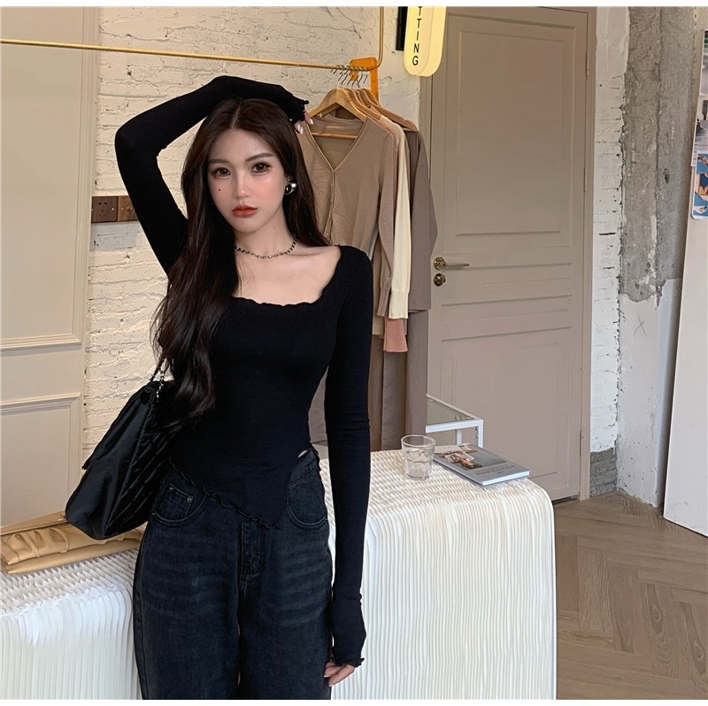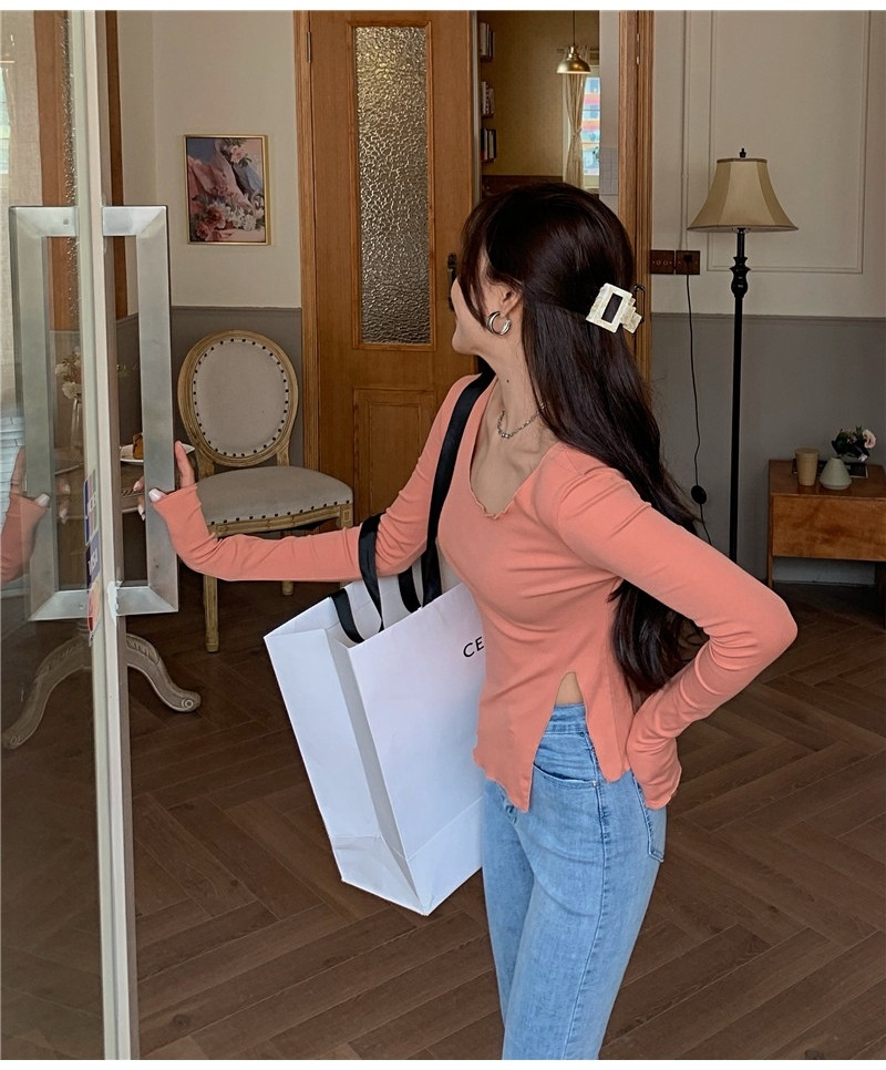 纯色T恤女短款不规则修身开叉长袖内搭打底衫2025秋季修身上衣潮