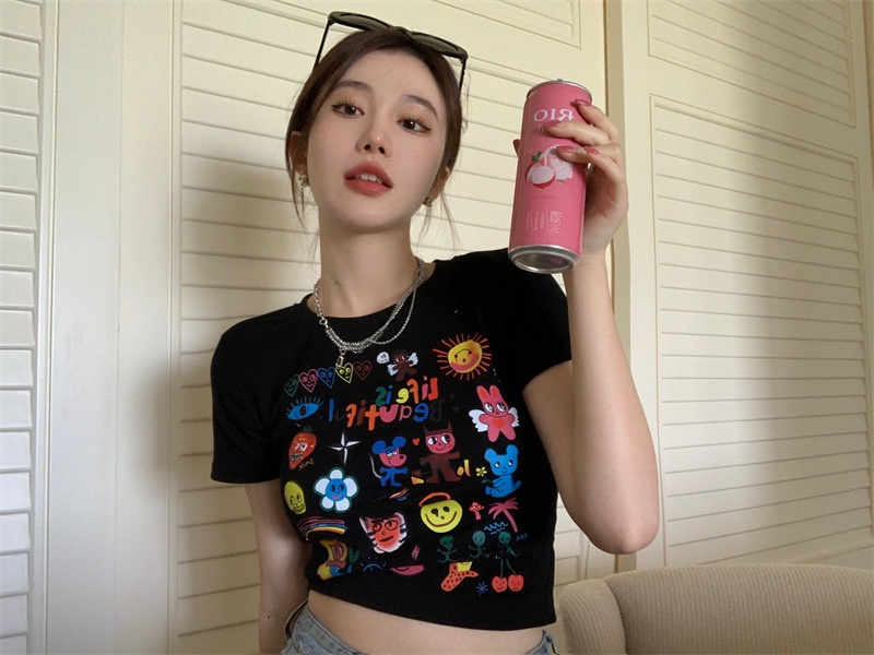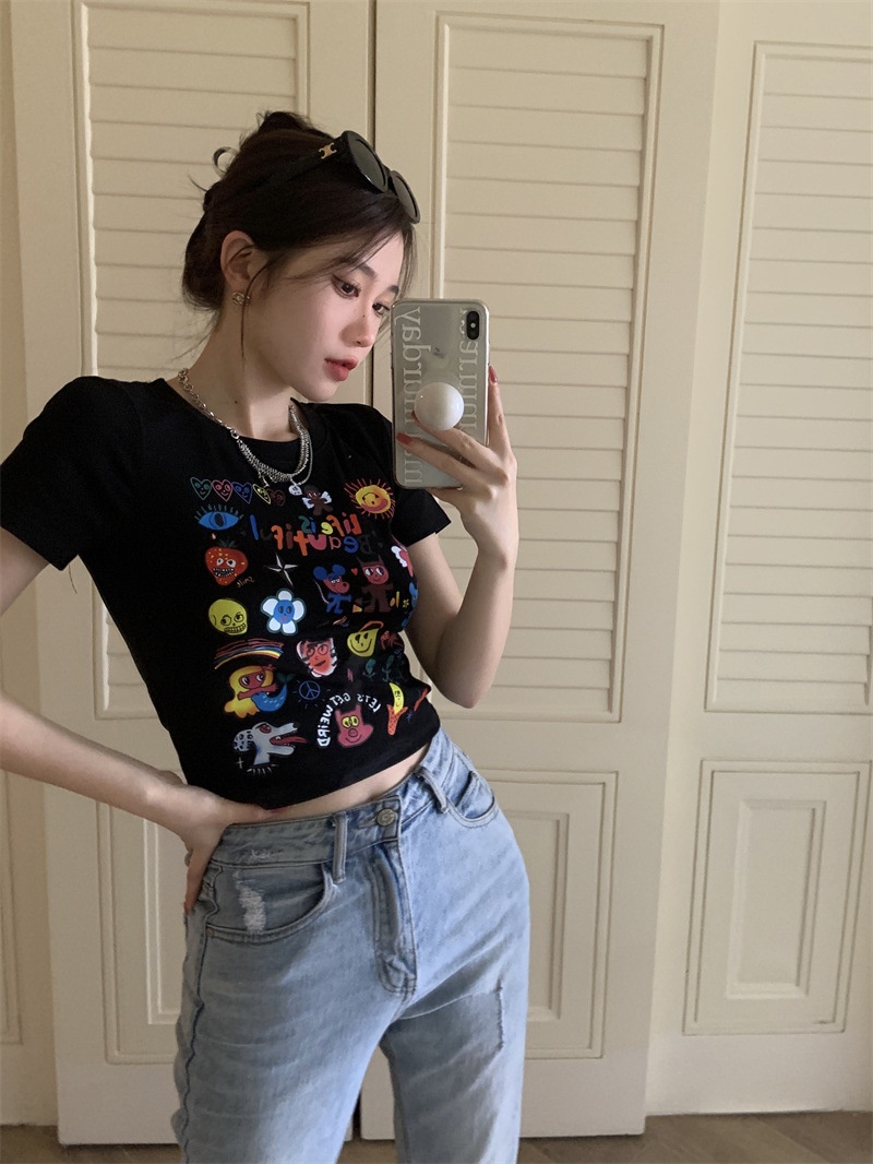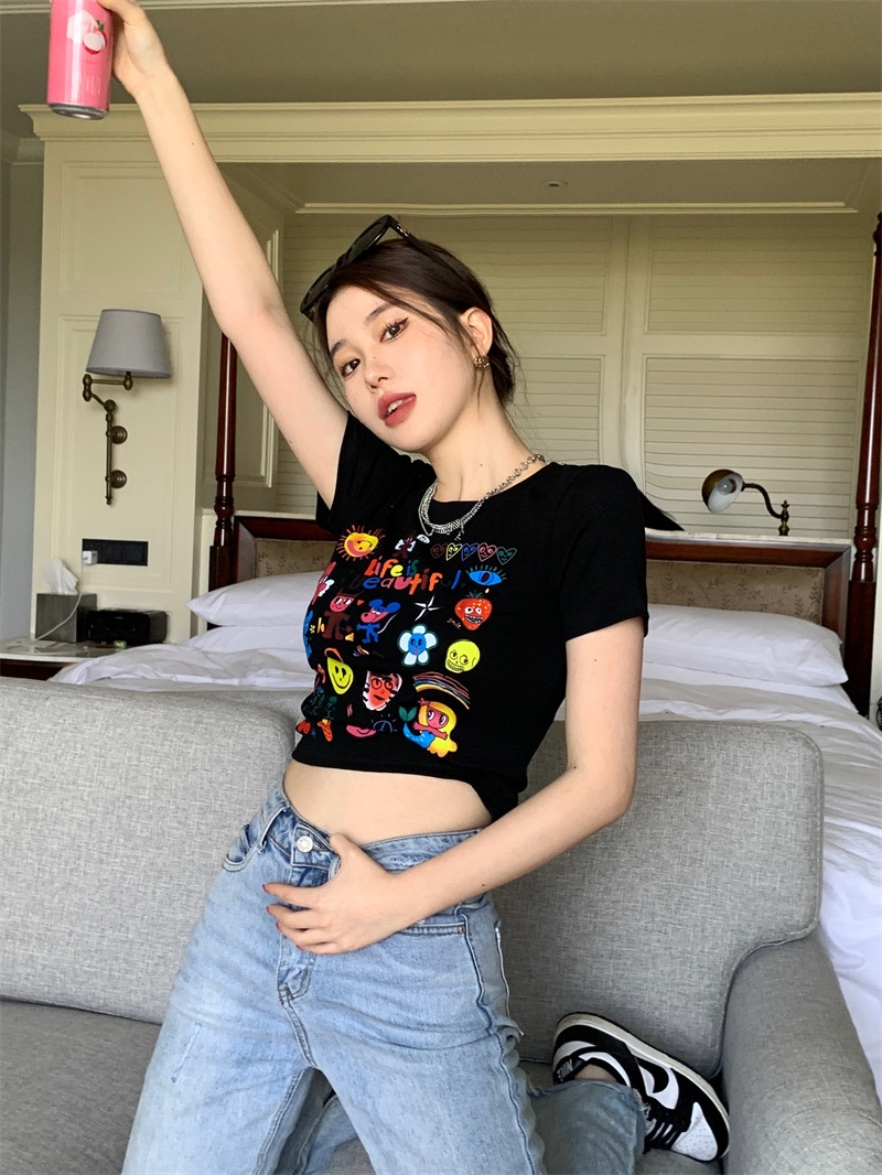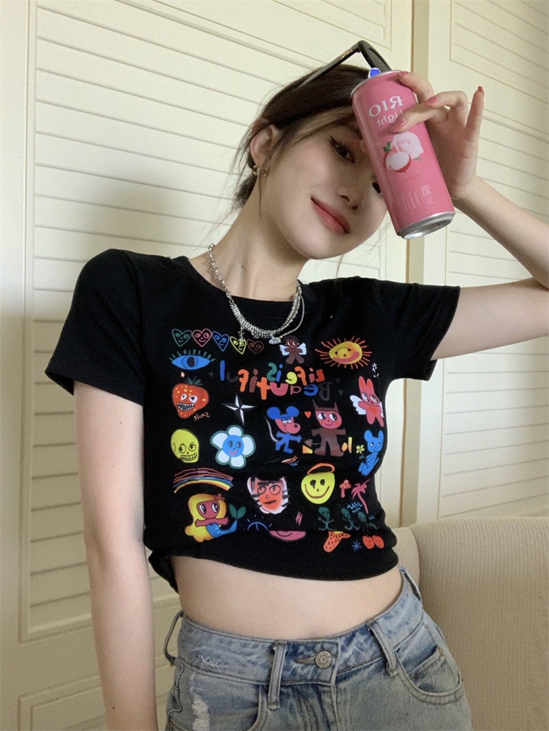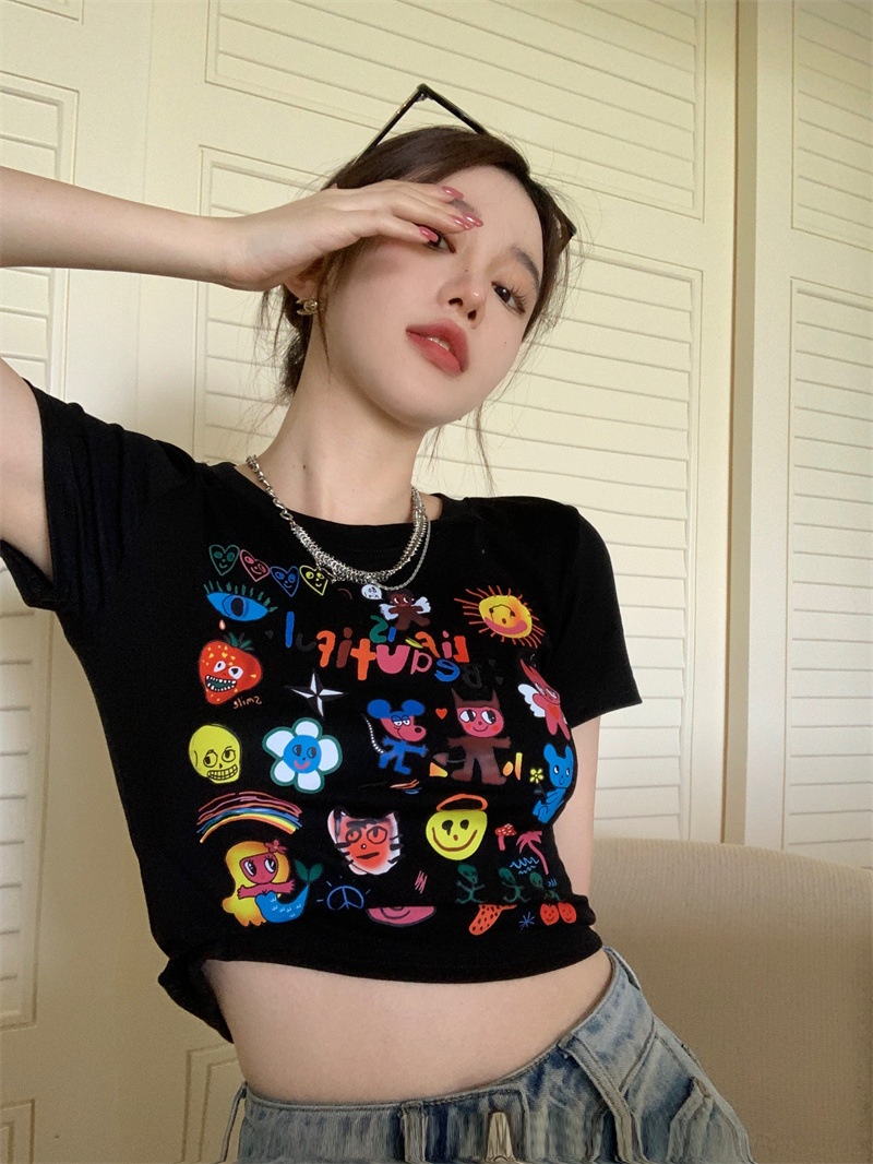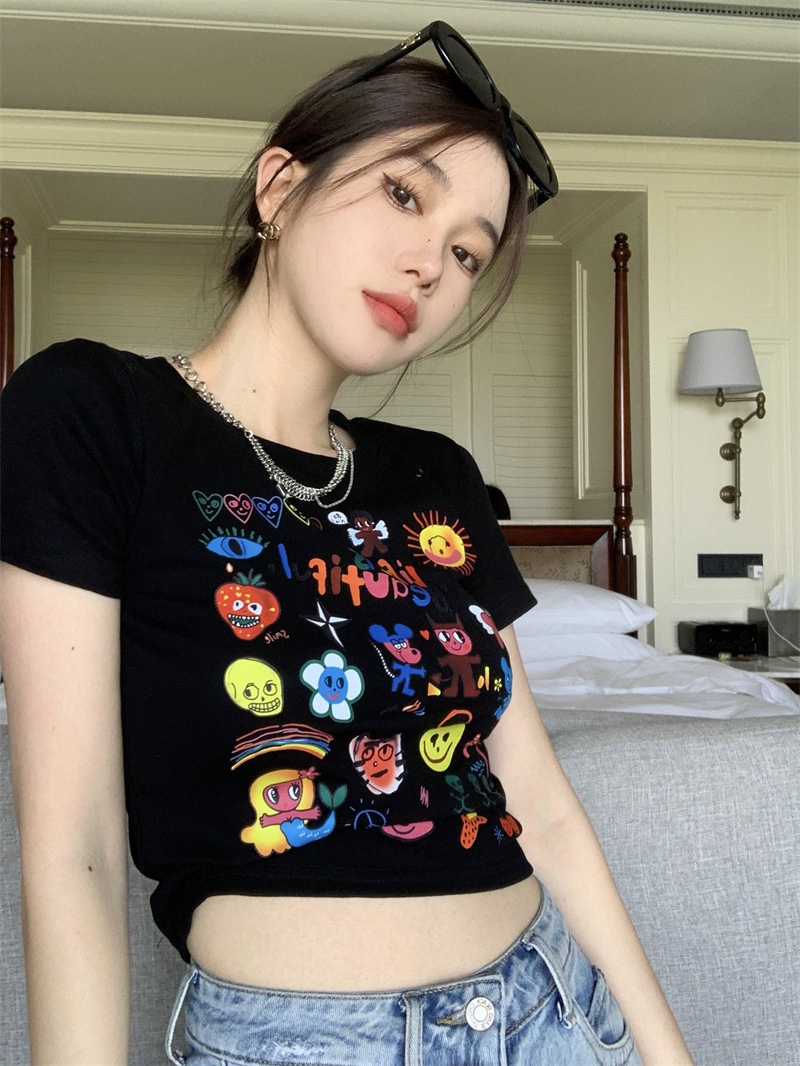 辣妹黑色短袖T恤女夏装2025年新款复古修身显瘦短款印花上衣ins潮