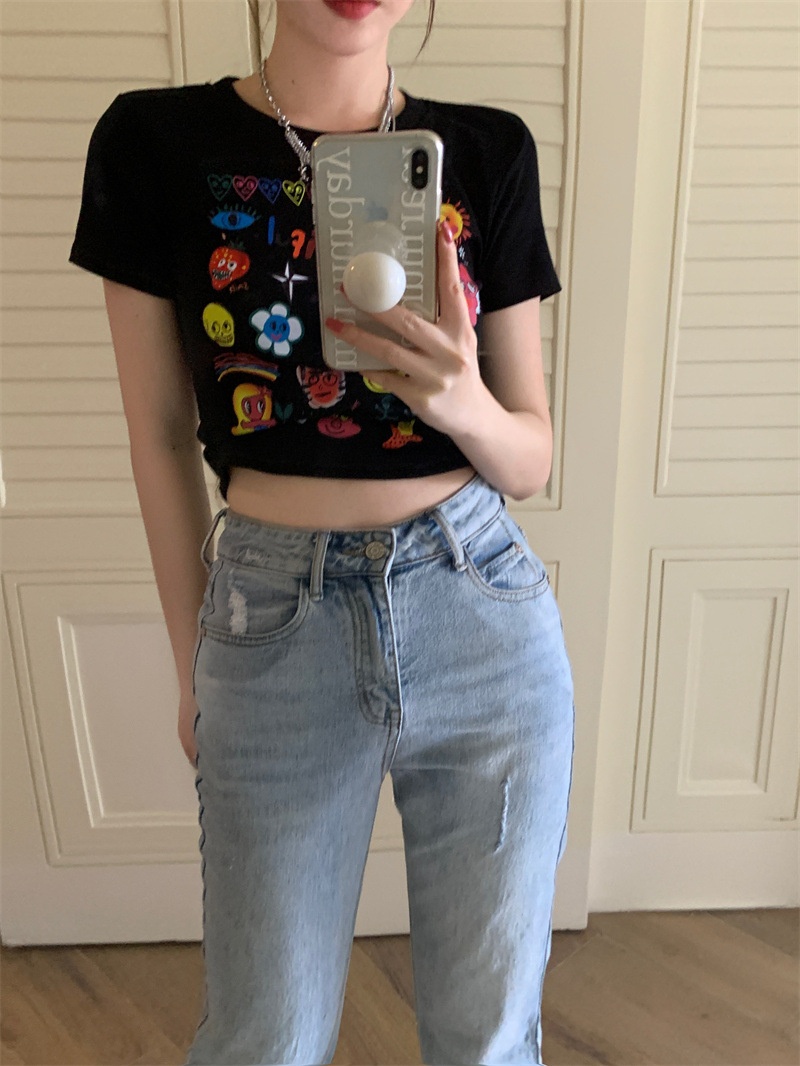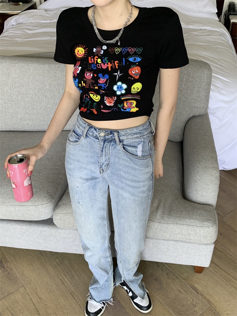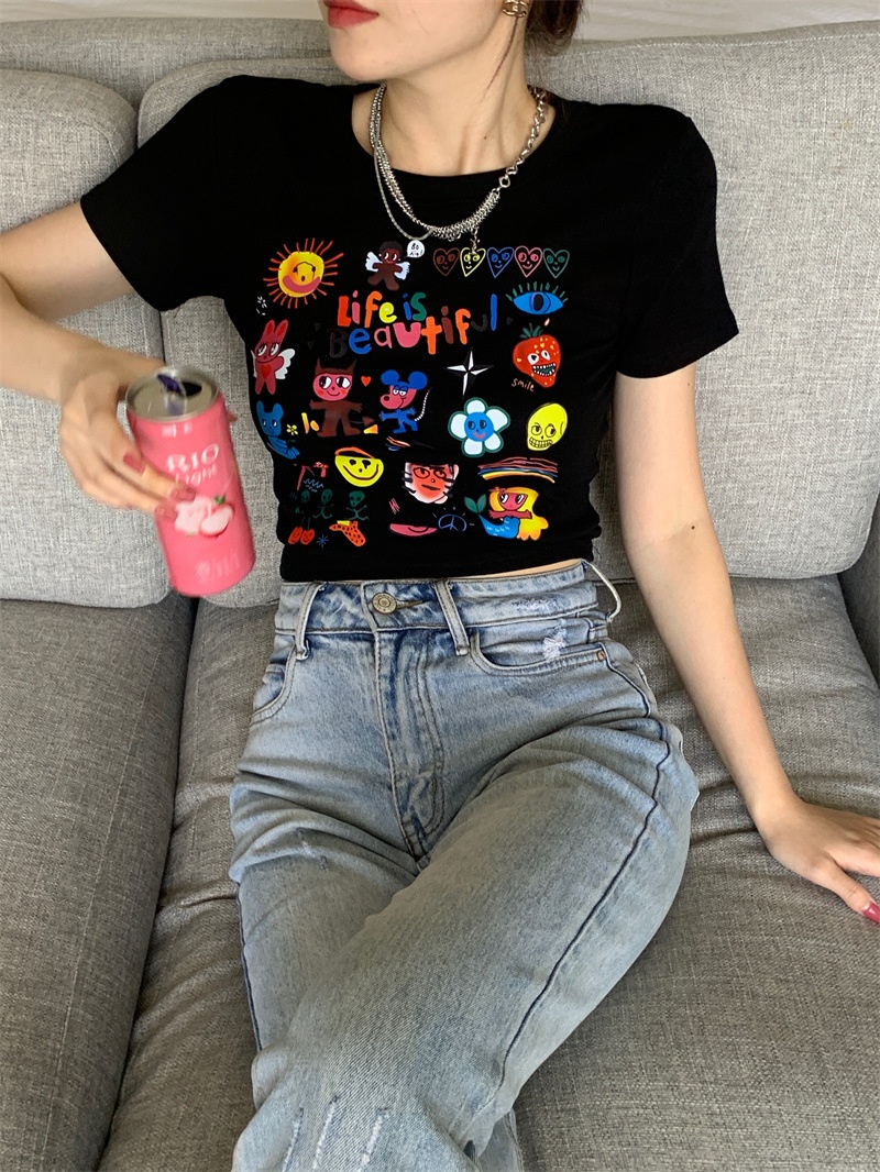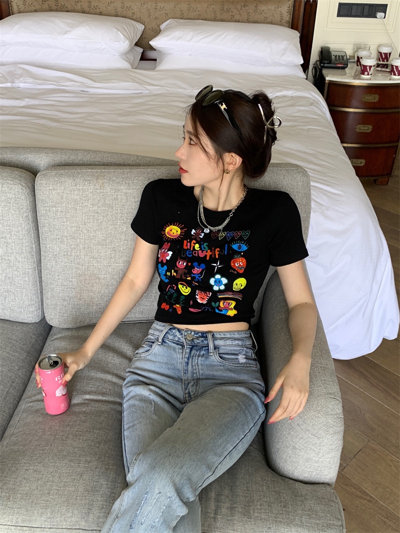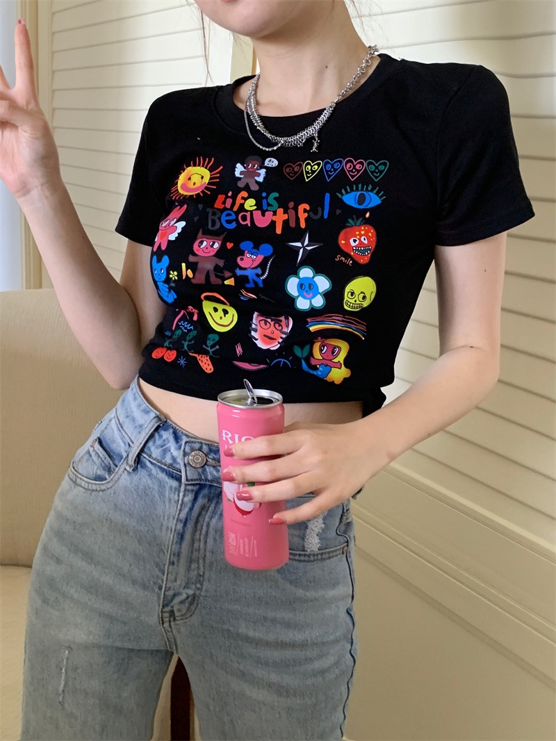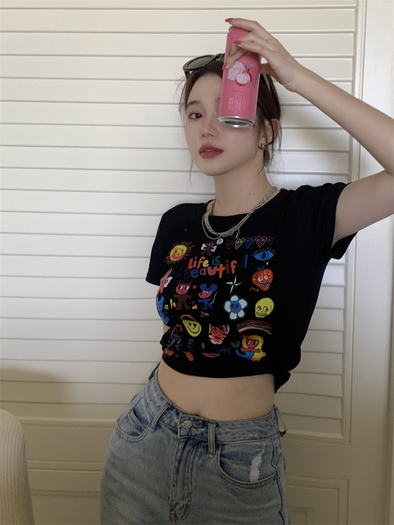 辣妹黑色短袖T恤女夏装2025年新款复古修身显瘦短款印花上衣ins潮