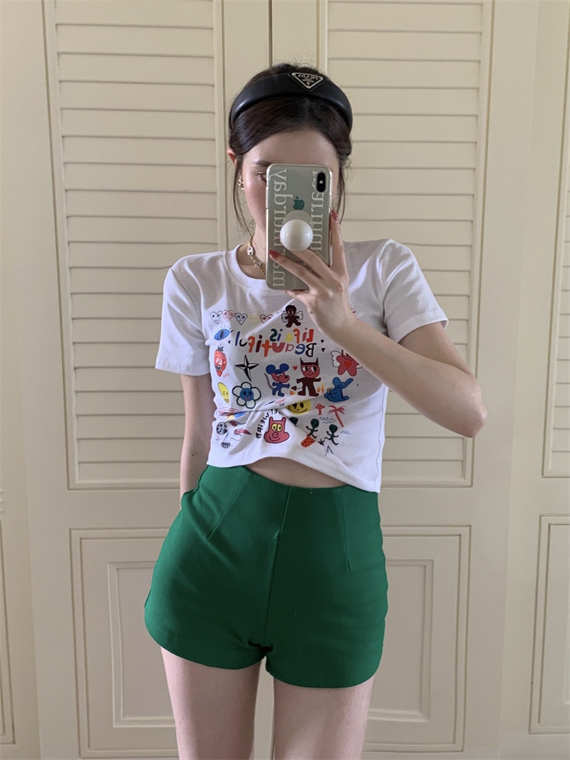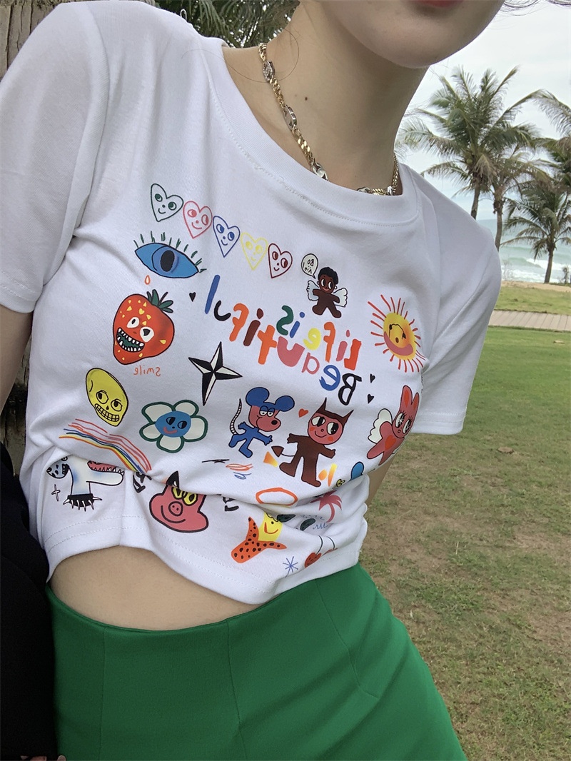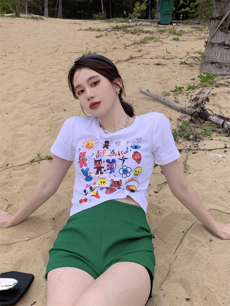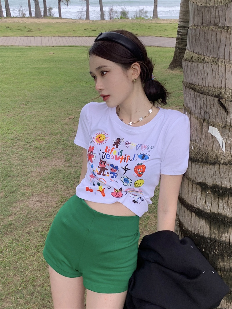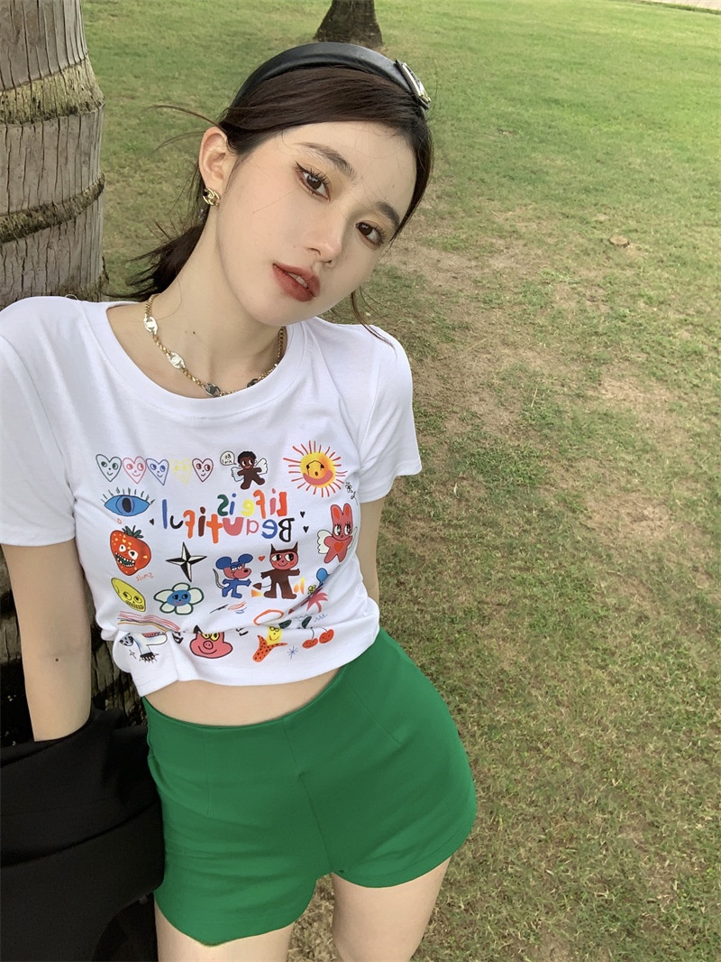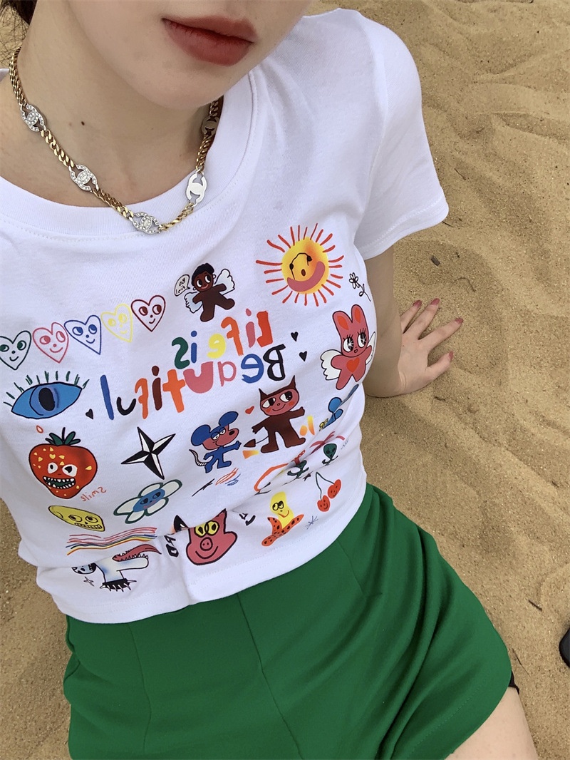 辣妹黑色短袖T恤女夏装2025年新款复古修身显瘦短款印花上衣ins潮