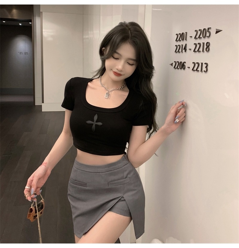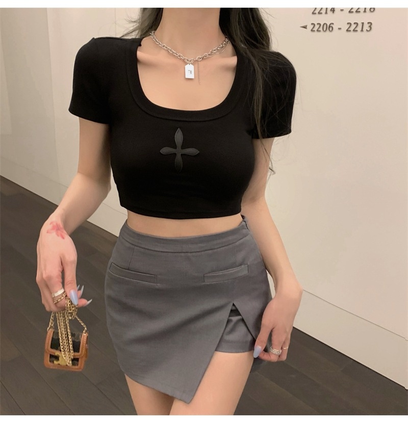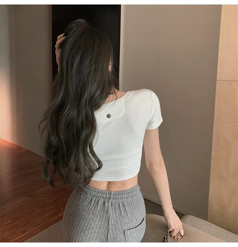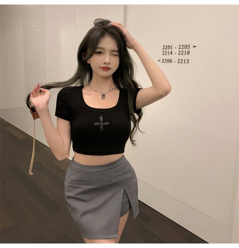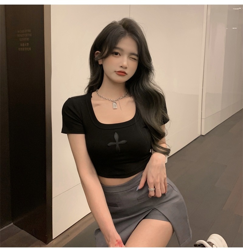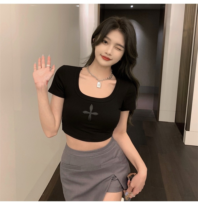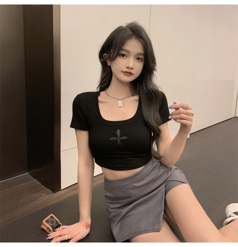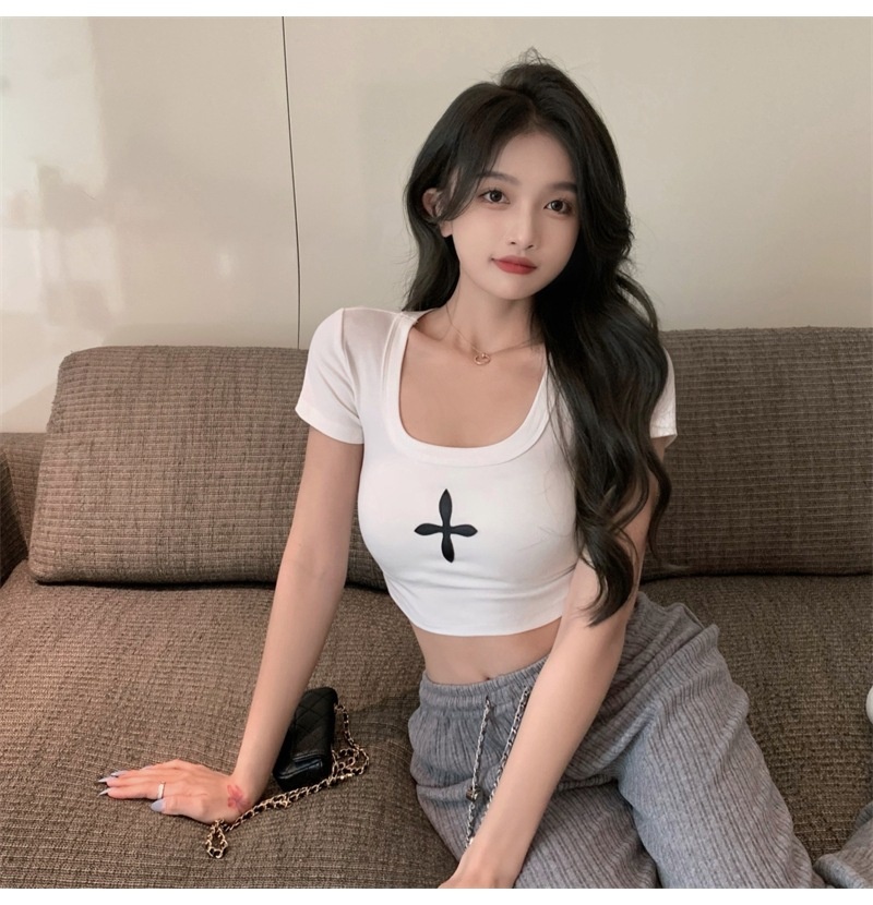 批发2025夏季新款韩版U领露锁骨纯欲辣妹修身短款学生短袖上衣女
