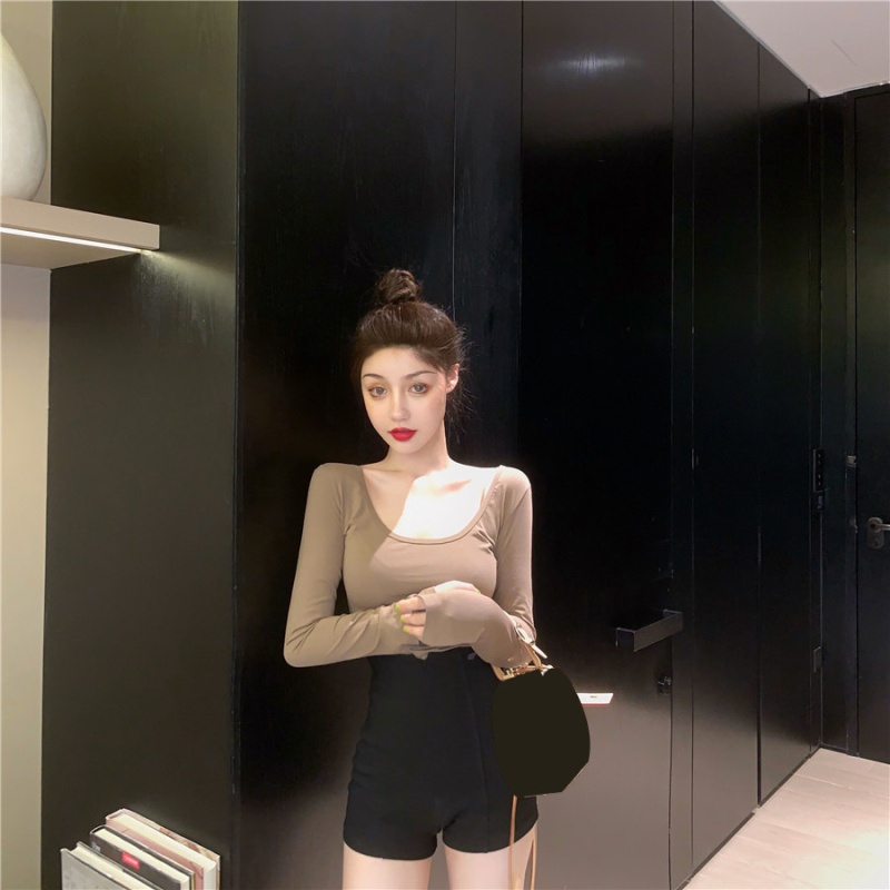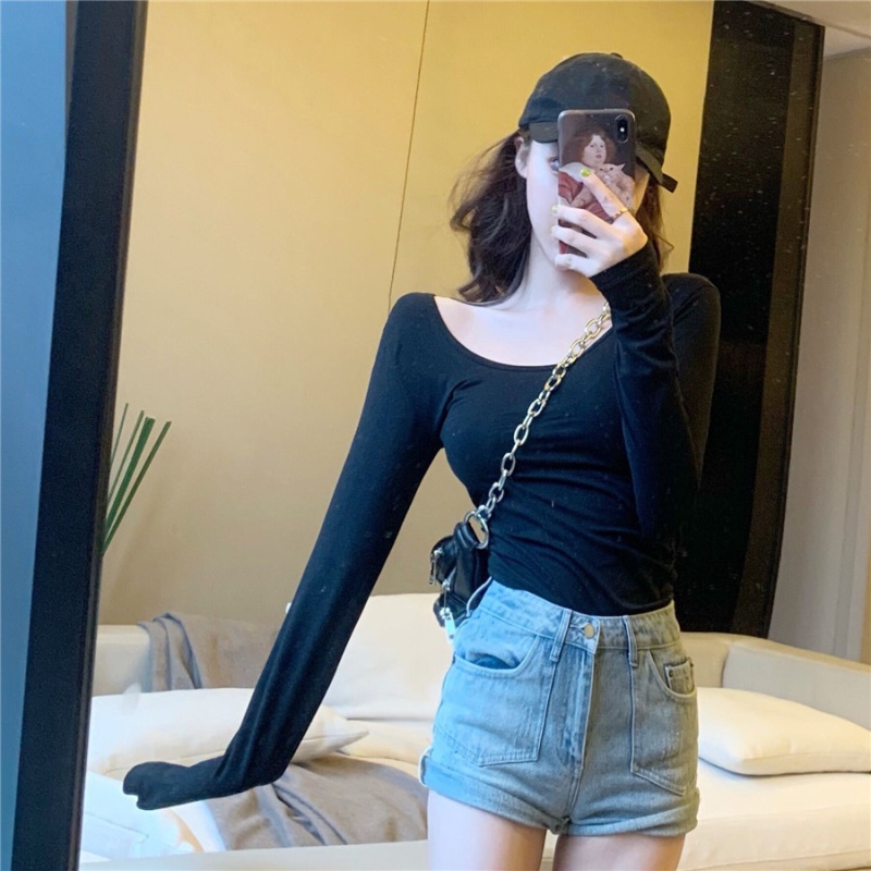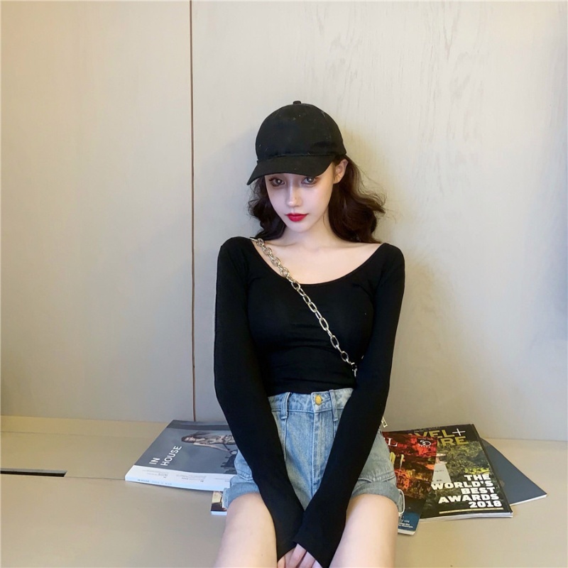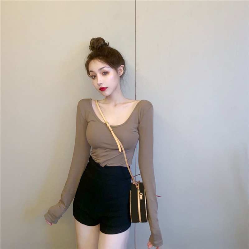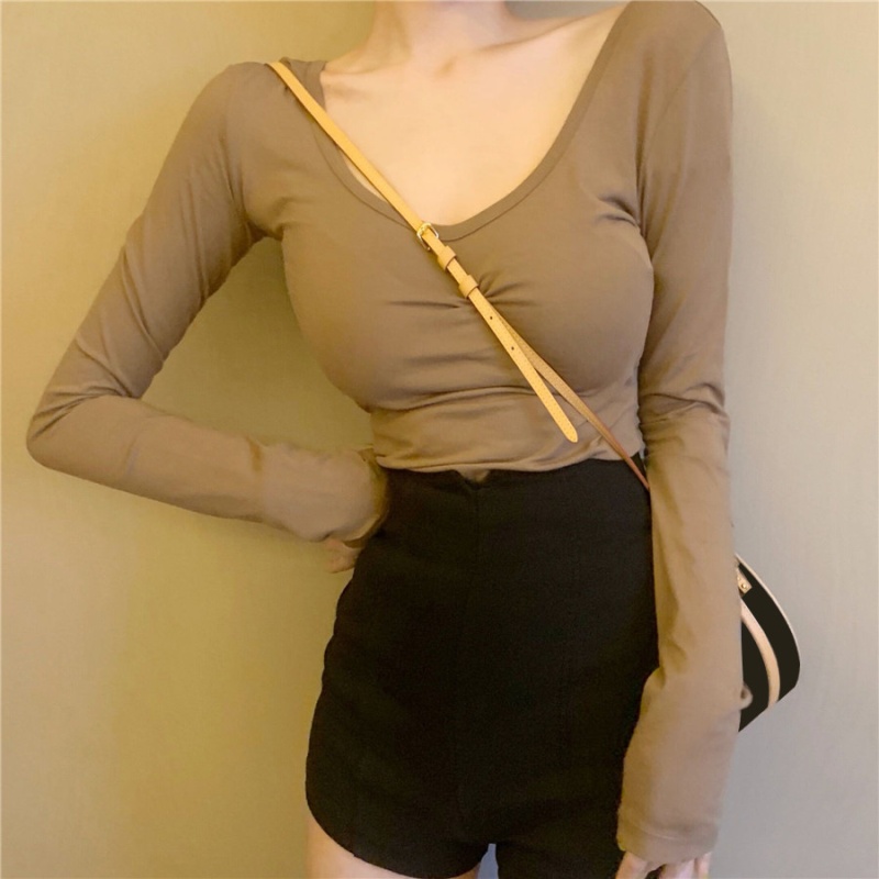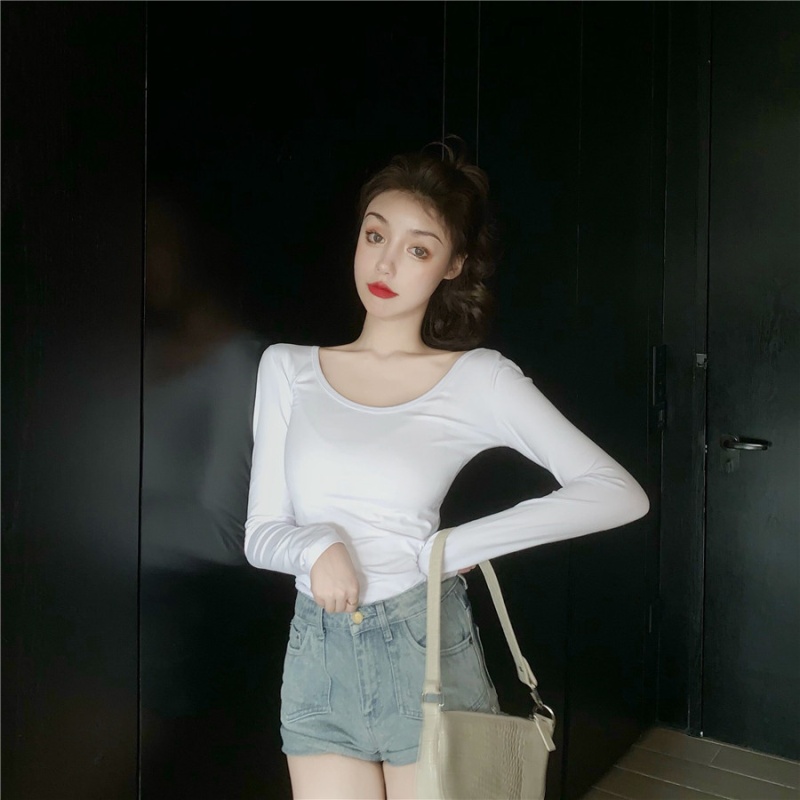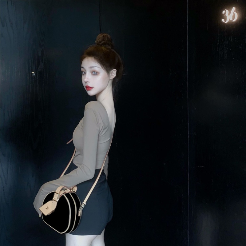 秋季2025新款性感露背长袖t恤女百搭设计感U领纯色上衣辣妹打底衫