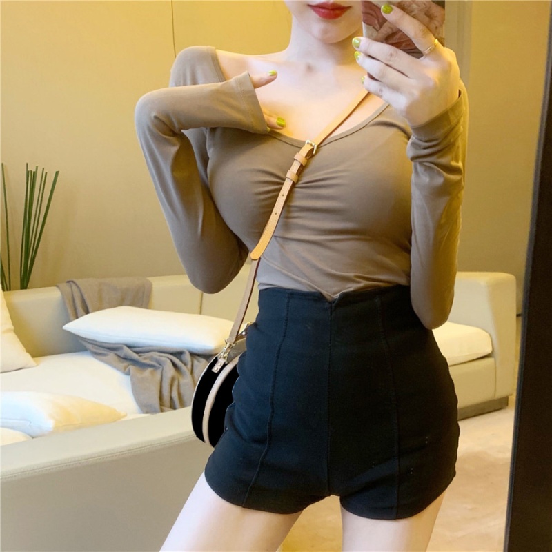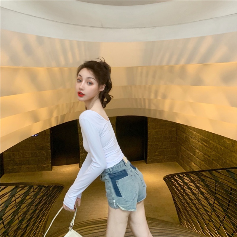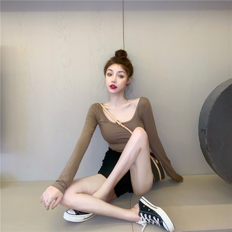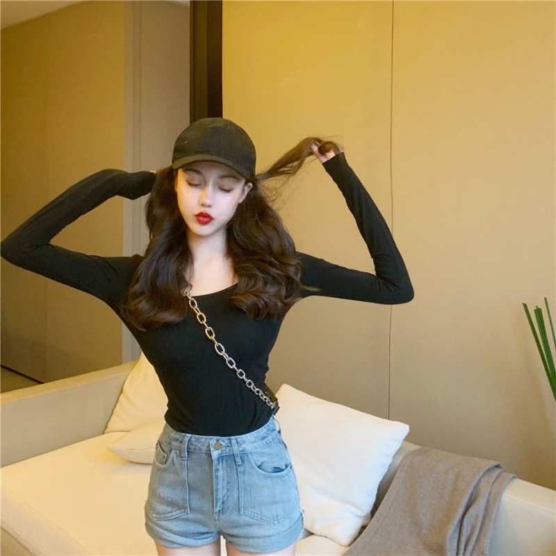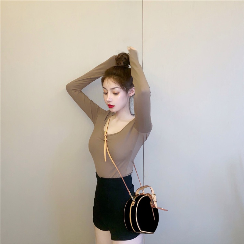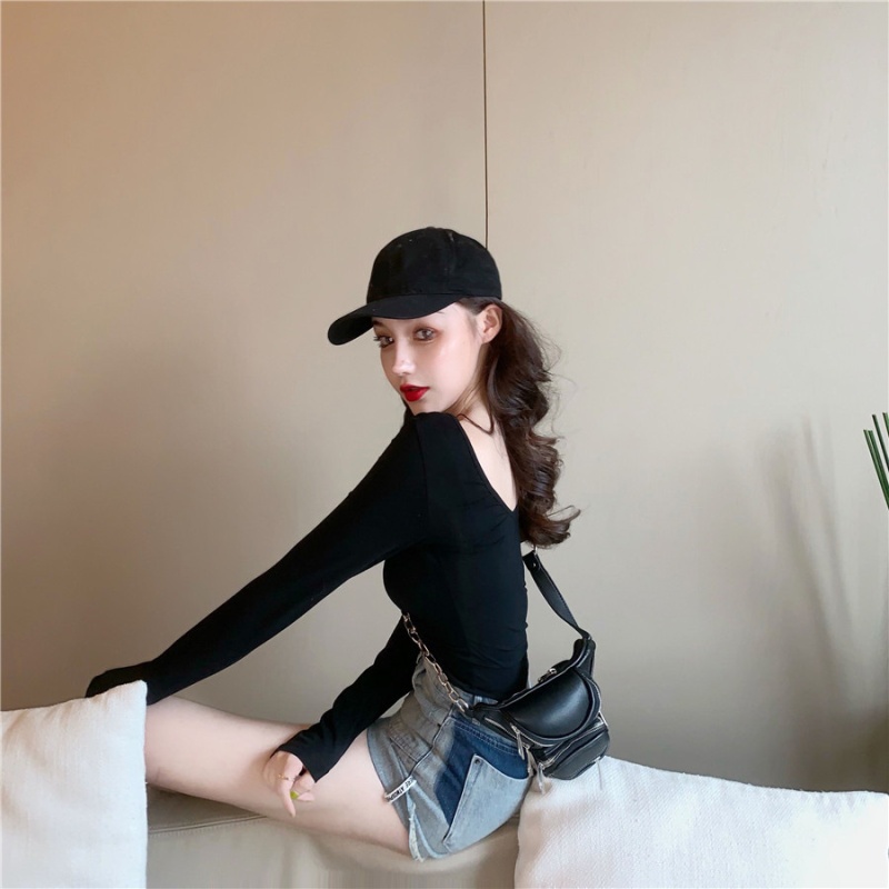 秋季2025新款性感露背长袖t恤女百搭设计感U领纯色上衣辣妹打底衫