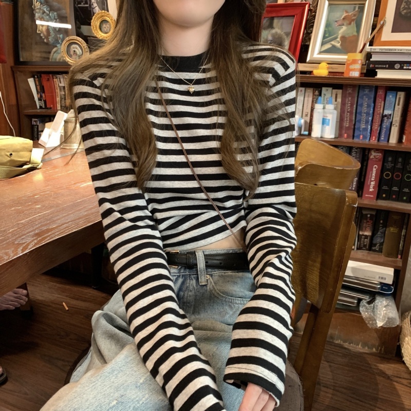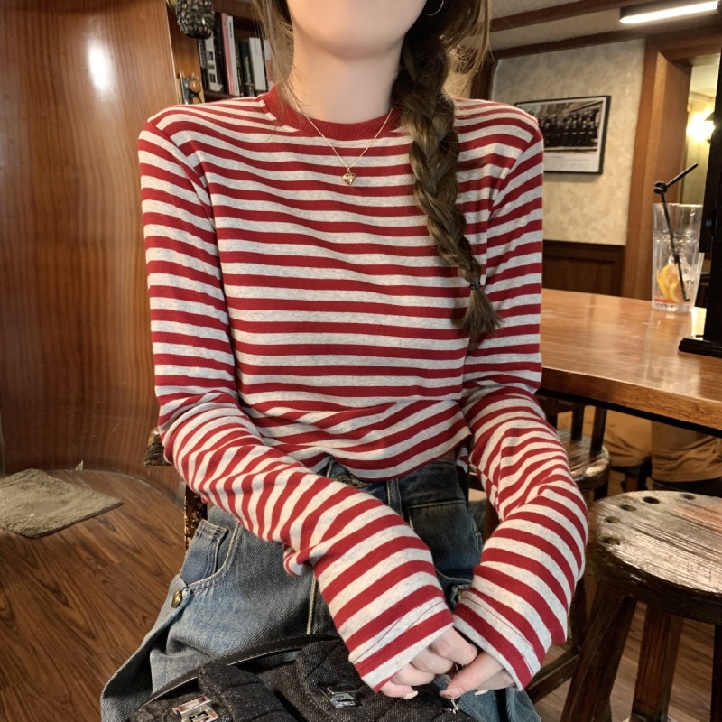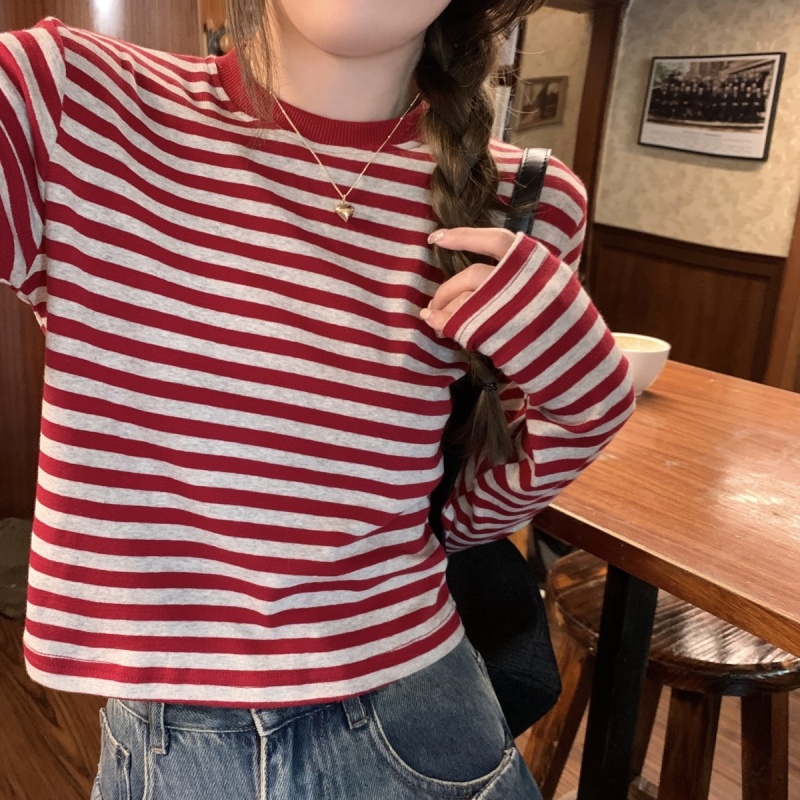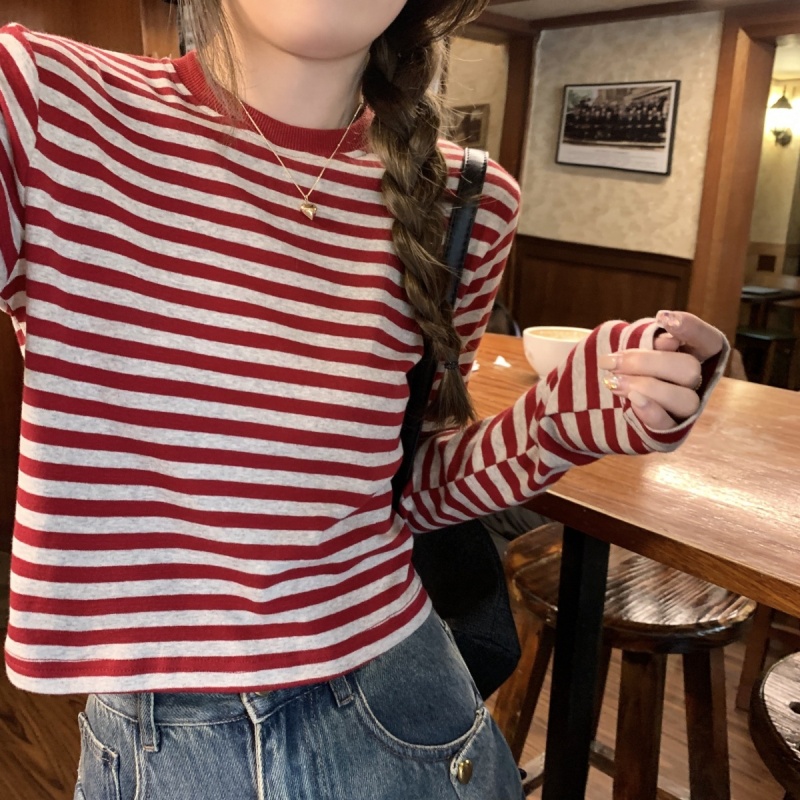 撞色条纹长袖T恤女2025秋季新款休闲显瘦内搭打底衫短款学生上衣