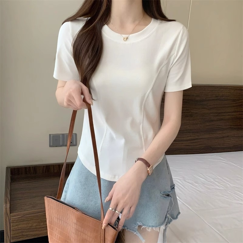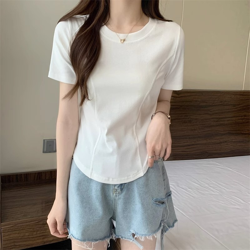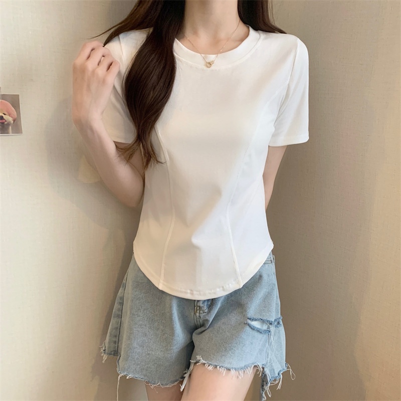 2025夏季新款修身短袖t恤女装设计感短款纯欲不规则下摆弧形上衣