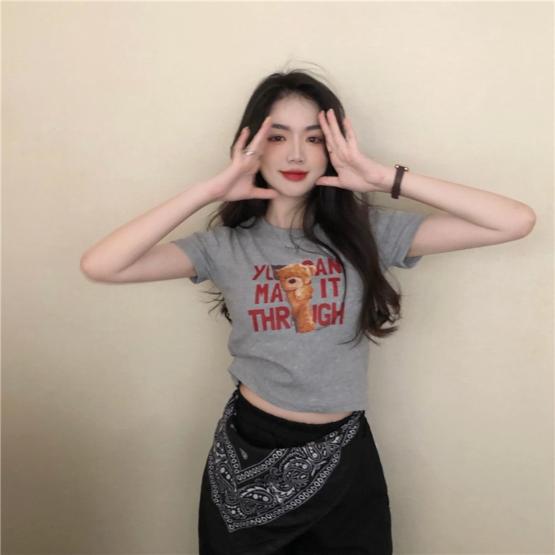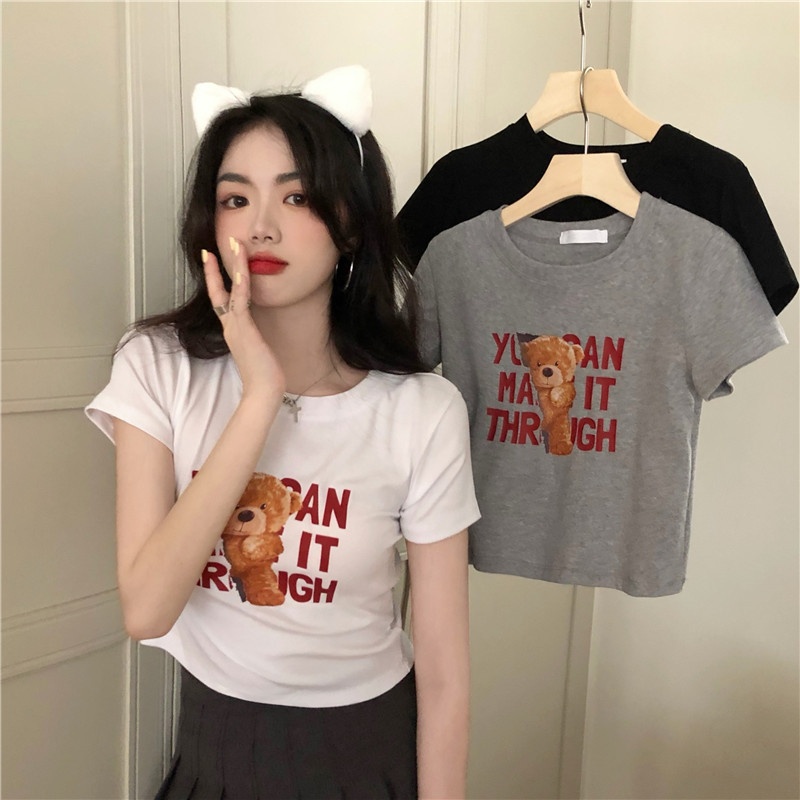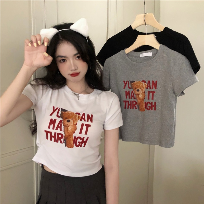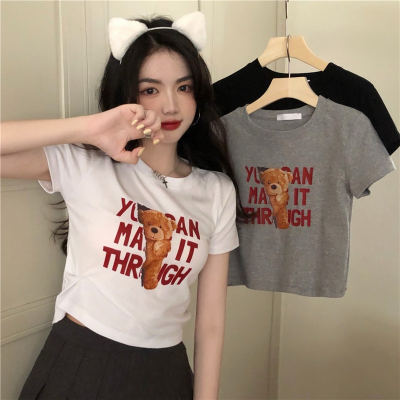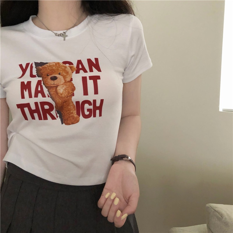 2025夏季新款韩版字母小熊印花短袖T恤女修身短款上衣外贸女装