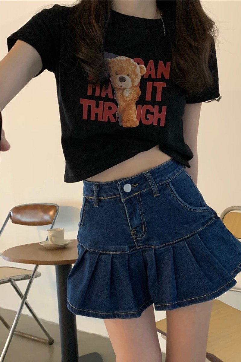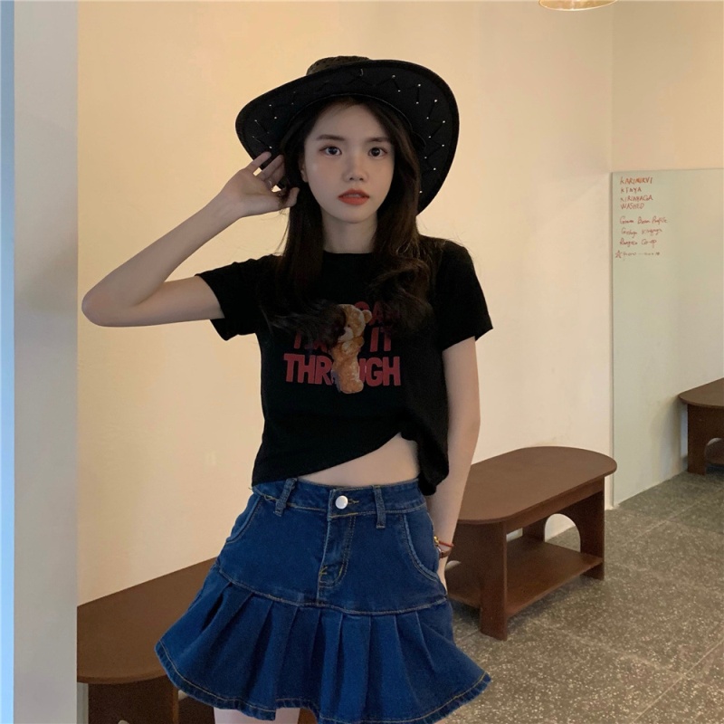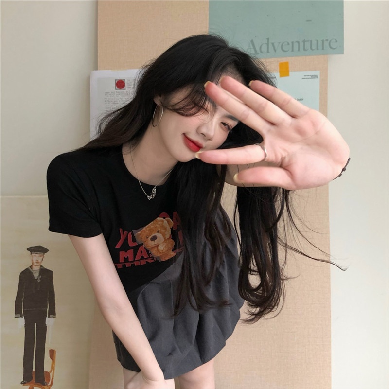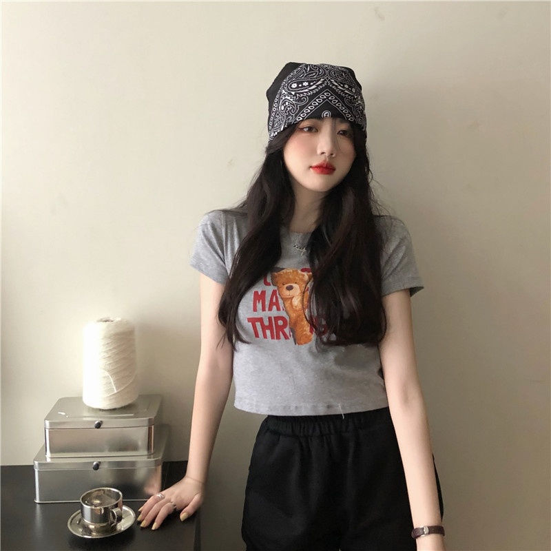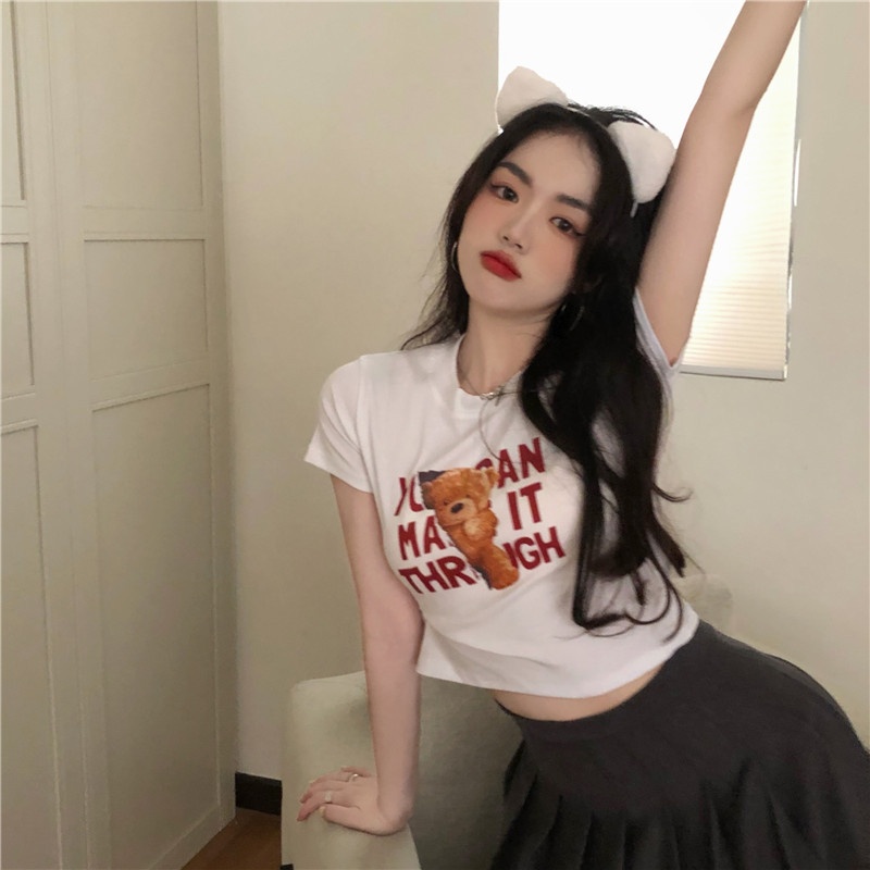 2025夏季新款韩版字母小熊印花短袖T恤女修身短款上衣外贸女装
