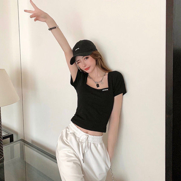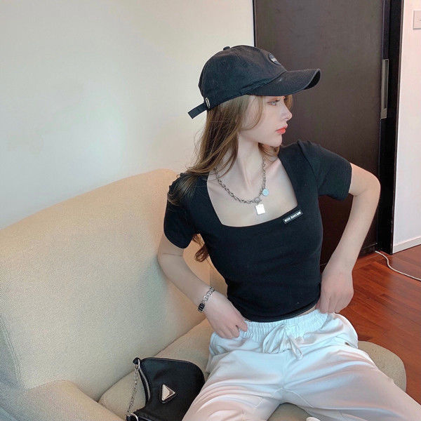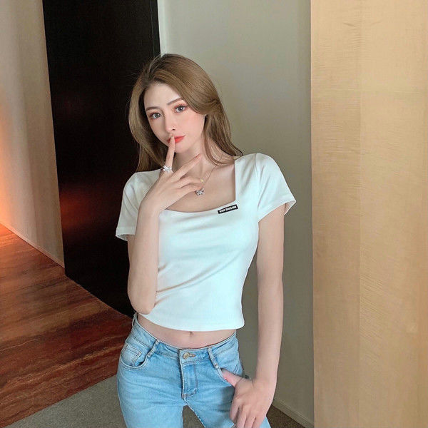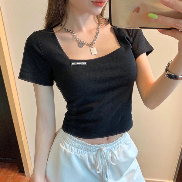 复古法式方领短款高腰露脐短袖t恤女士修身2025夏季打底衫上衣潮