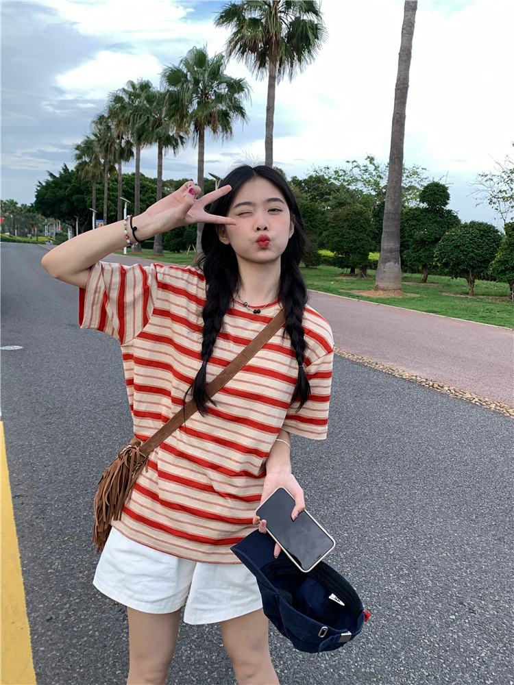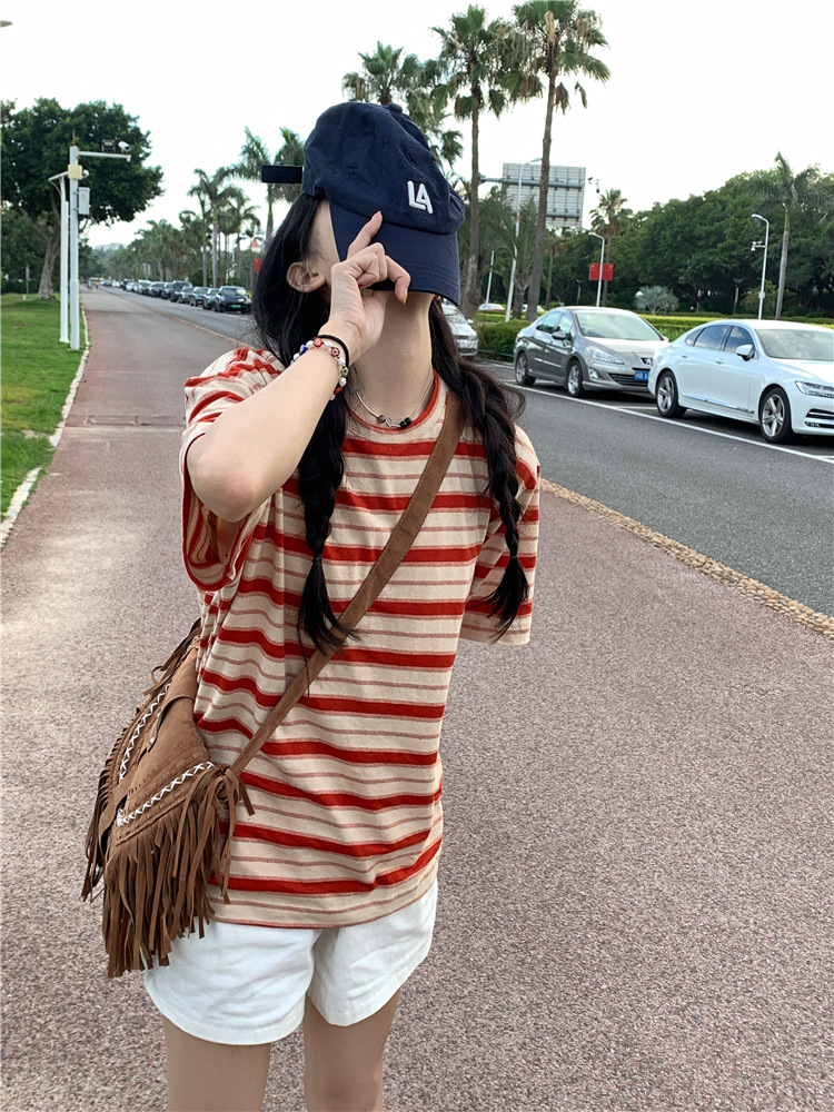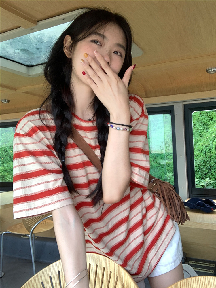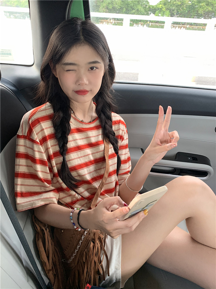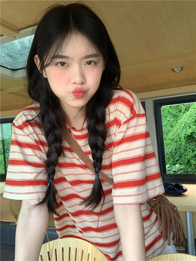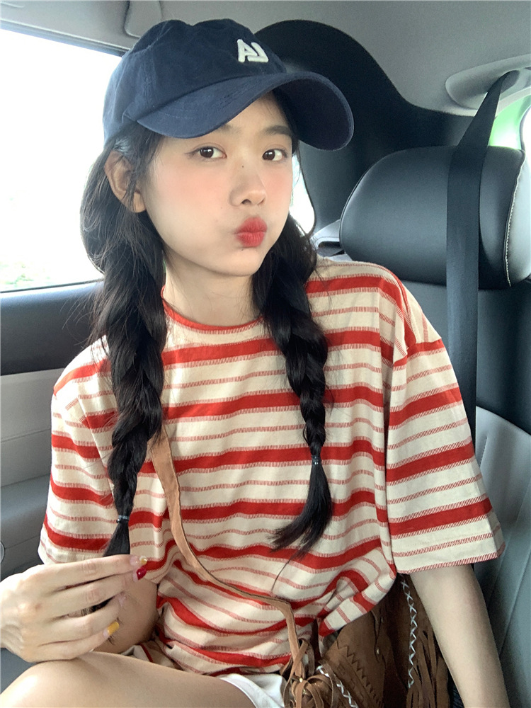 拼色条纹短袖T恤女夏季2025新款宽松休闲百搭圆领套头学生上衣ins