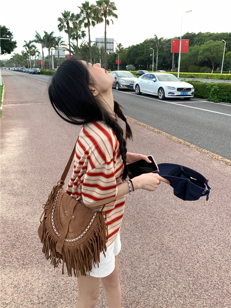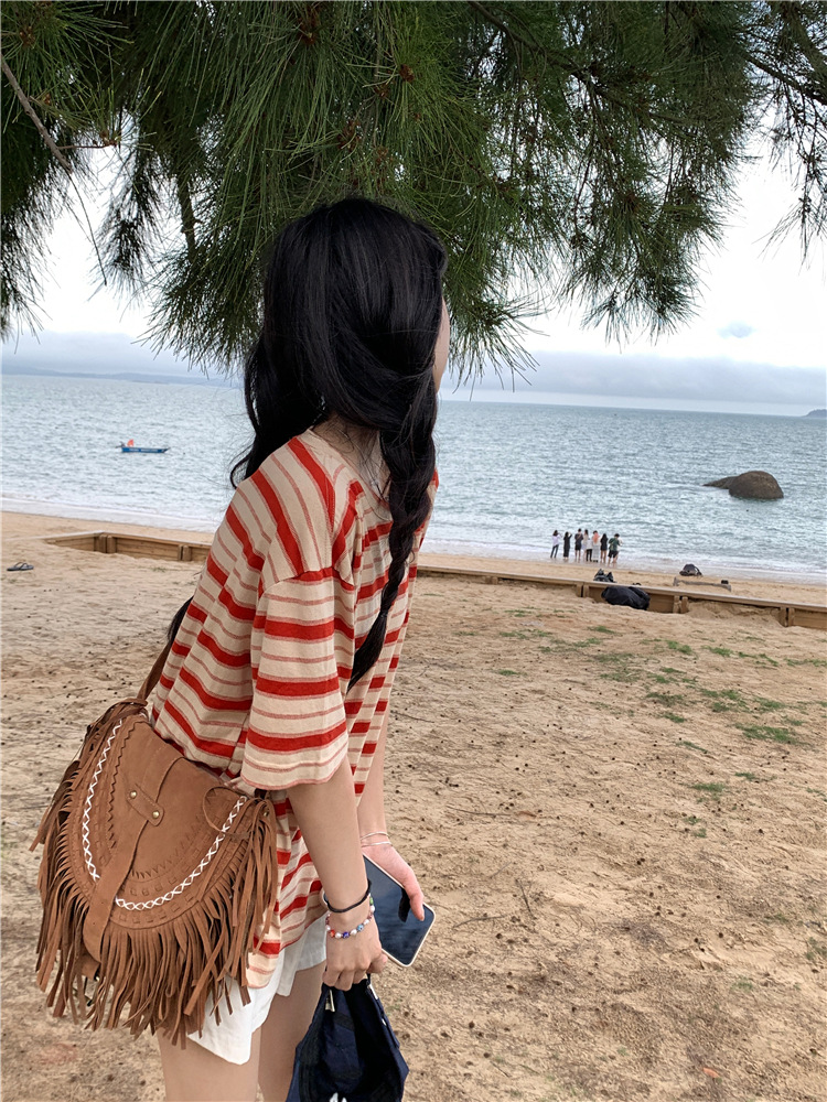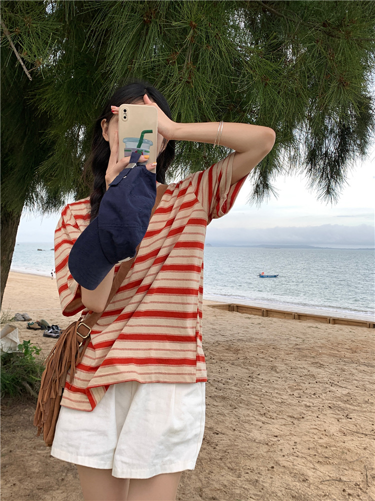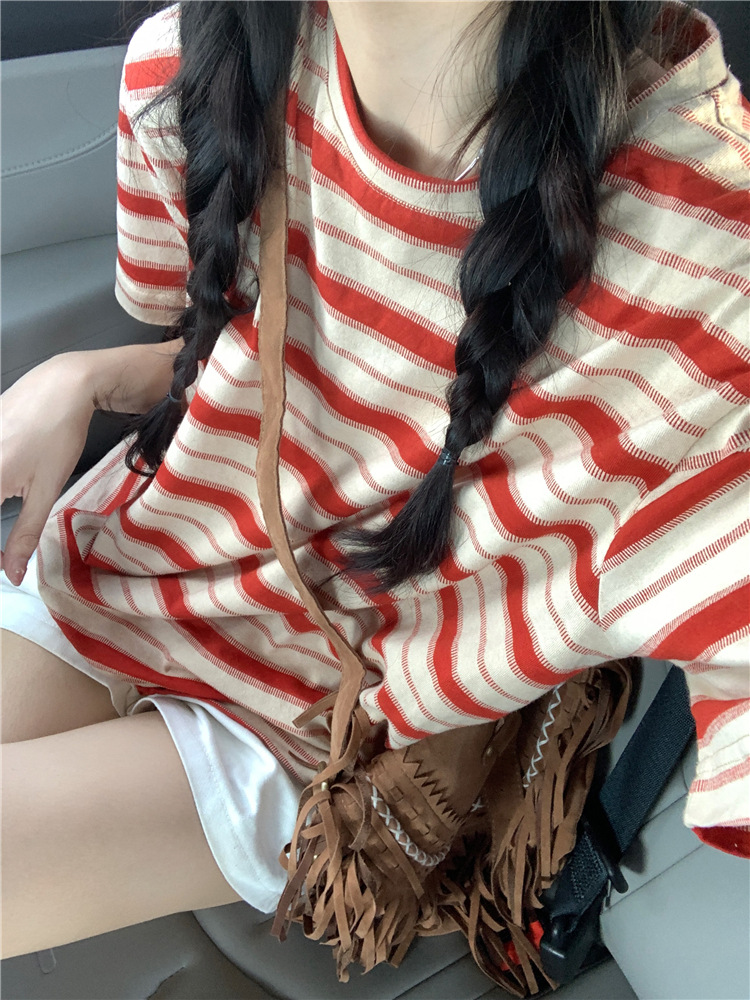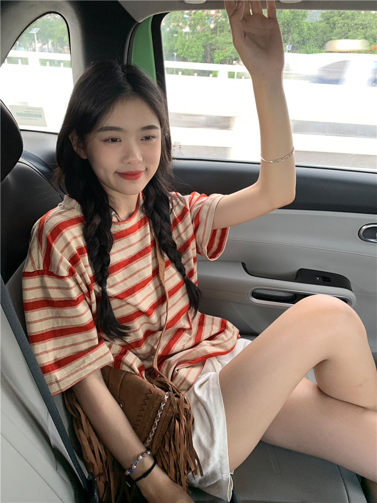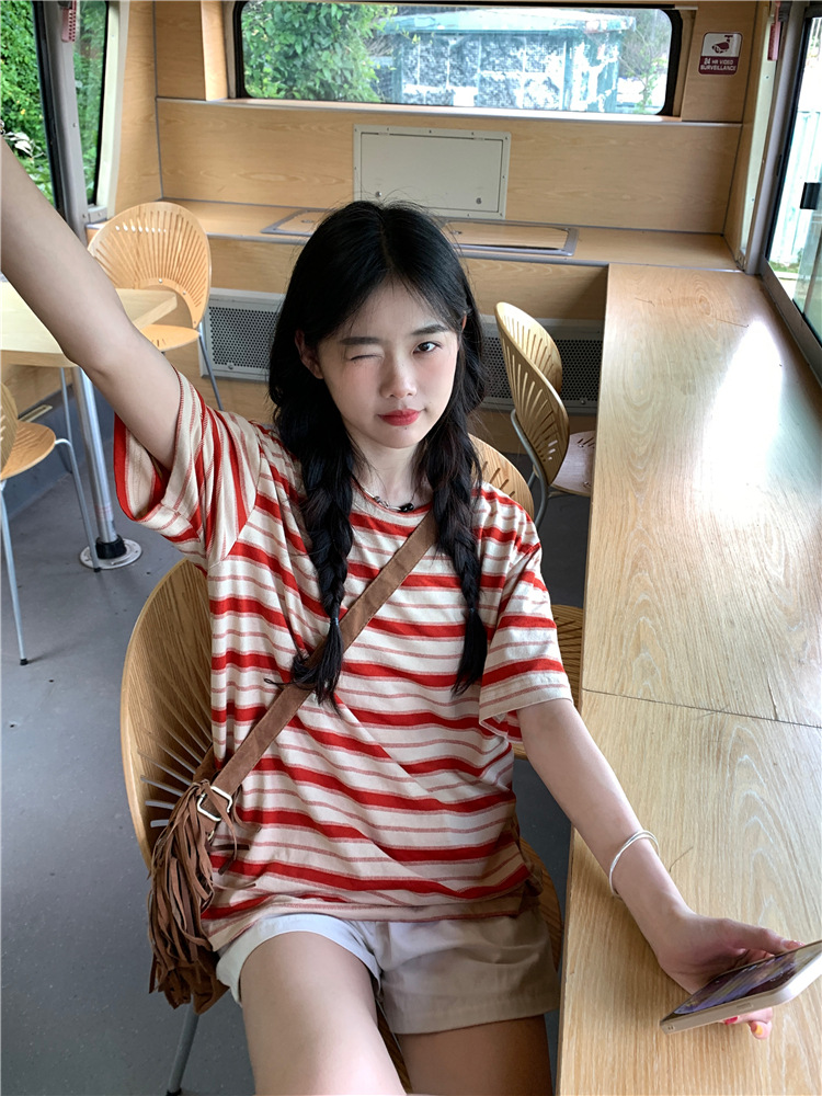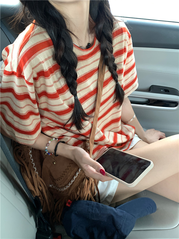 拼色条纹短袖T恤女夏季2025新款宽松休闲百搭圆领套头学生上衣ins