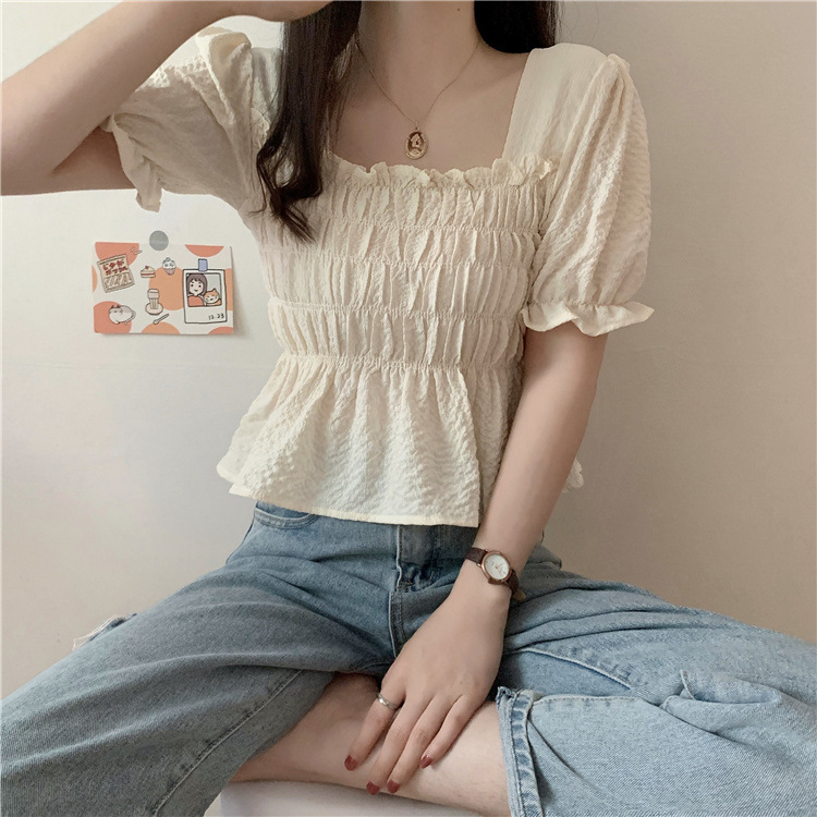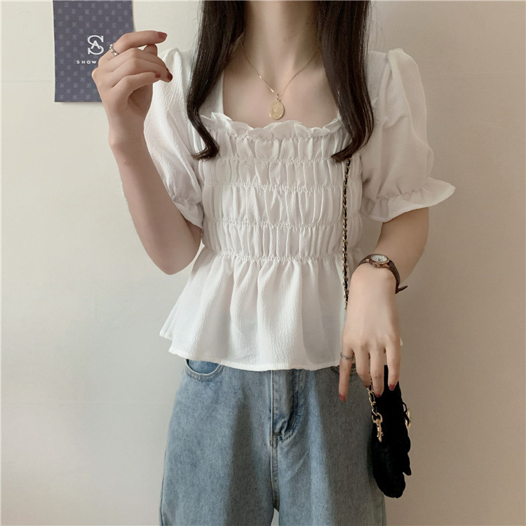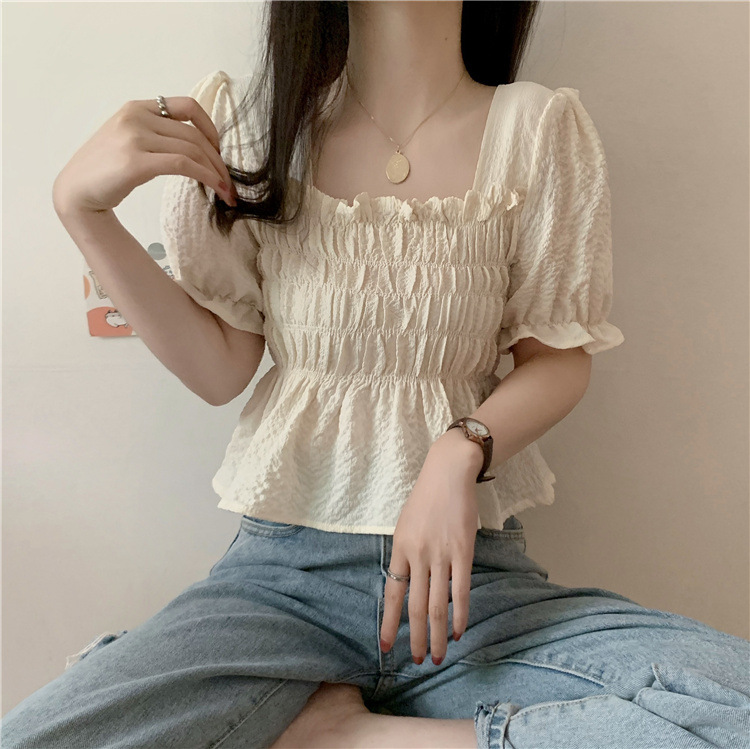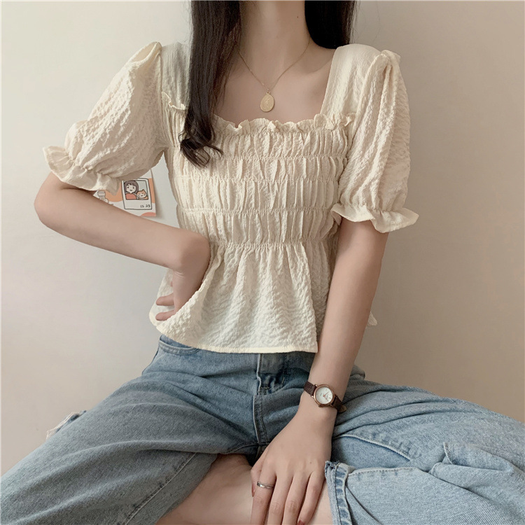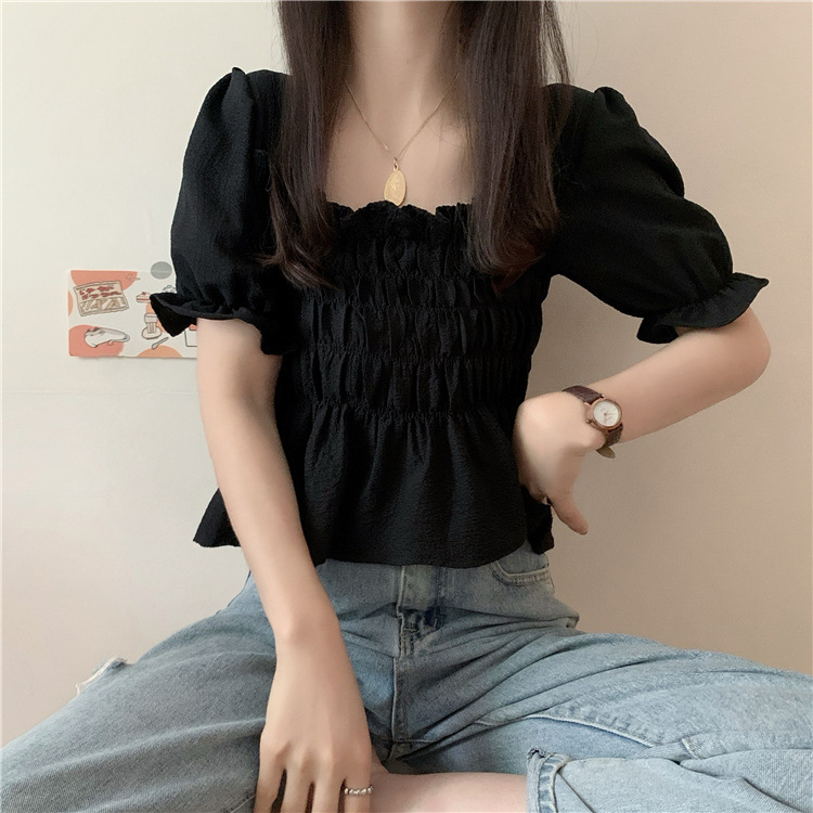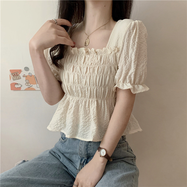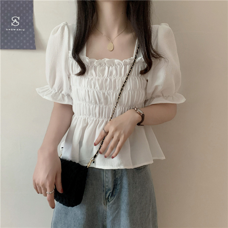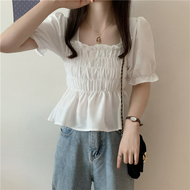 雪纺衬衫女夏季2025新款韩版设计感小众泡泡袖收腰方领短款T恤女