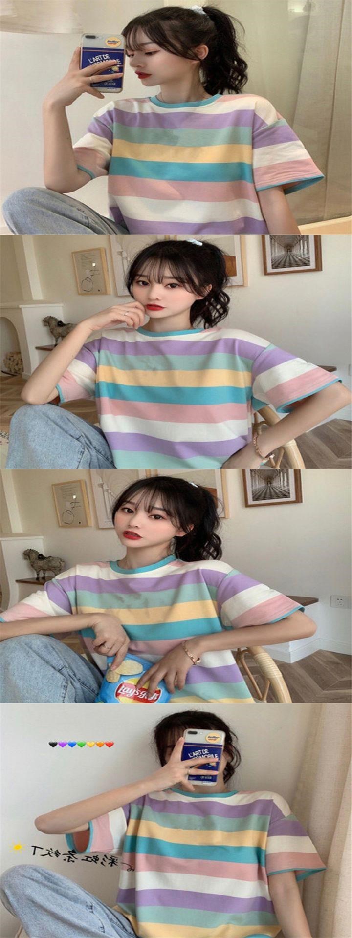2025春夏季新款韩版彩虹休闲宽松短袖T恤女潮学生上衣服女装批发