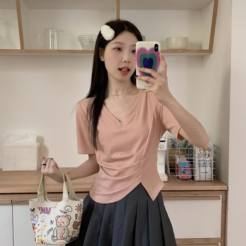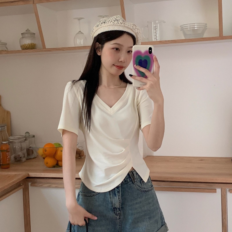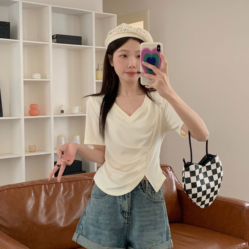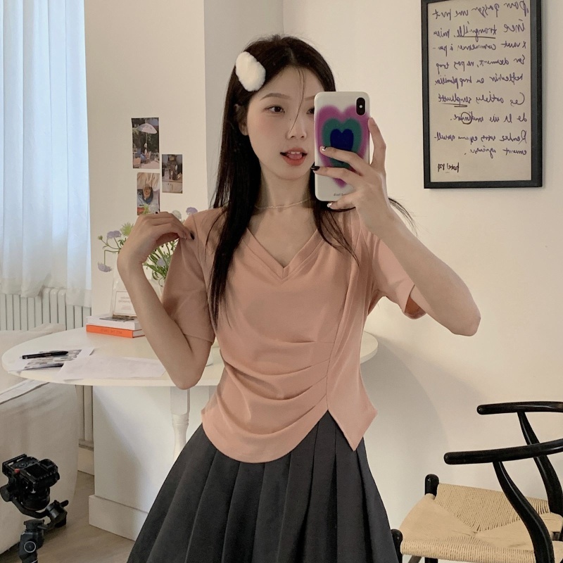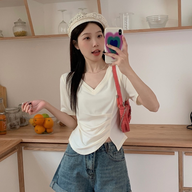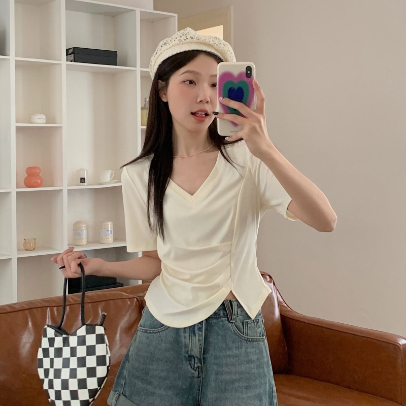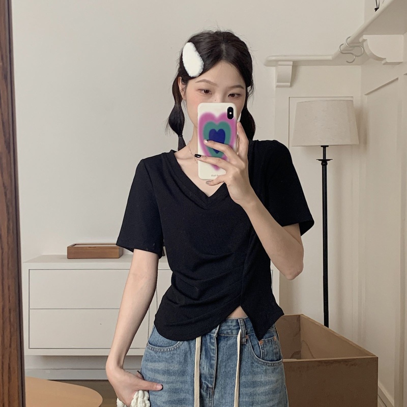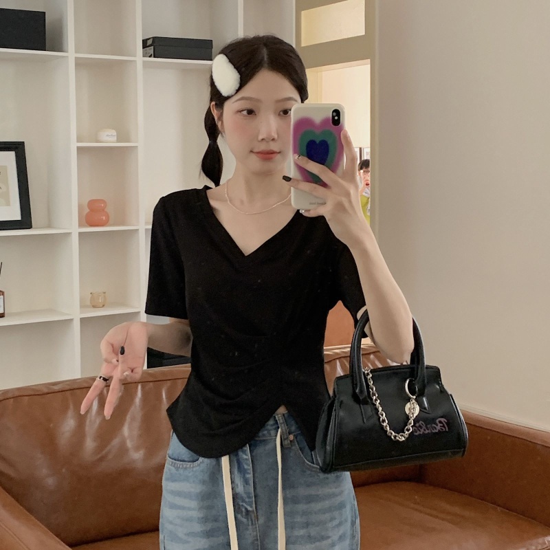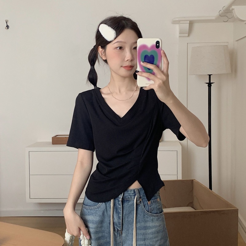 女装不规则V领开叉短袖T恤女2025夏季新款褶肚学生短款上衣打底衫
