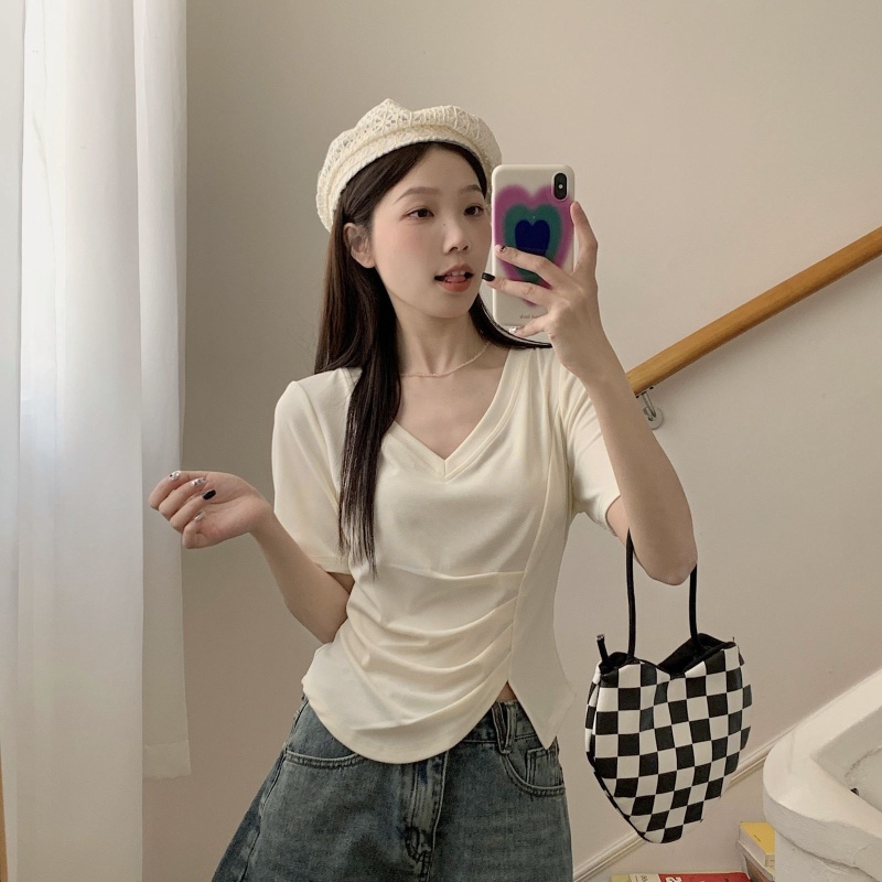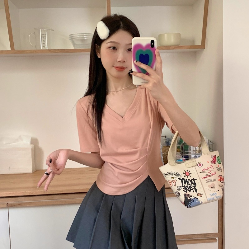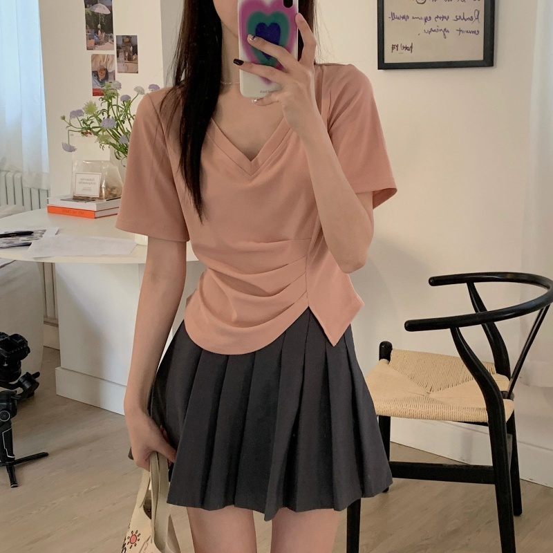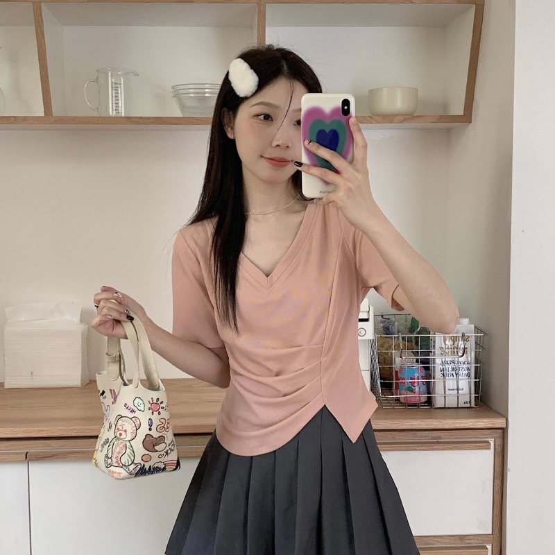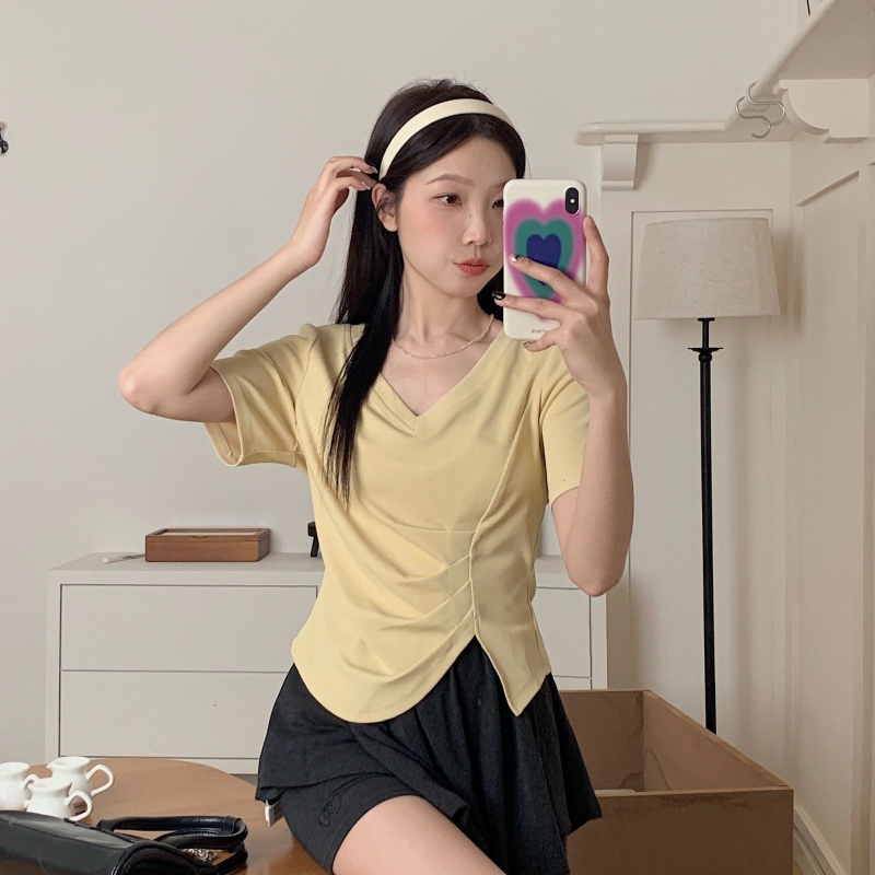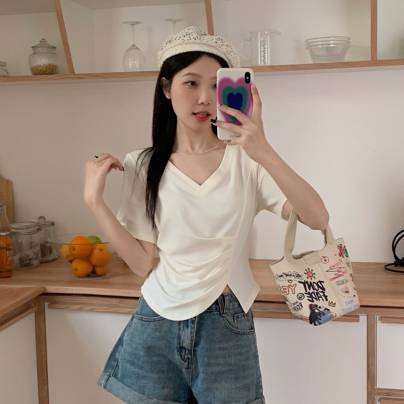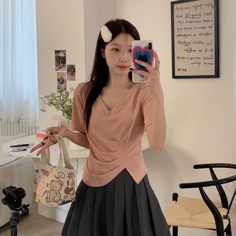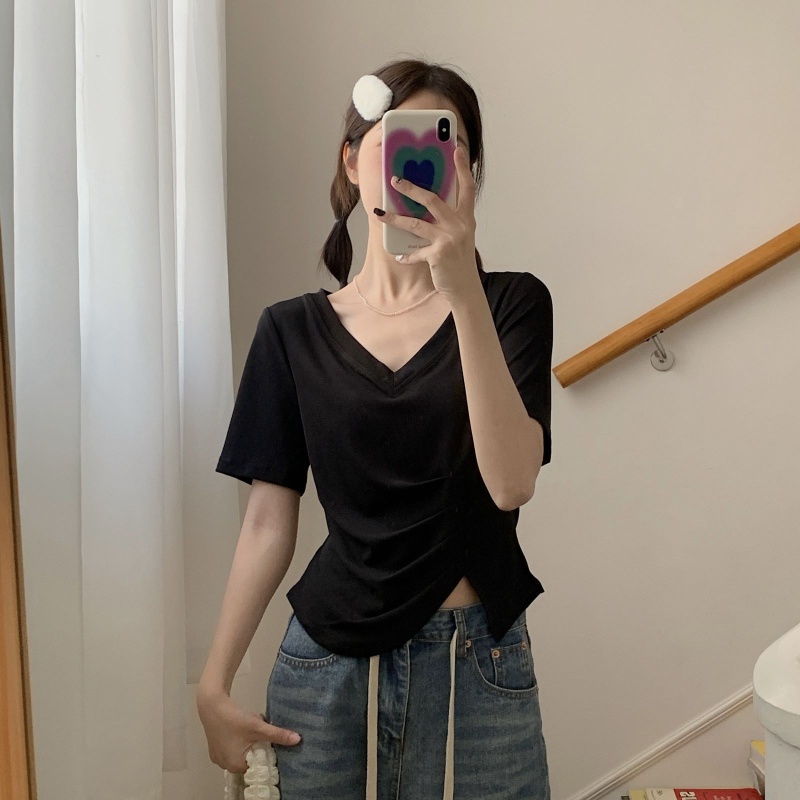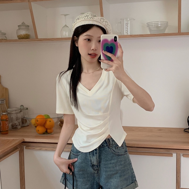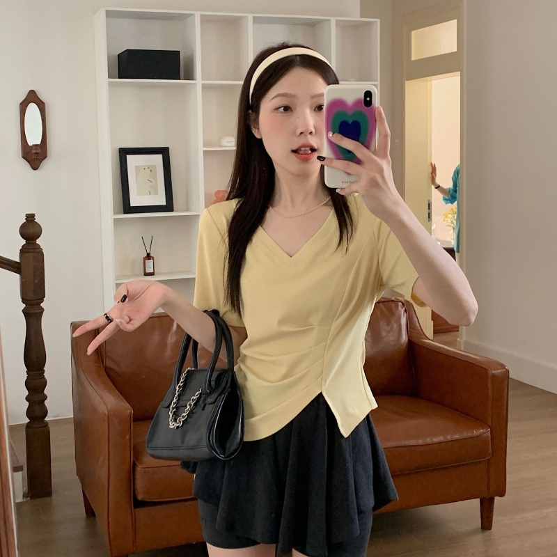 女装不规则V领开叉短袖T恤女2025夏季新款褶肚学生短款上衣打底衫
