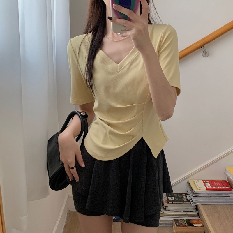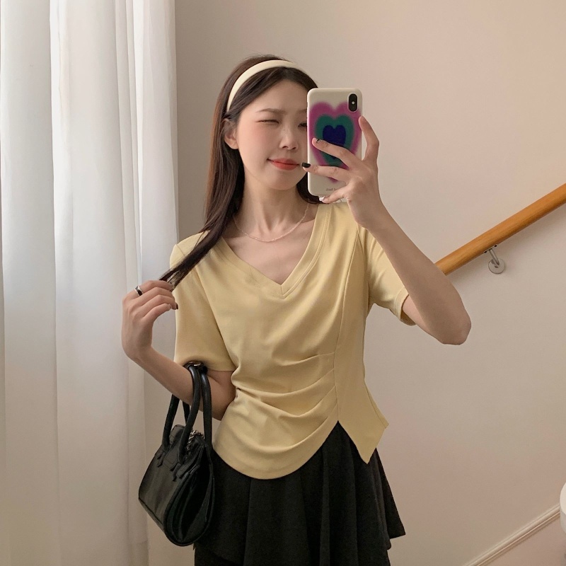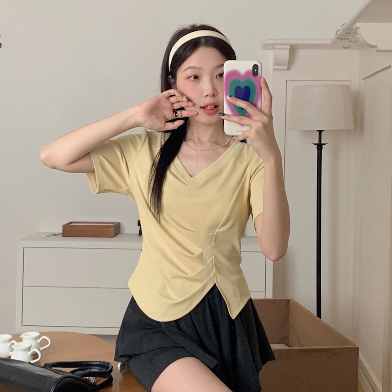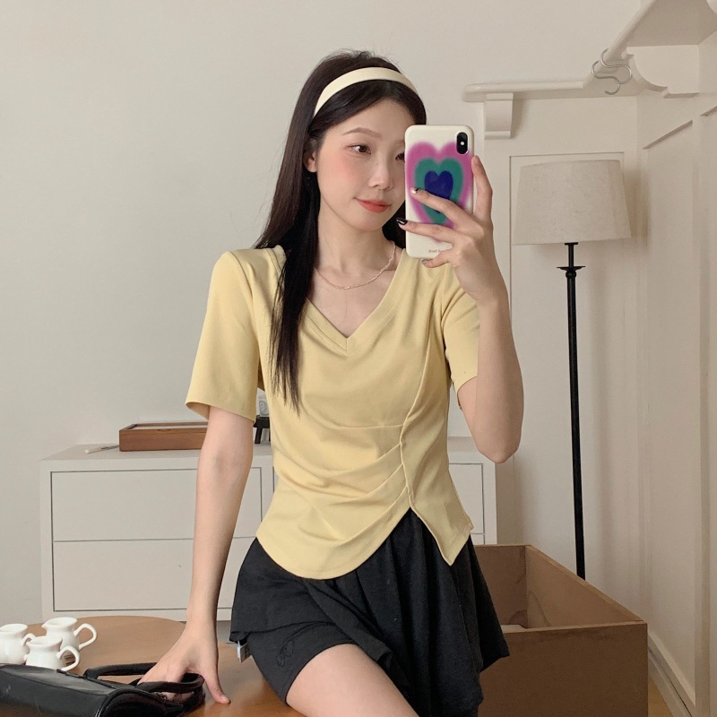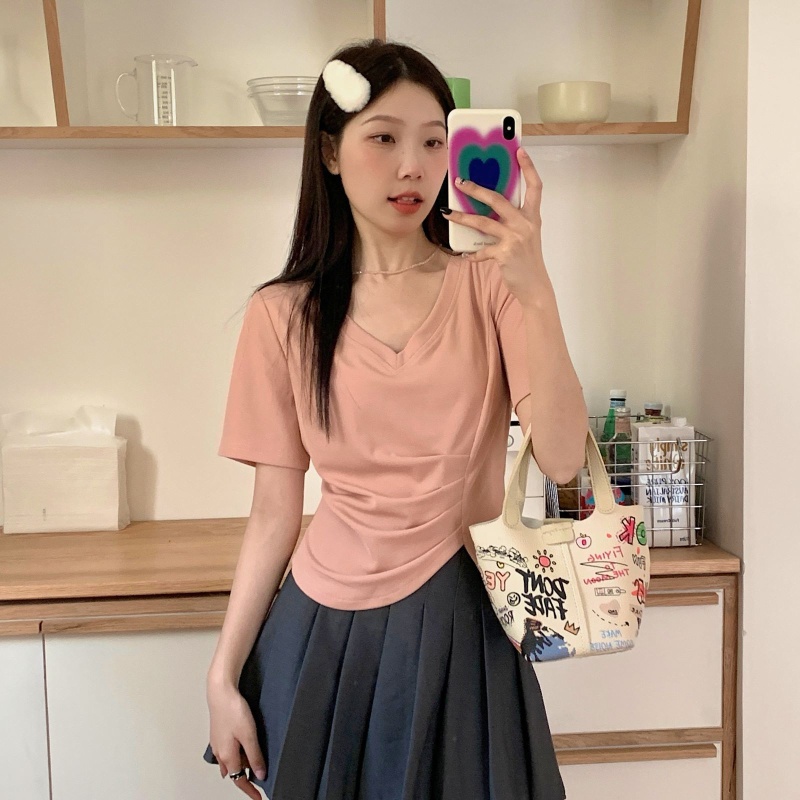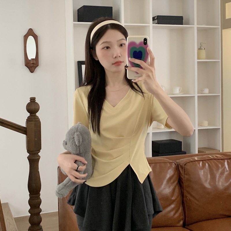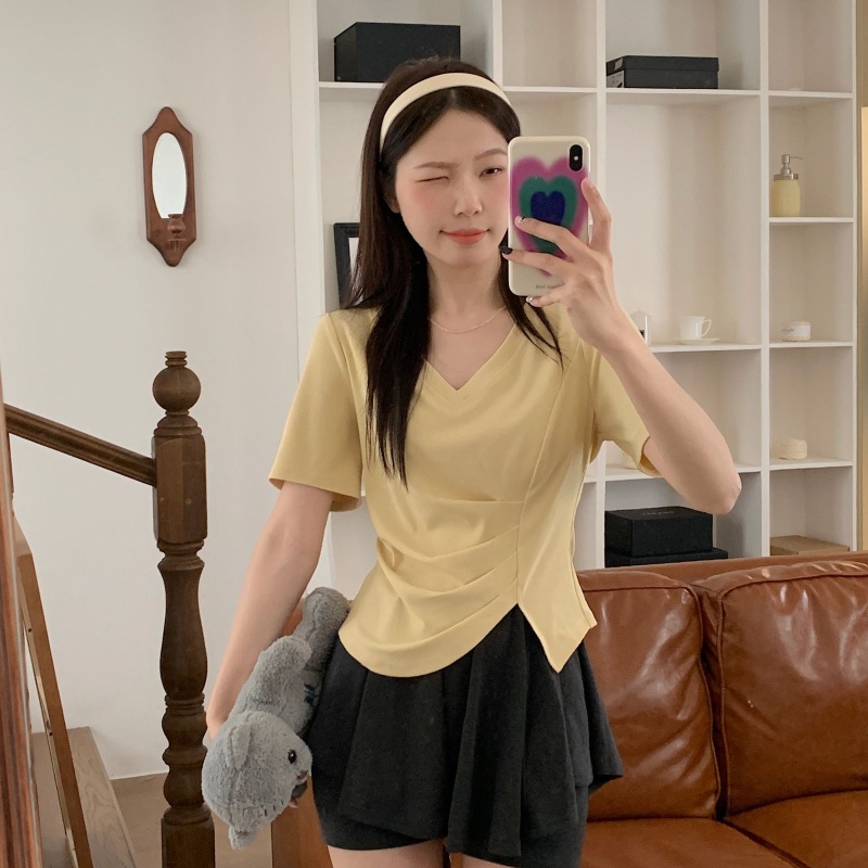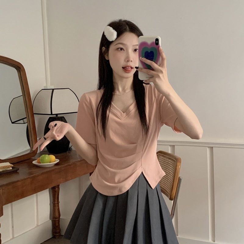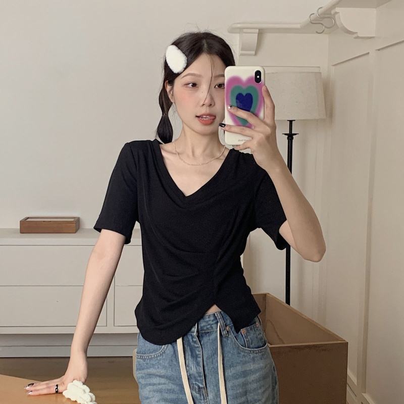 女装不规则V领开叉短袖T恤女2025夏季新款褶肚学生短款上衣打底衫