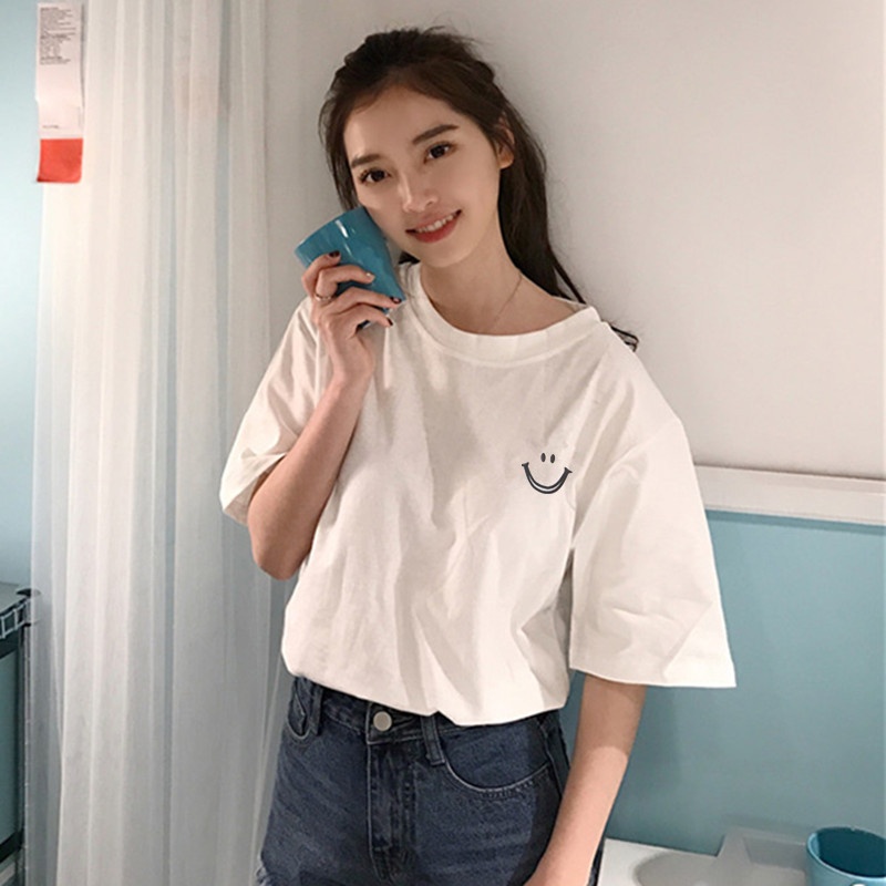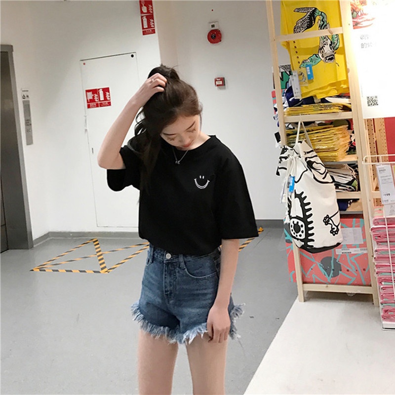 ins超火笑脸印花短袖t恤女2025新款韩版原宿风bf宽松百搭学生上衣
