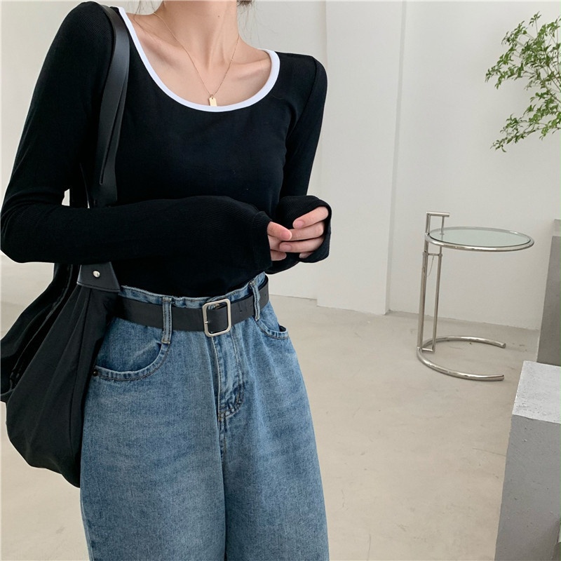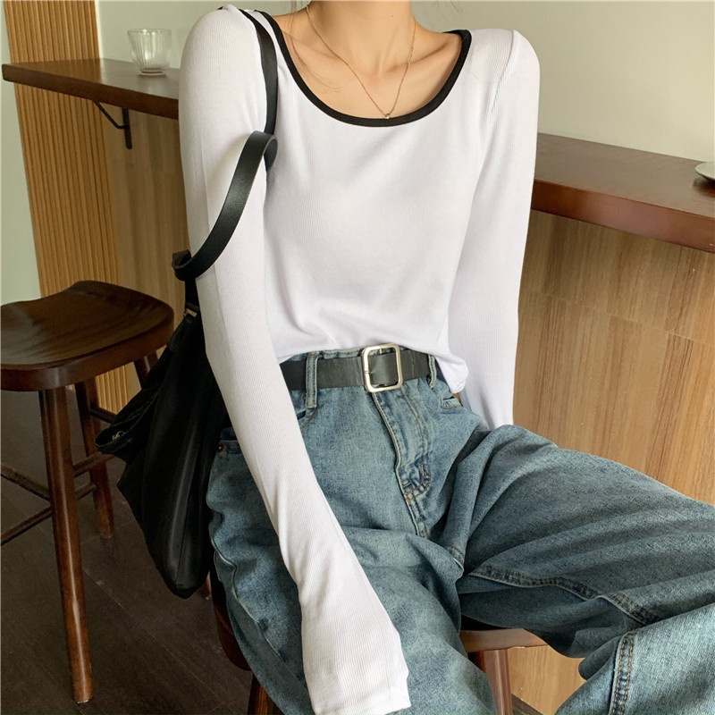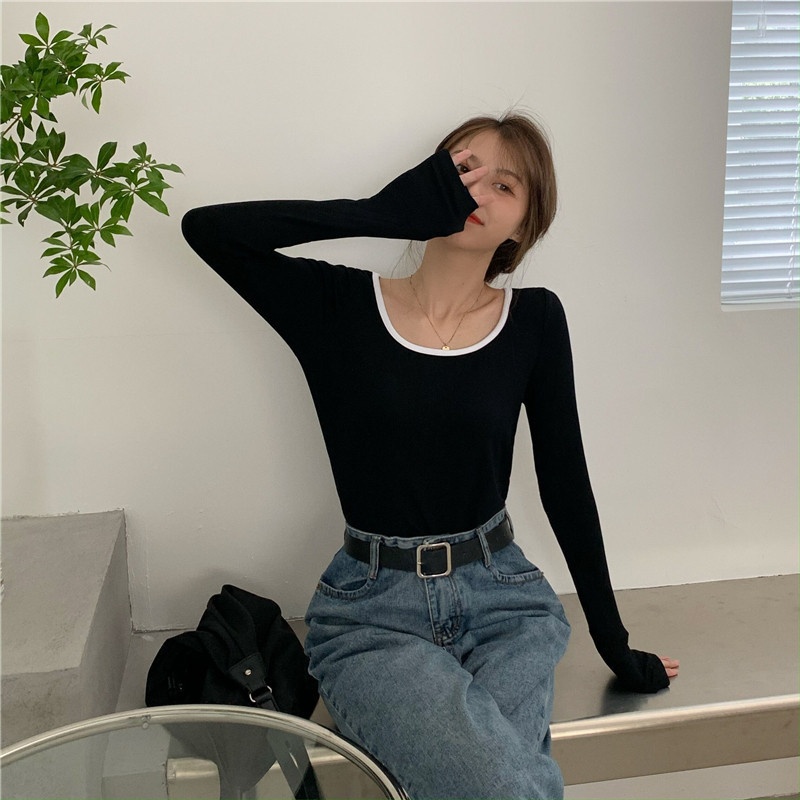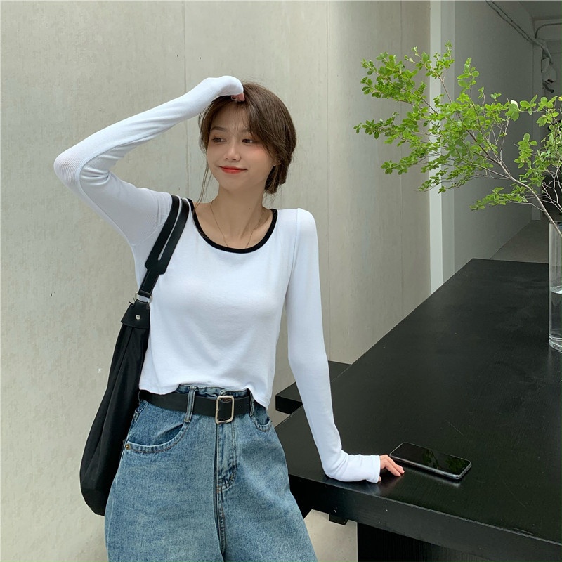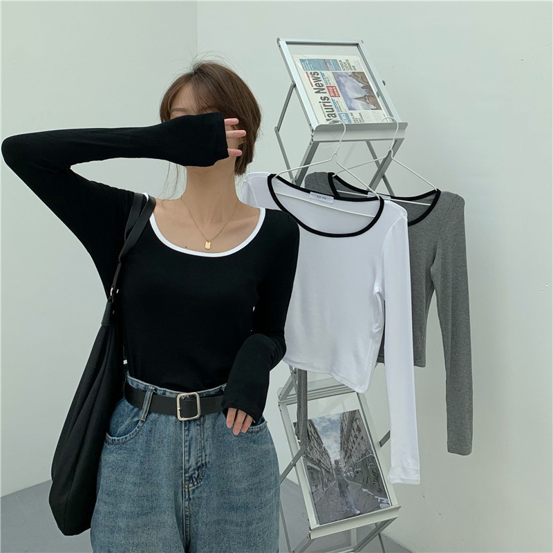 4009# 早秋新款薄款长袖T恤女装锁骨内搭打底衫秋冬短款甜辣上衣