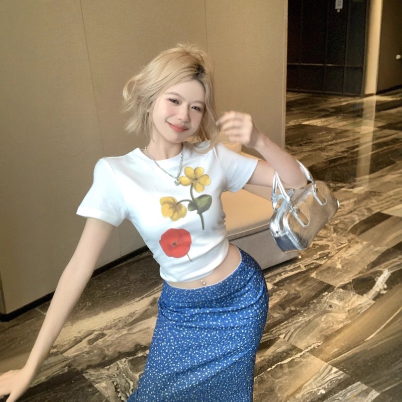 白色花朵印花圆领短袖T恤女2025夏季修身设计感韩系修身正肩上衣