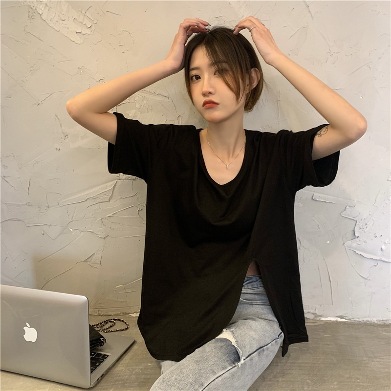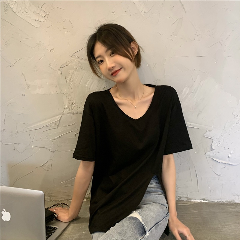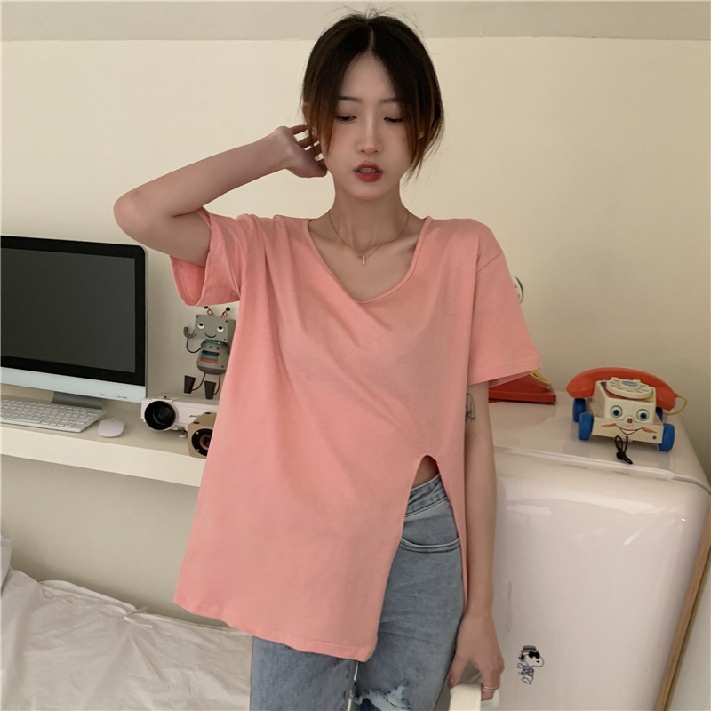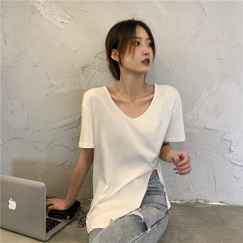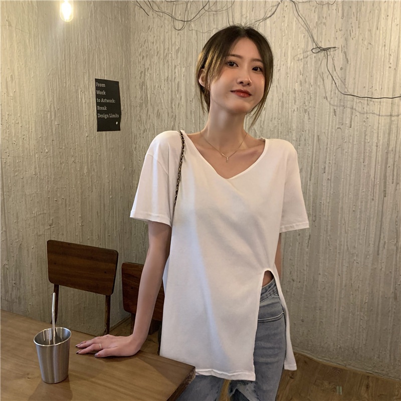 开叉v领短袖t恤女装夏季2025新款设计感锁骨别致宽松学生上衣服女