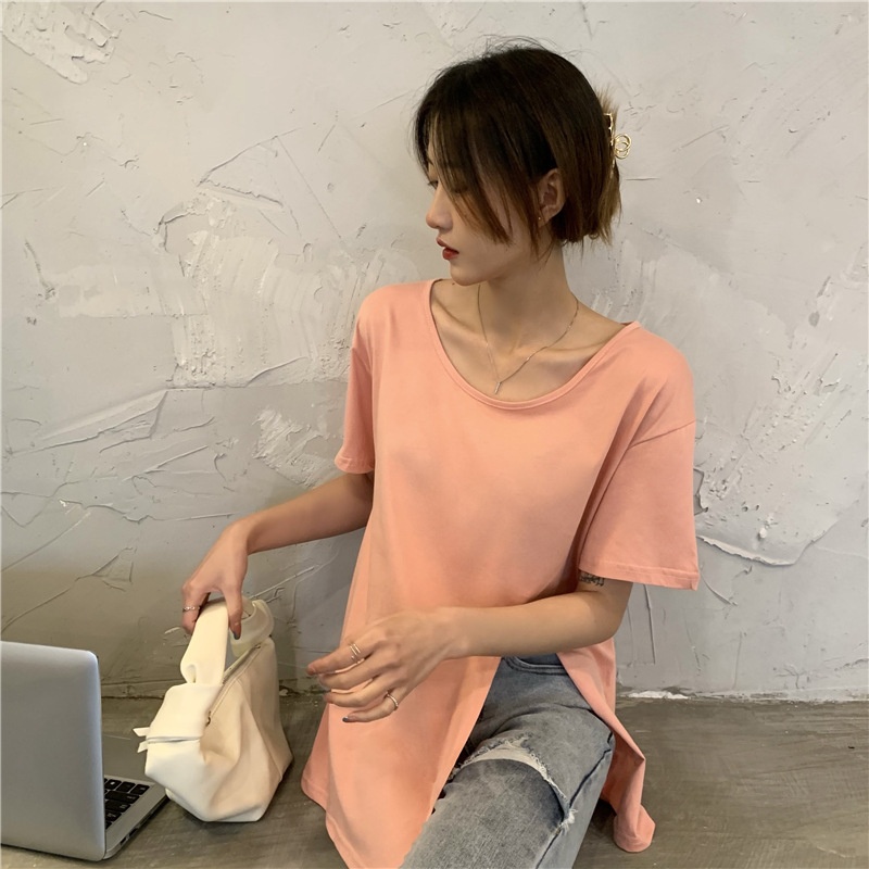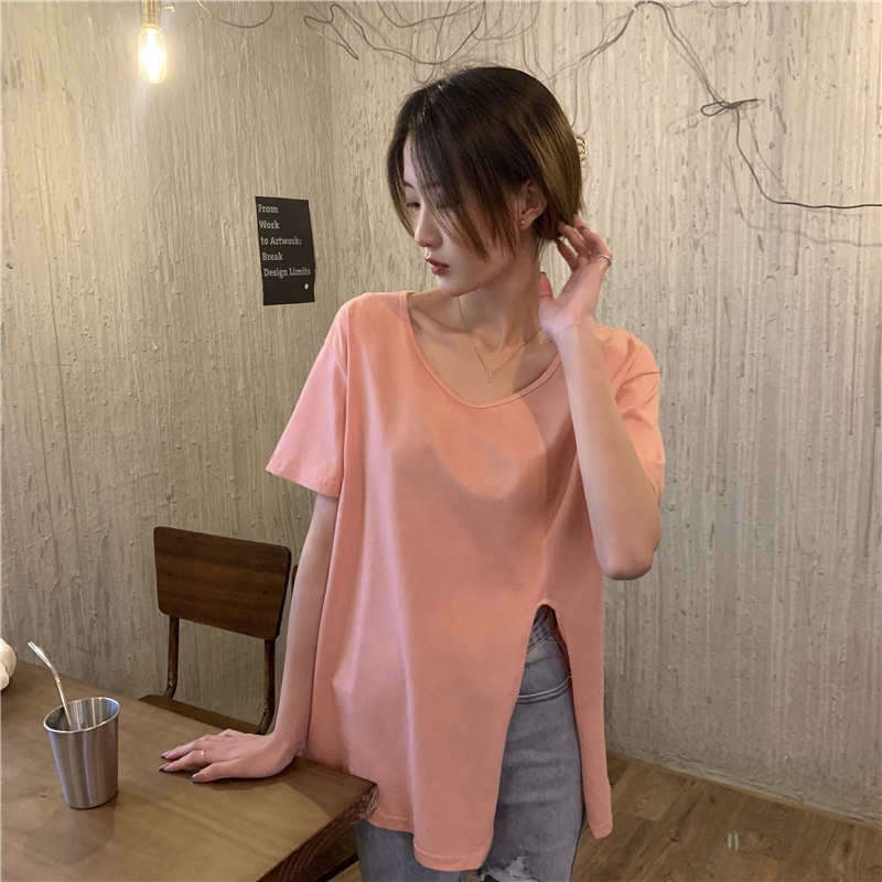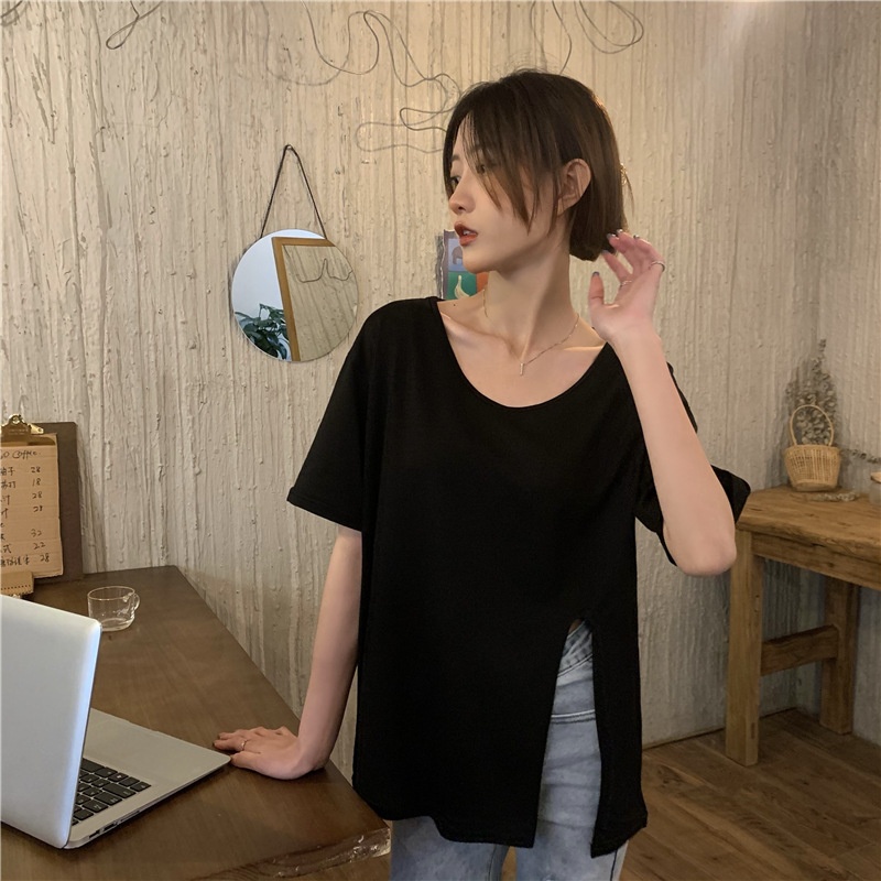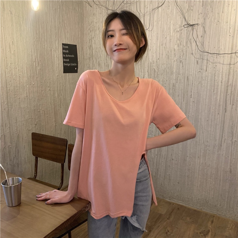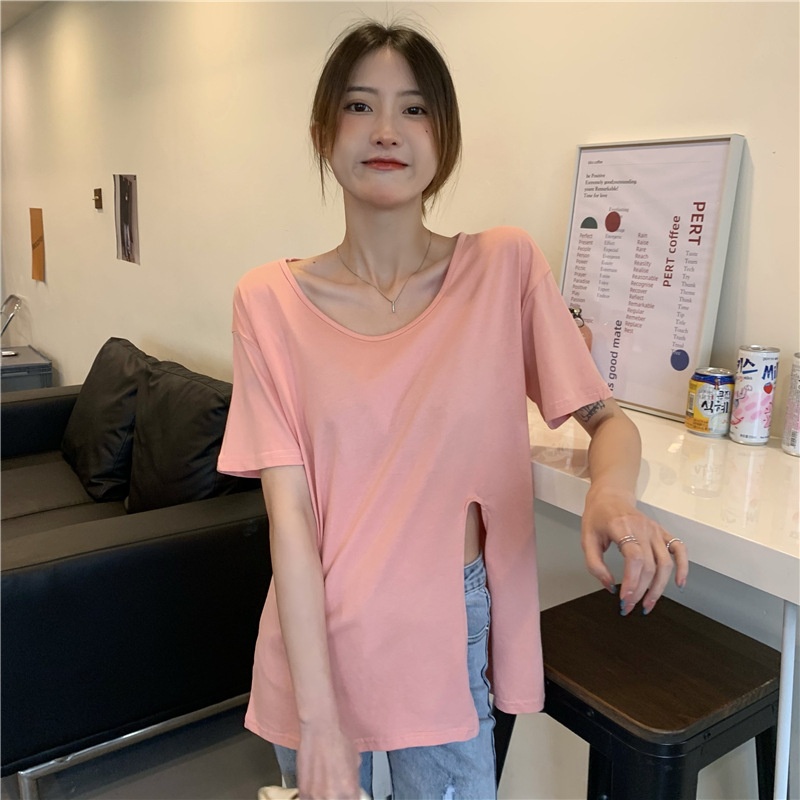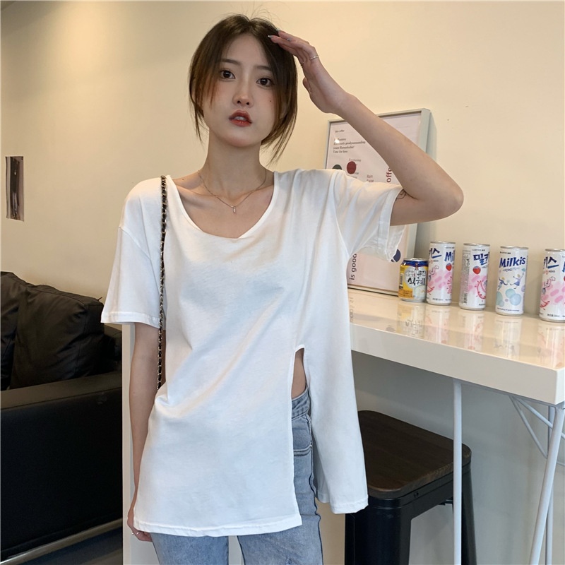 开叉v领短袖t恤女装夏季2025新款设计感锁骨别致宽松学生上衣服女