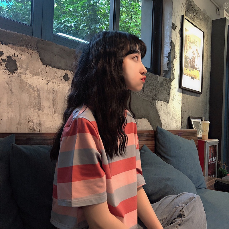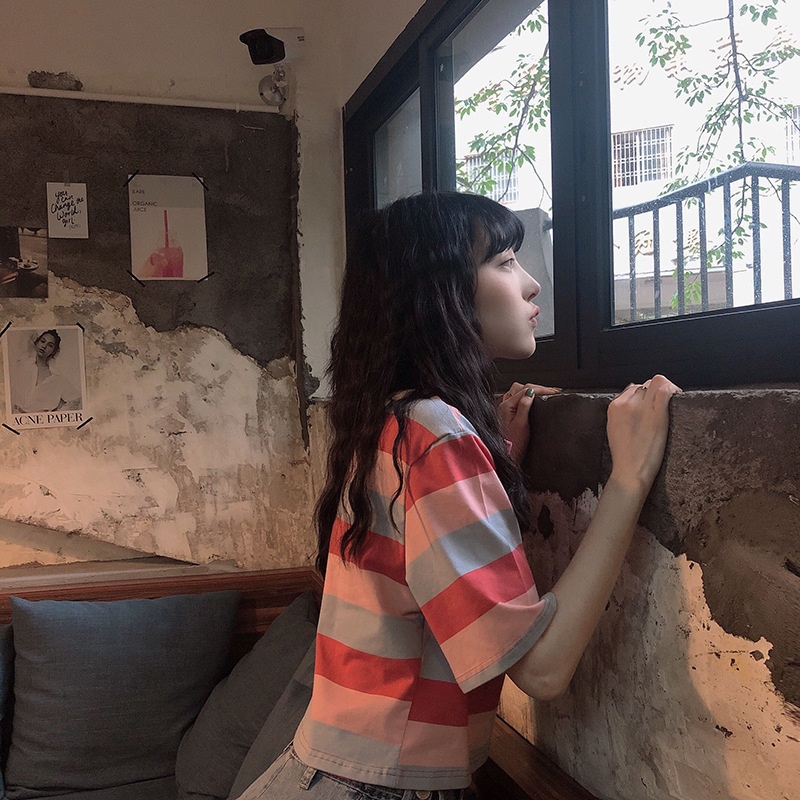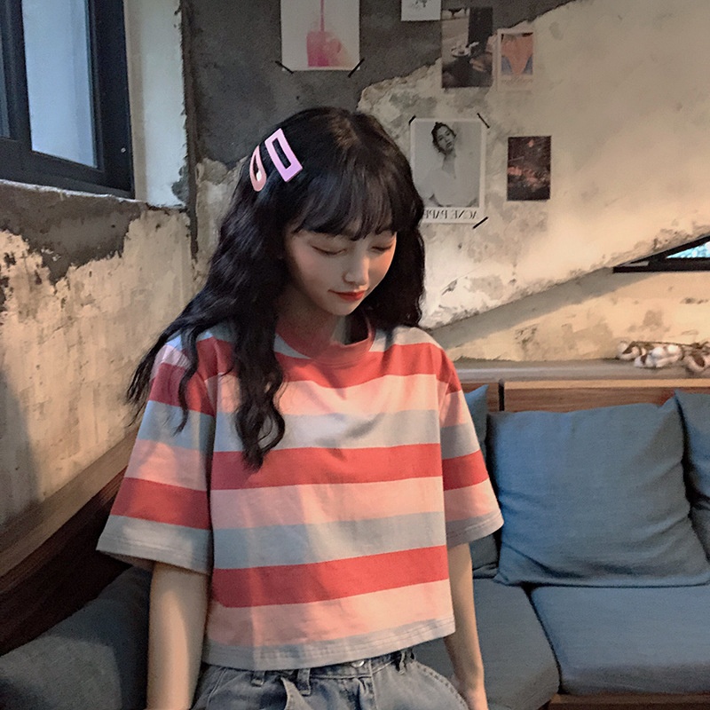 跨境外贸夏季新款韩版宽松彩虹条纹短袖T恤女学生短款露脐上衣潮