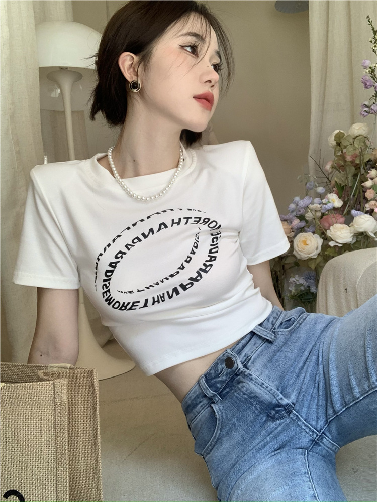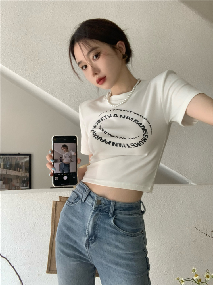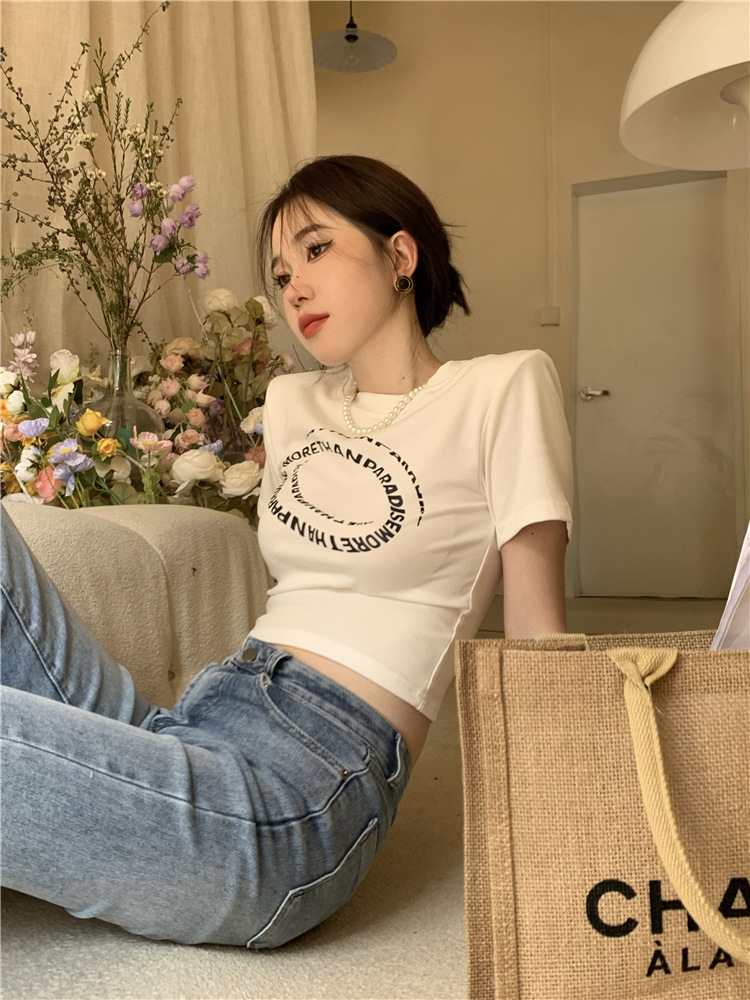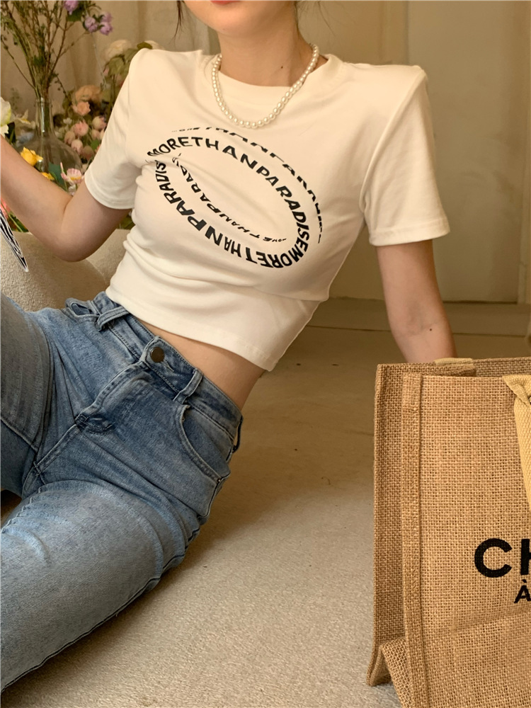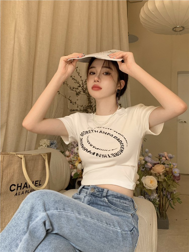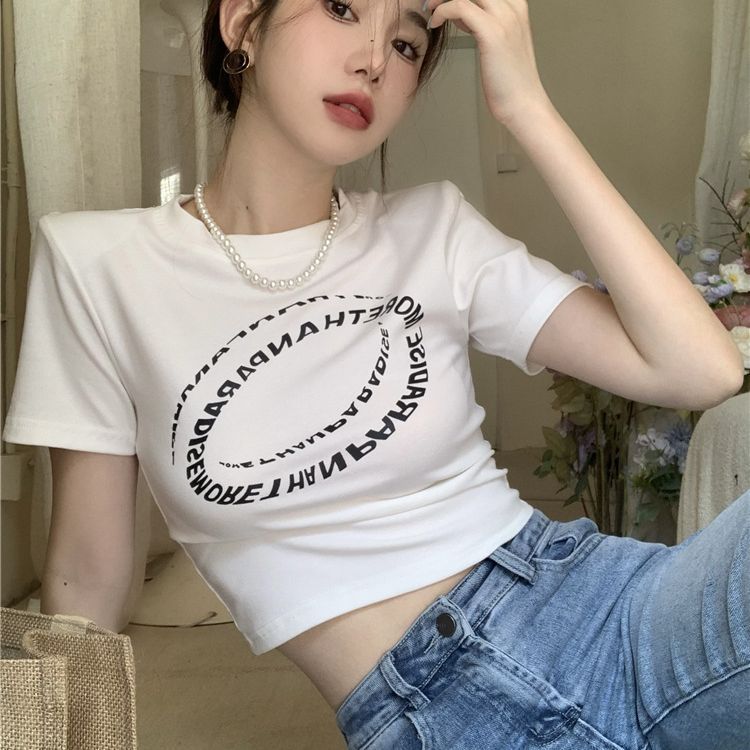 字母印花短袖T恤女2025年夏季新款修身显瘦辣妹白色短款学生上衣