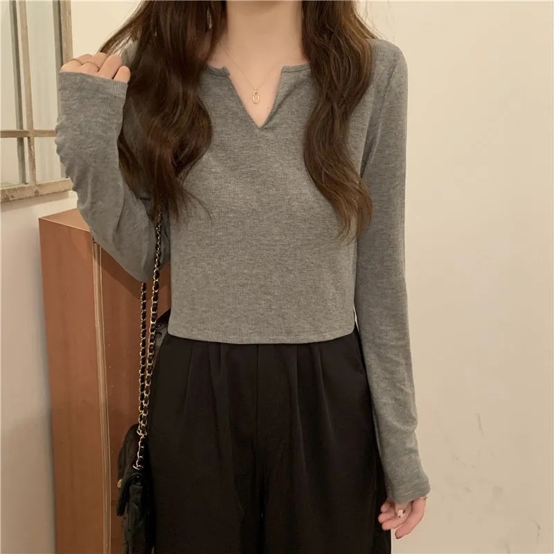 小众v领长袖t恤女春秋2022年新款韩版修身显瘦百搭打底衫短款上衣