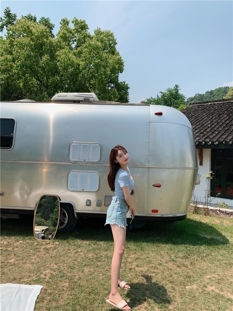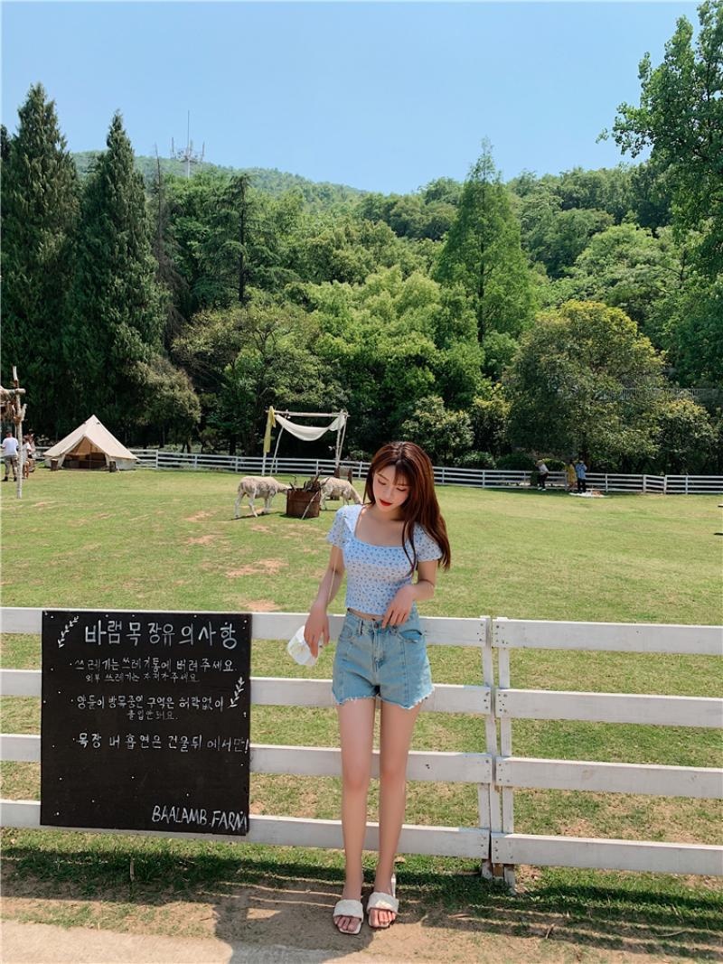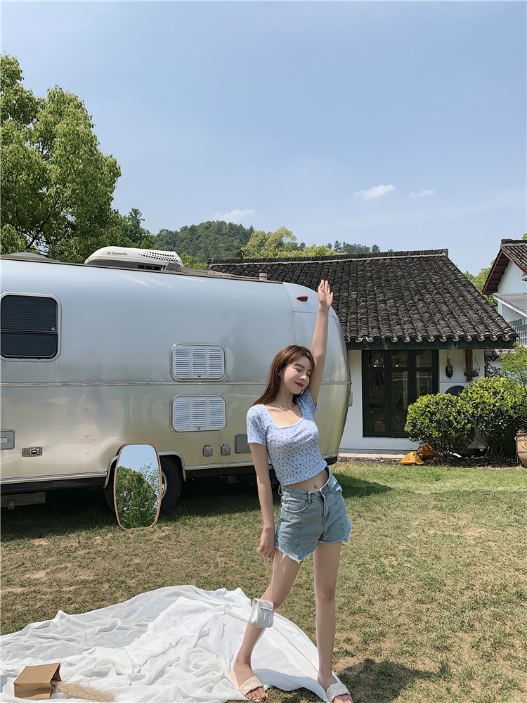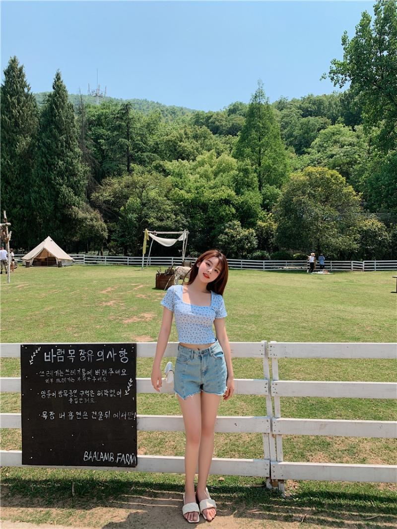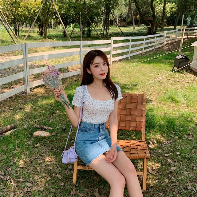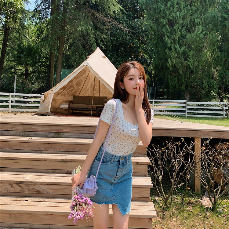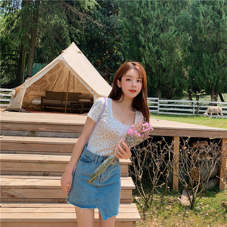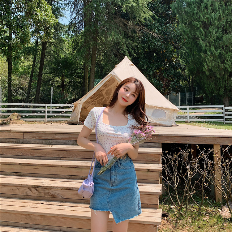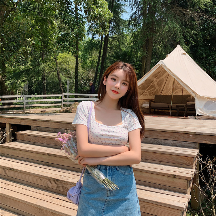 短款碎花方领T恤女2025年夏季新款韩版修身显瘦ins潮百搭短袖上衣