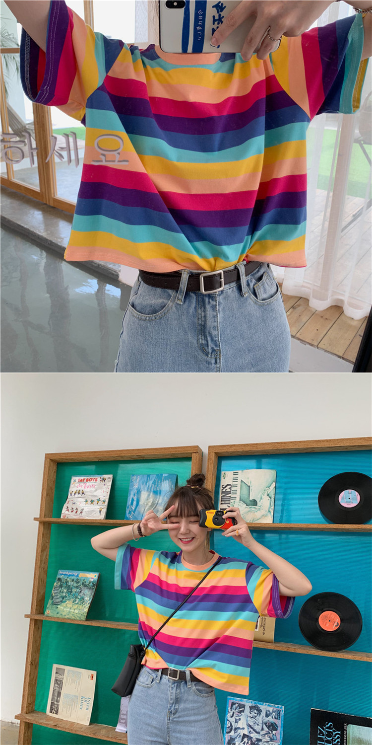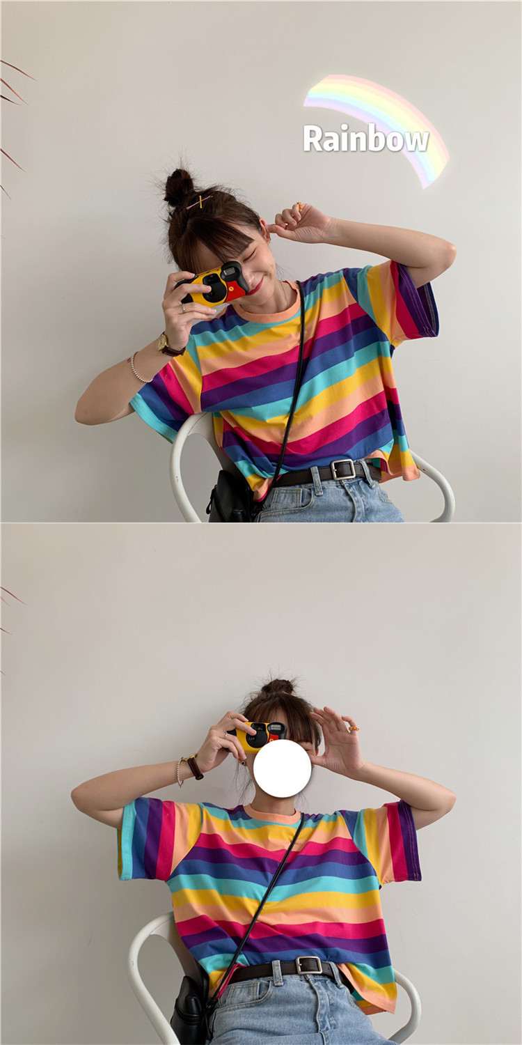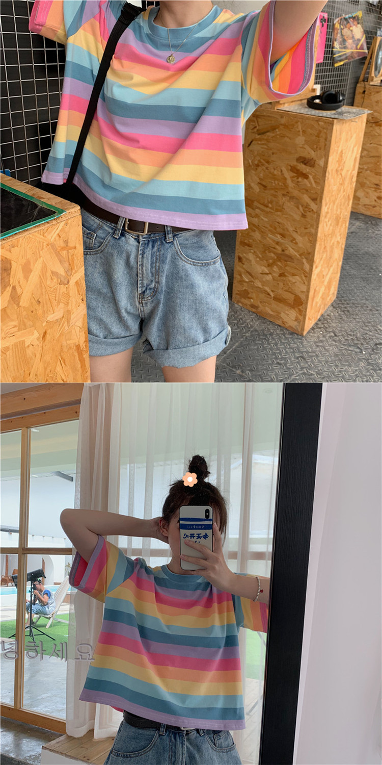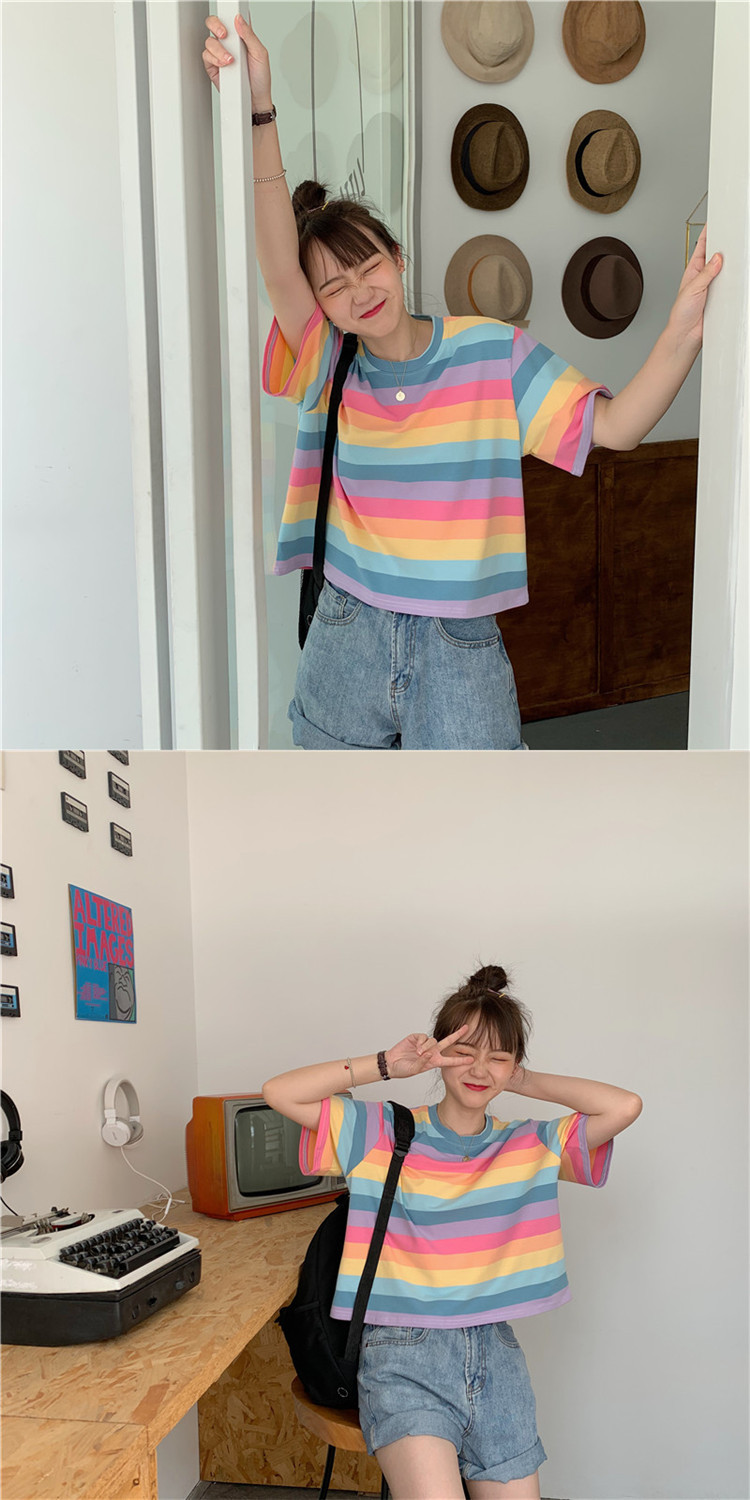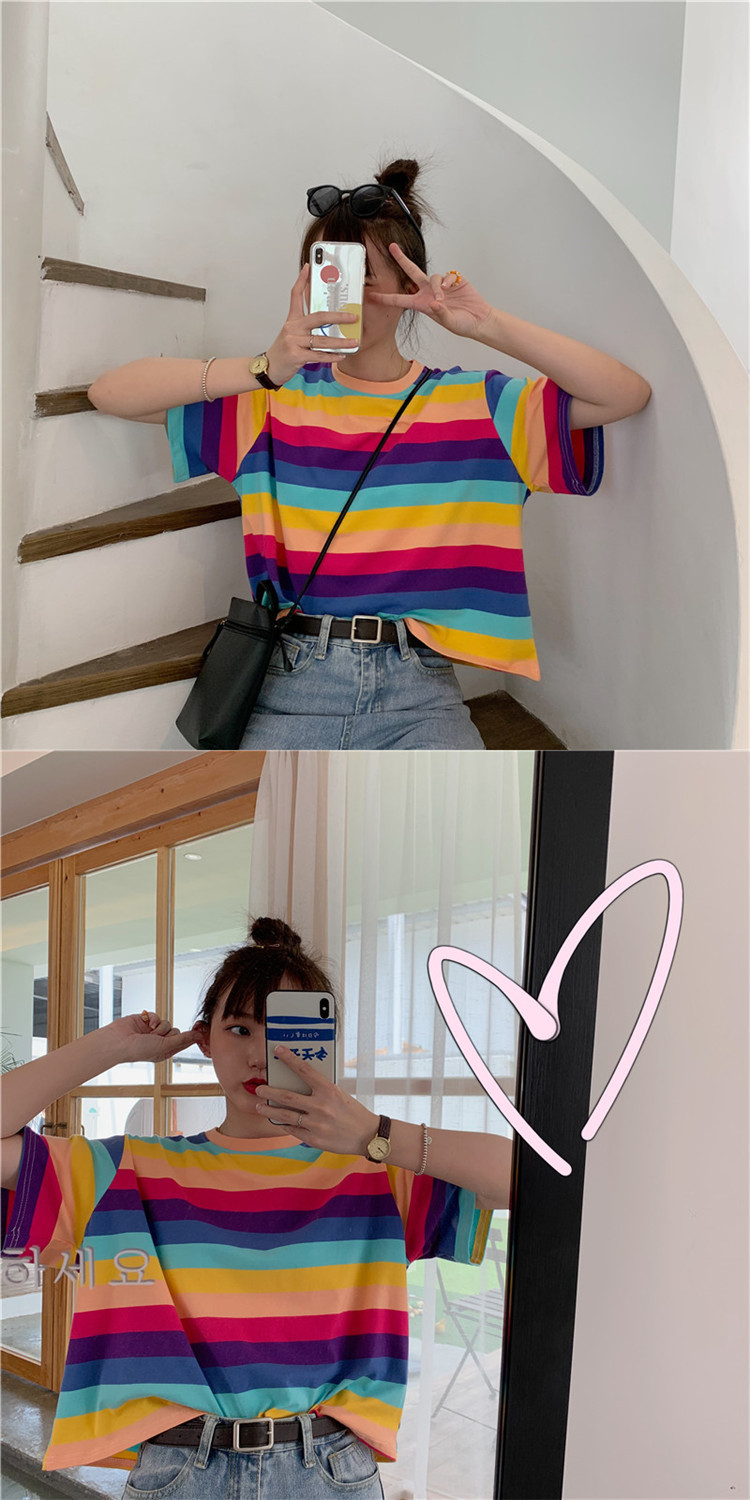 彩虹条纹T恤女短袖ins潮2025夏装新款韩版宽松百搭短款学生上衣潮