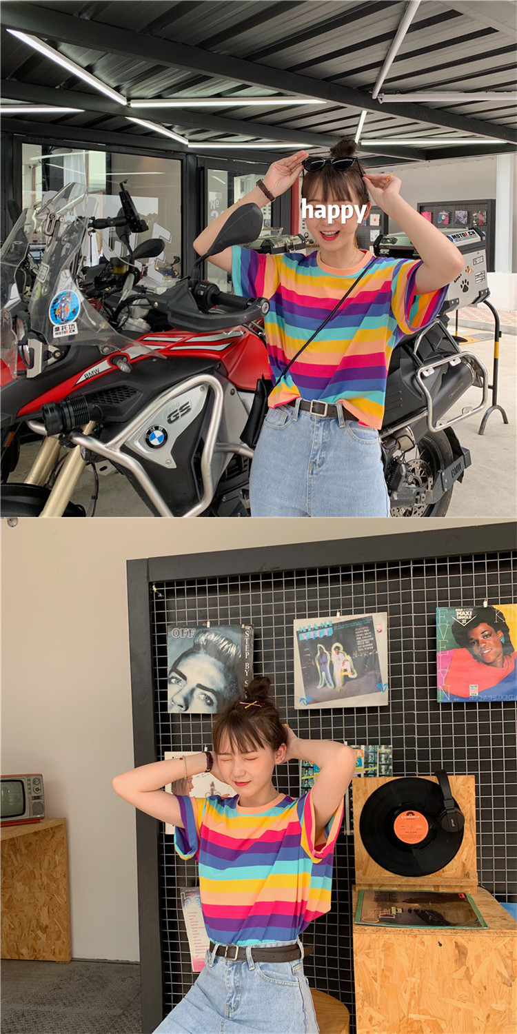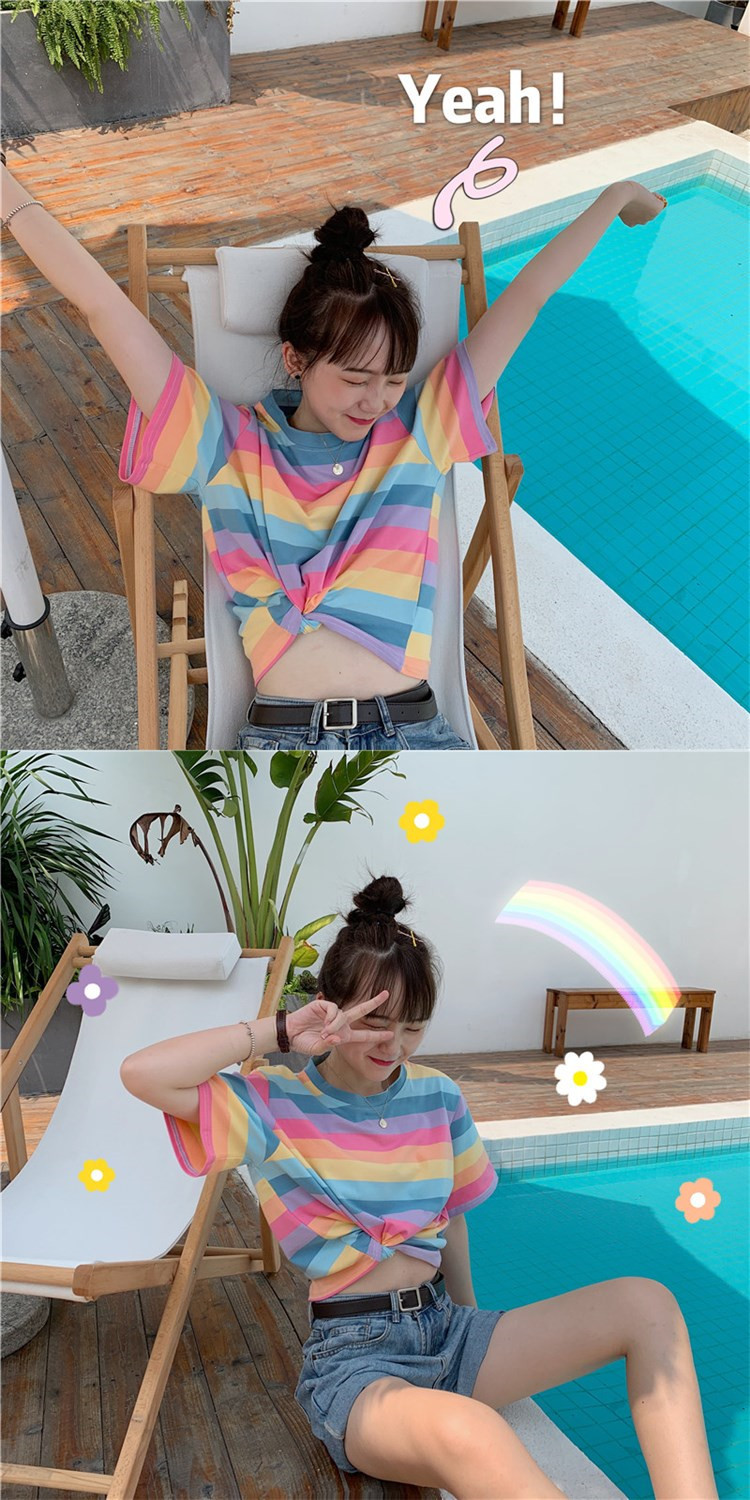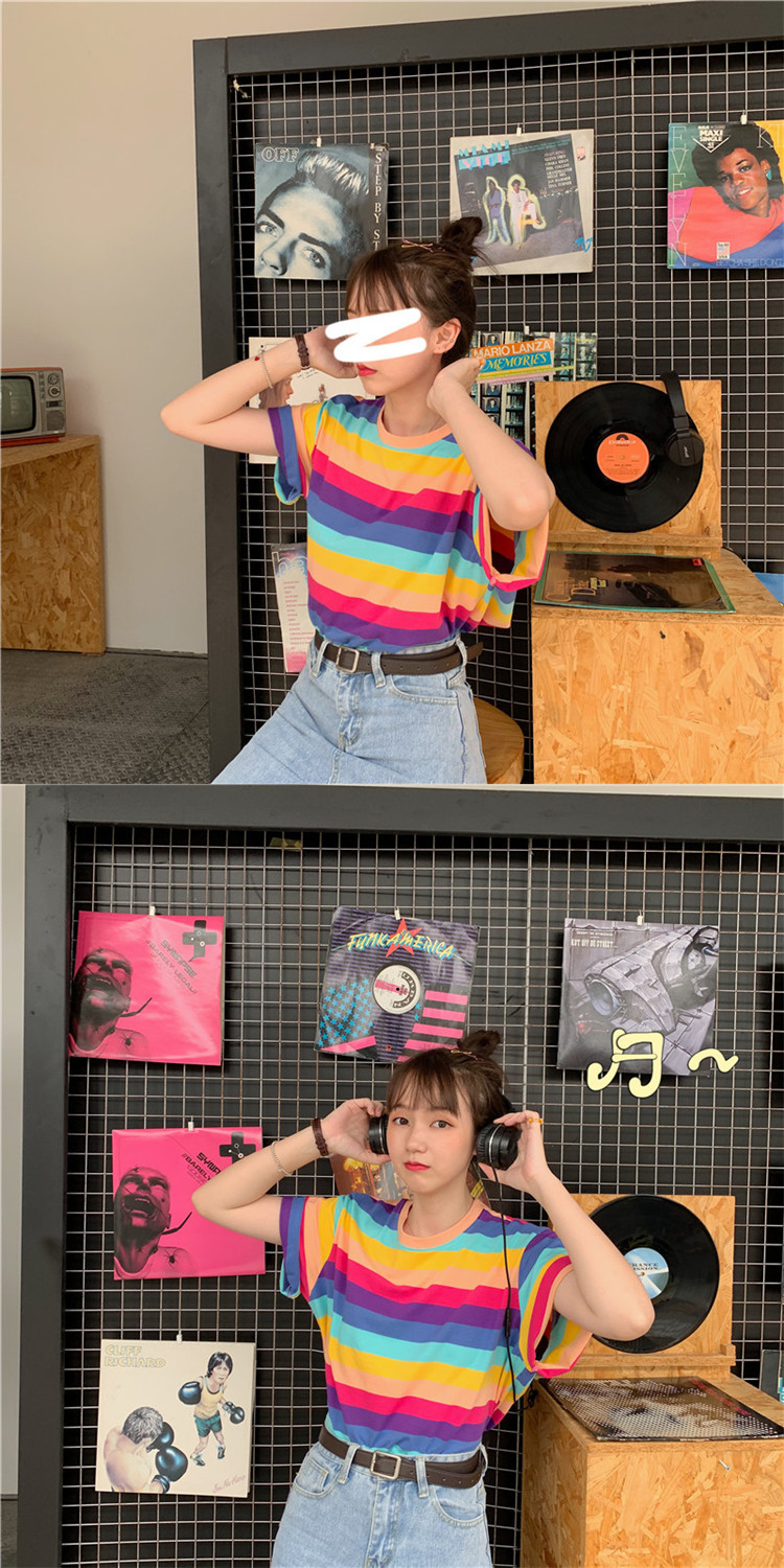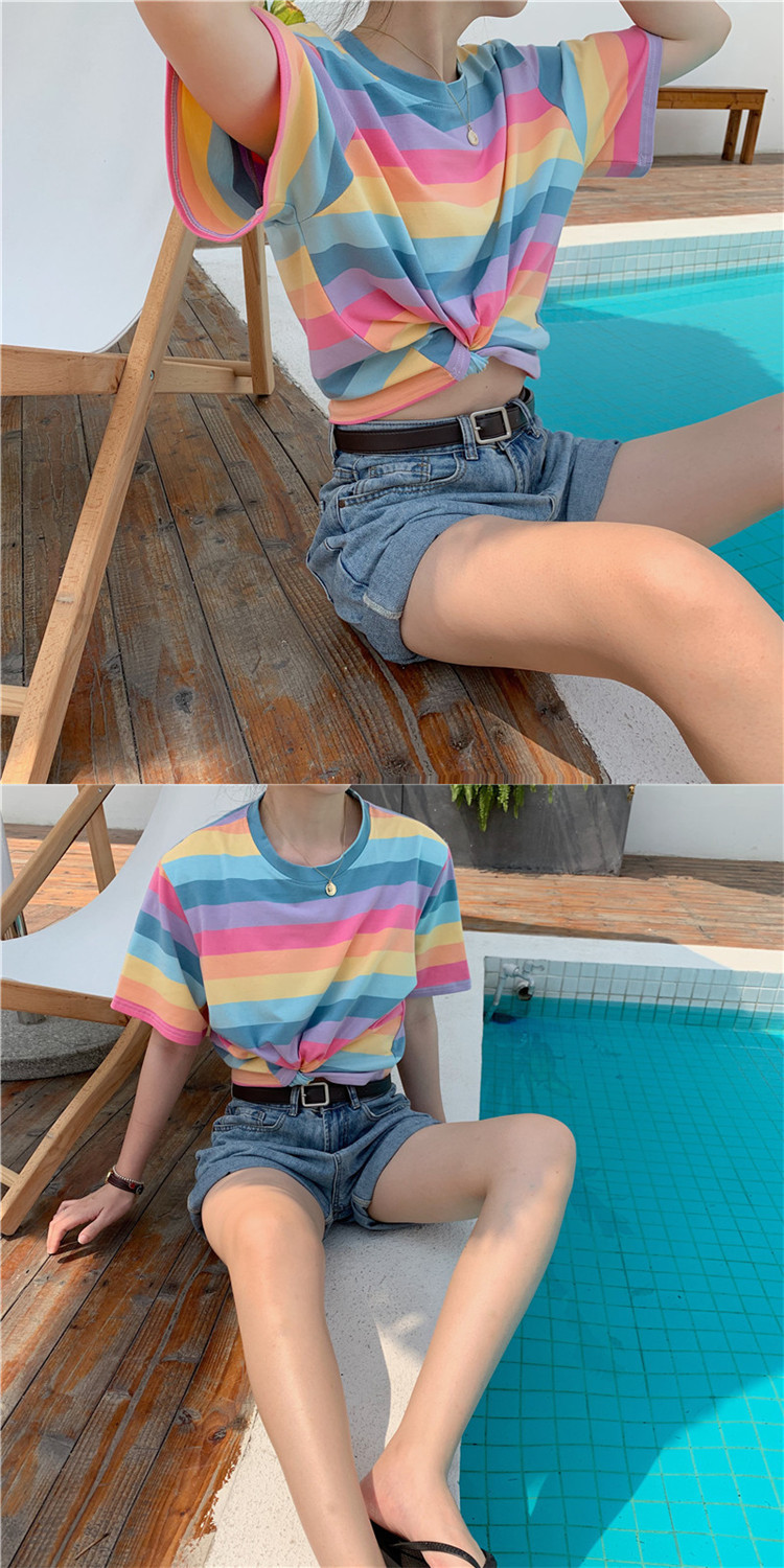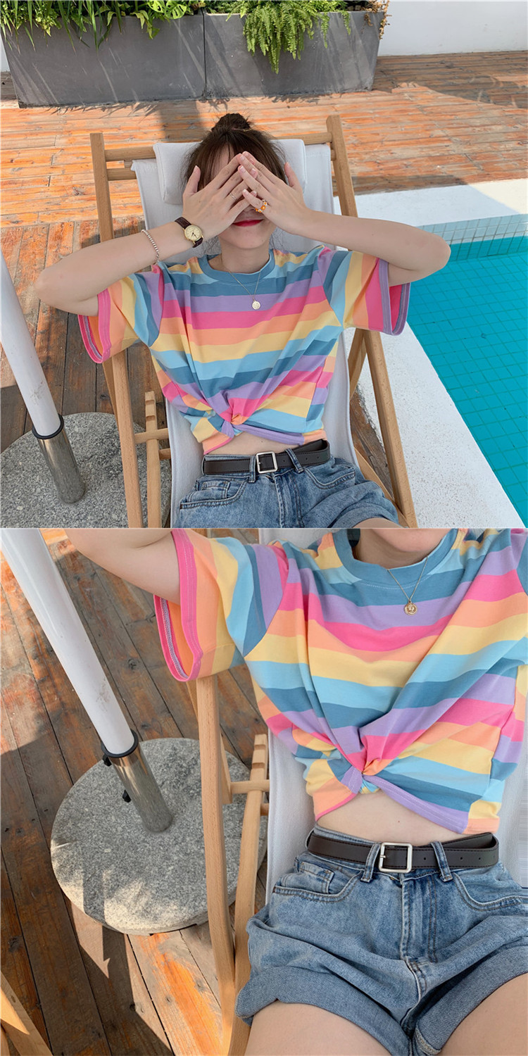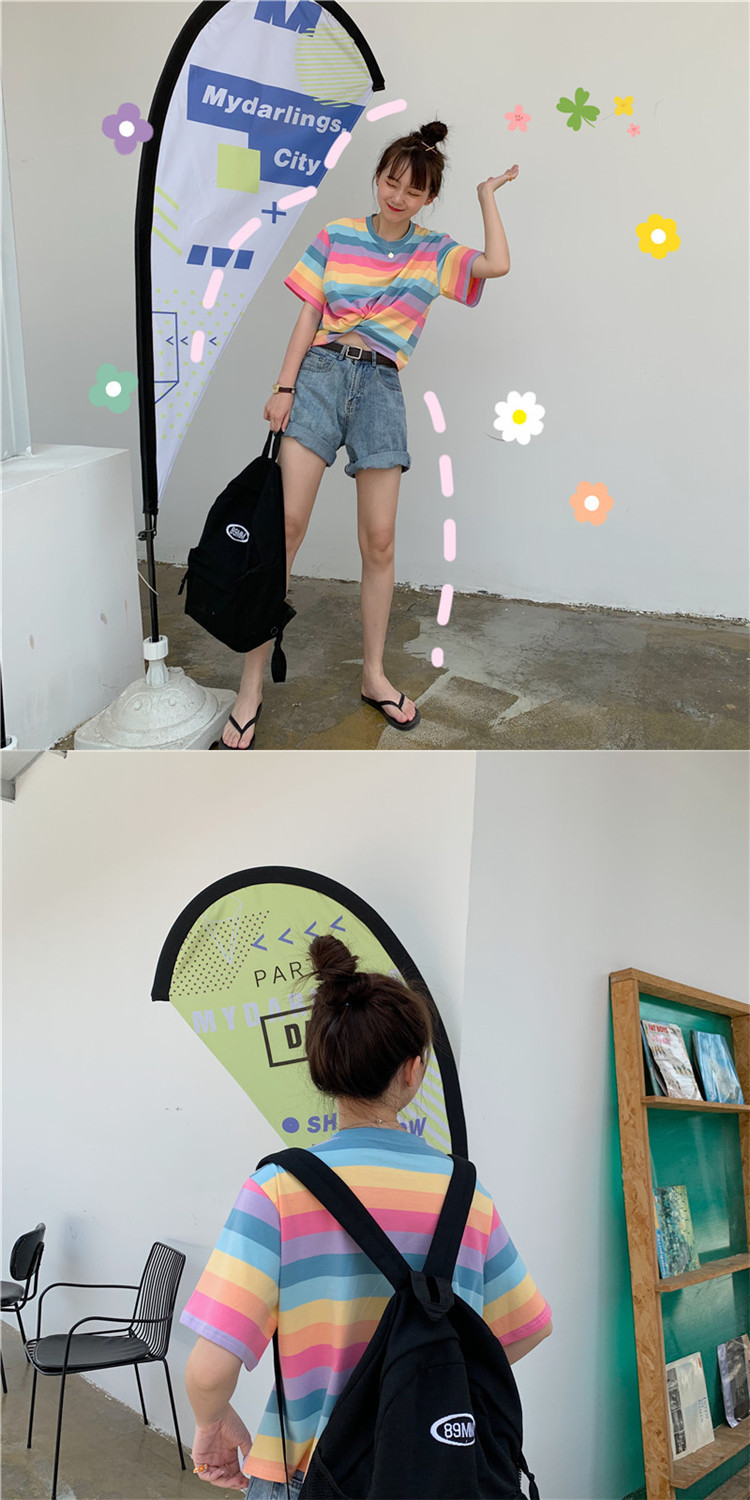 彩虹条纹T恤女短袖ins潮2025夏装新款韩版宽松百搭短款学生上衣潮