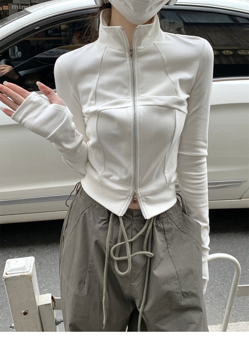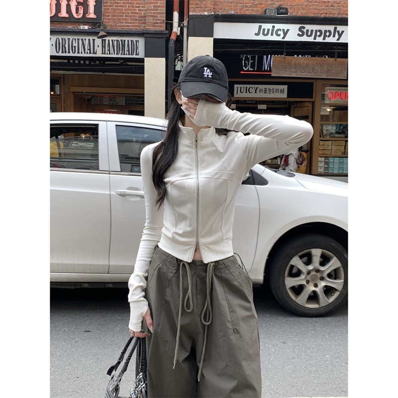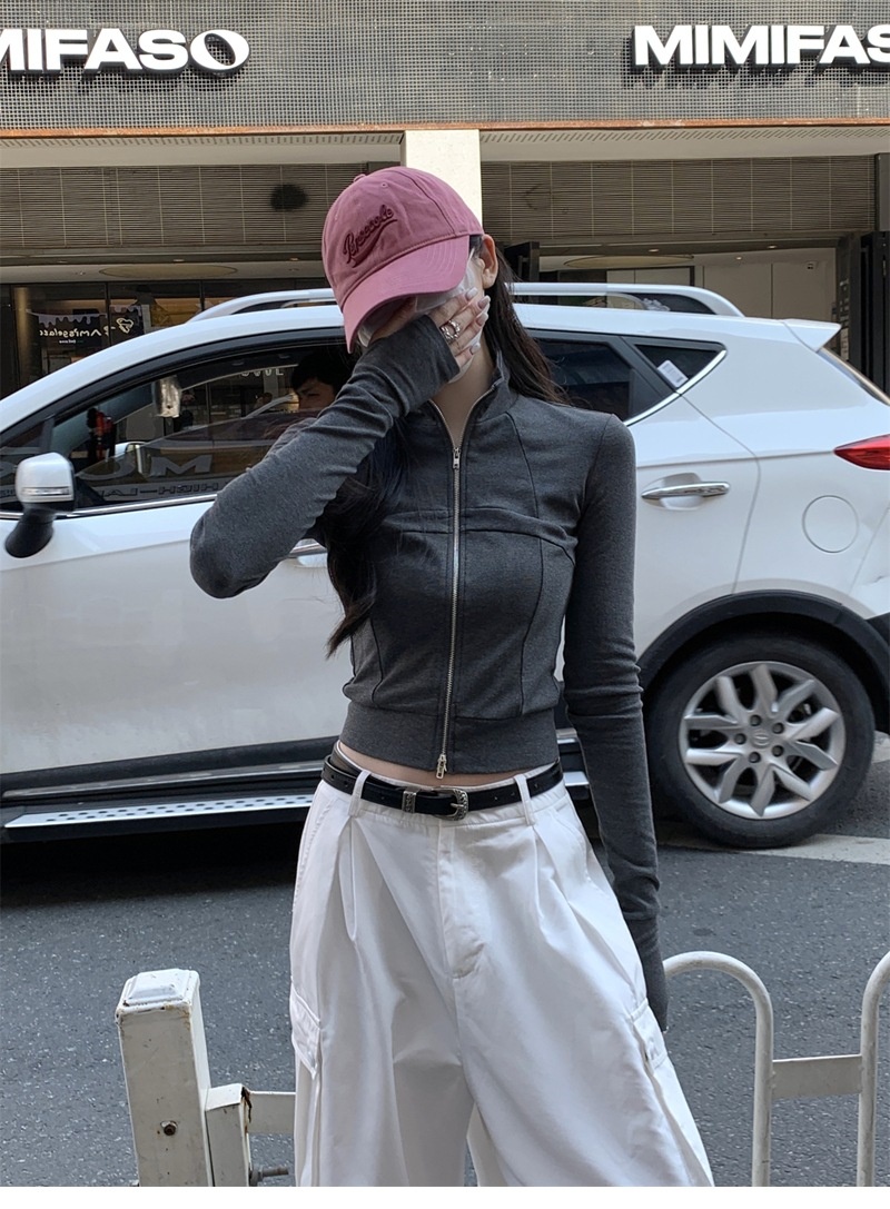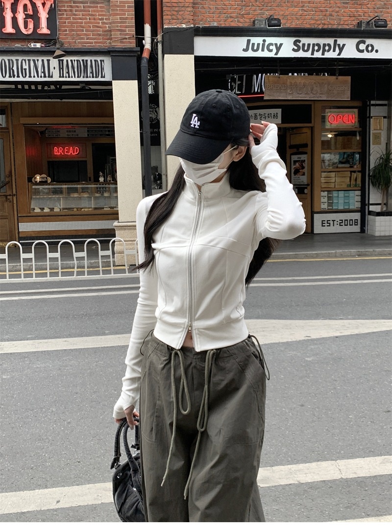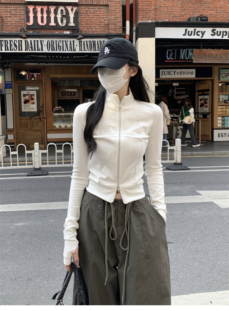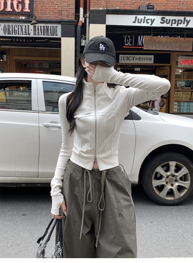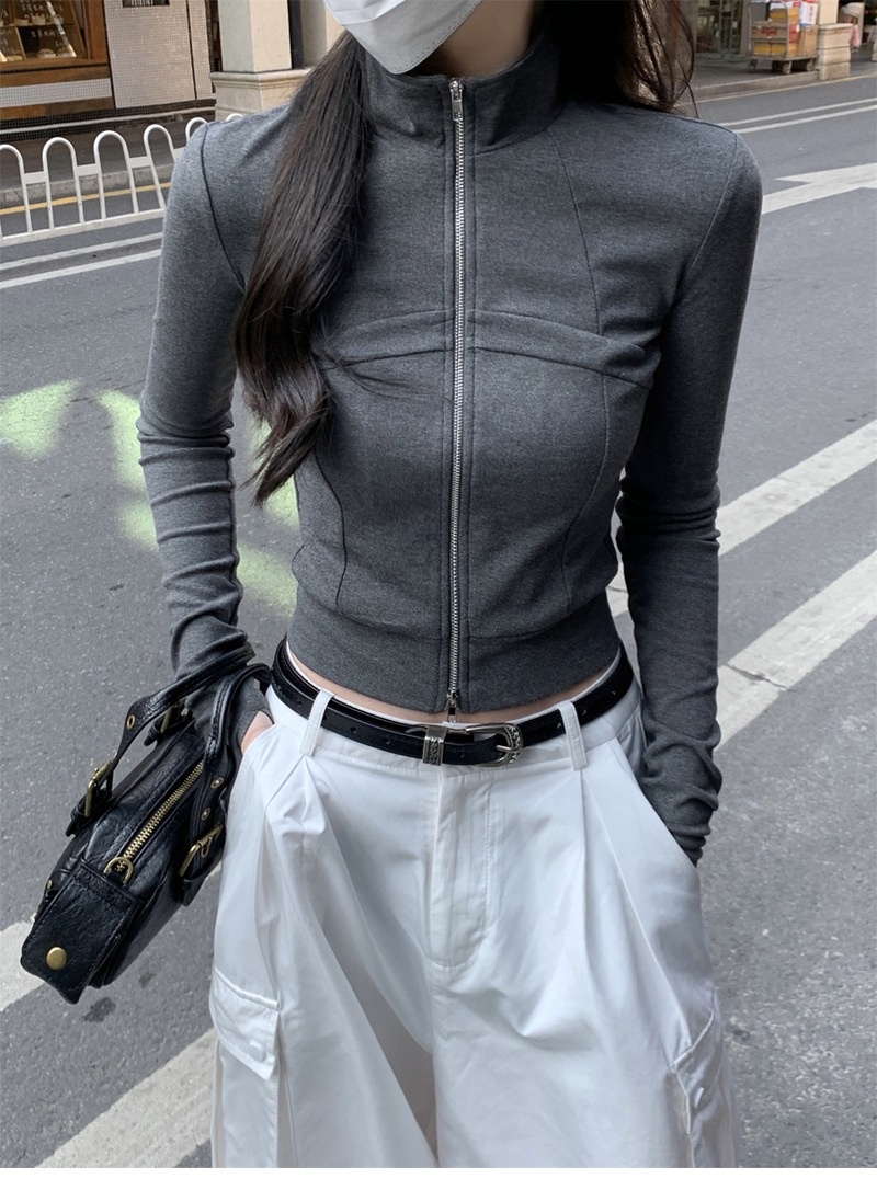 设计感鱼骨拉链长袖开衫T恤外套女早秋新款纯色修身短款德绒上衣