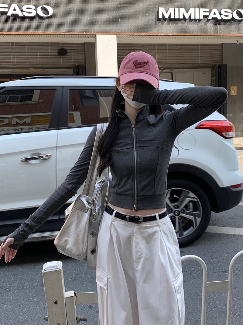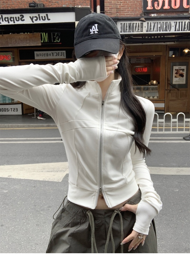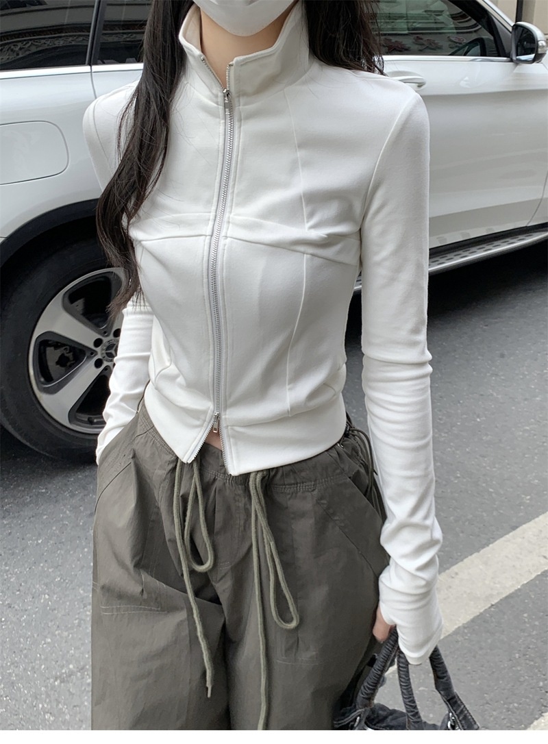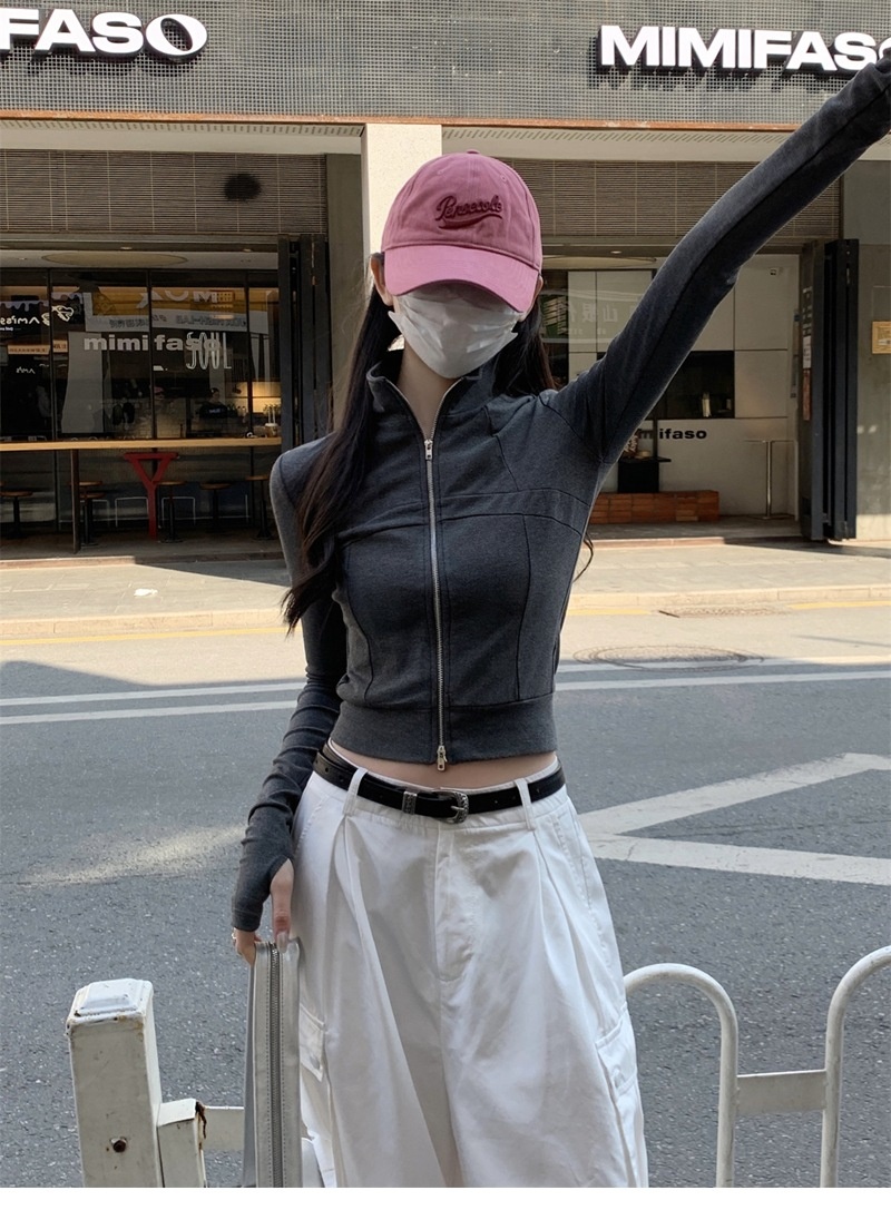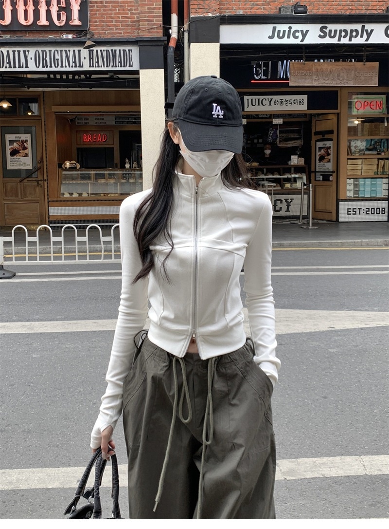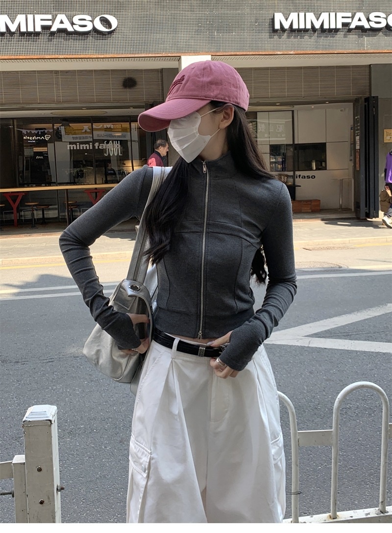 设计感鱼骨拉链长袖开衫T恤外套女早秋新款纯色修身短款德绒上衣