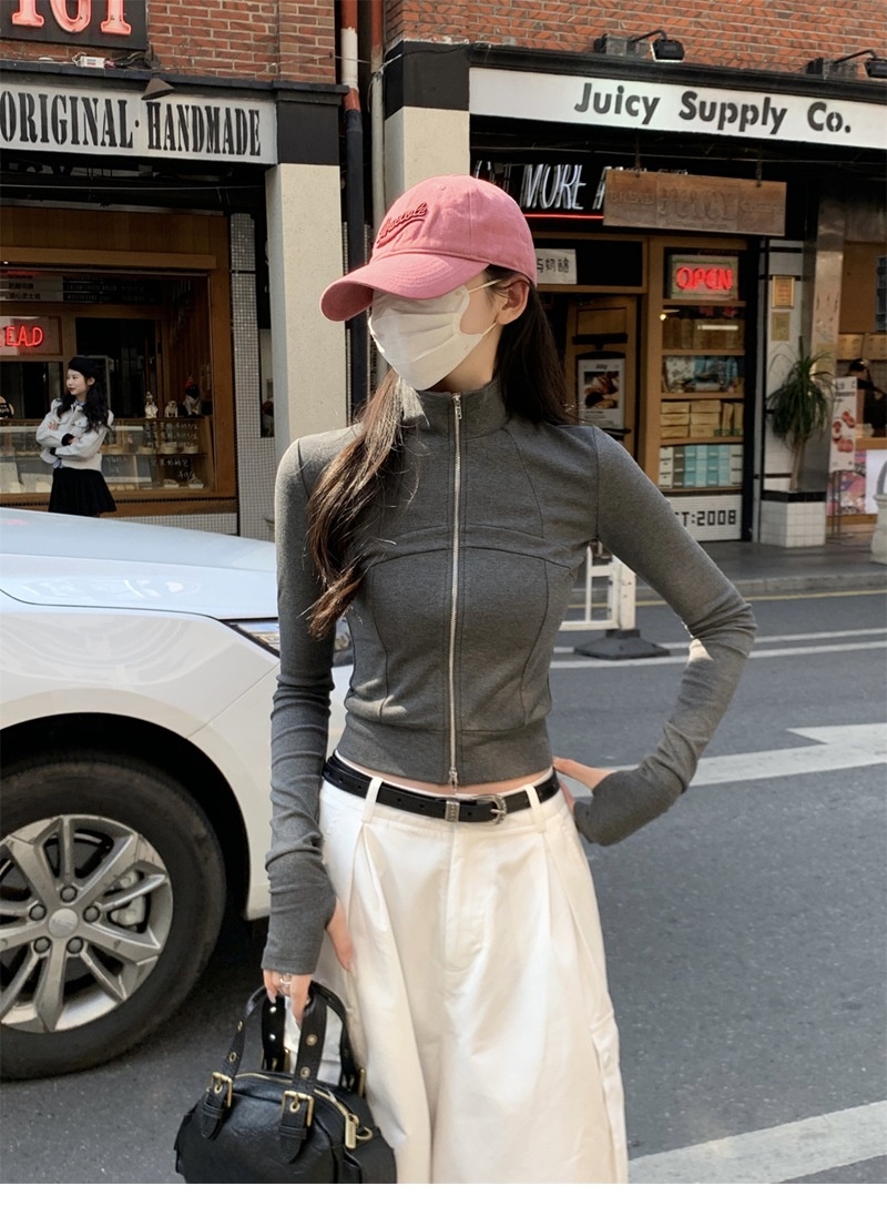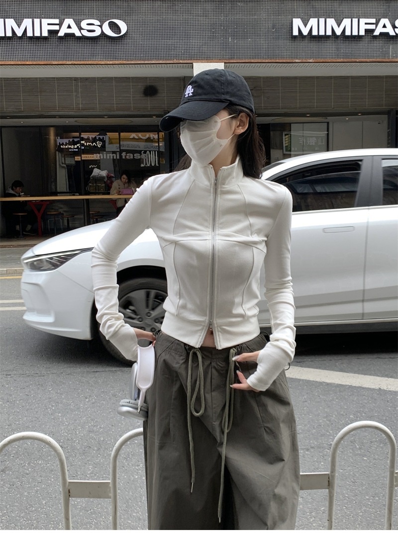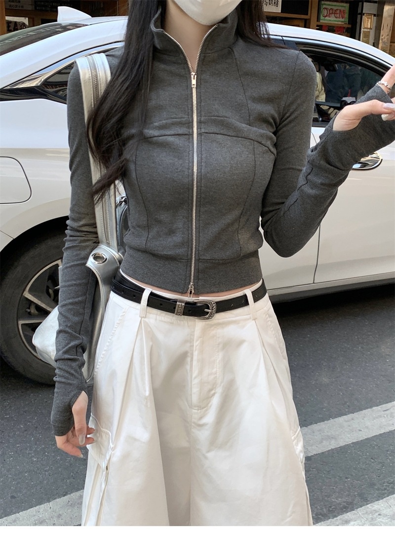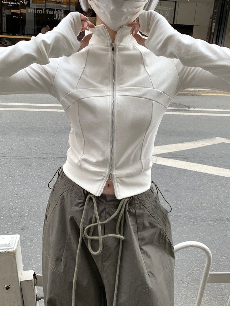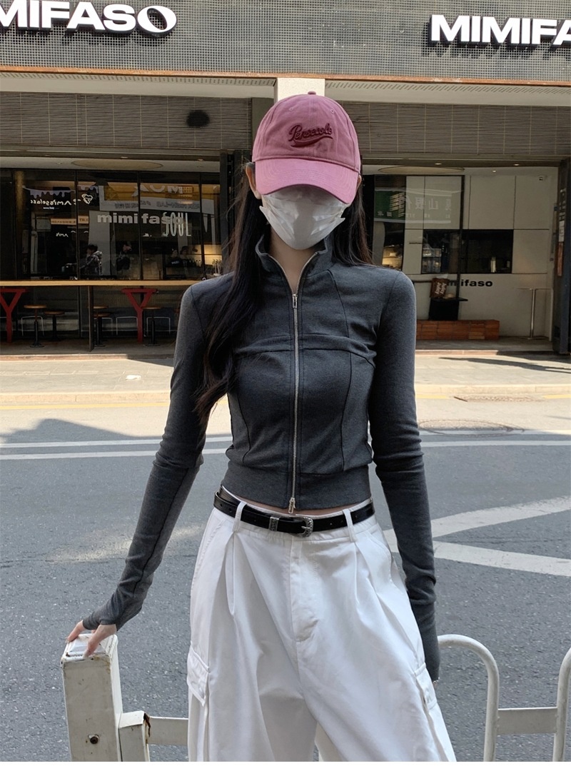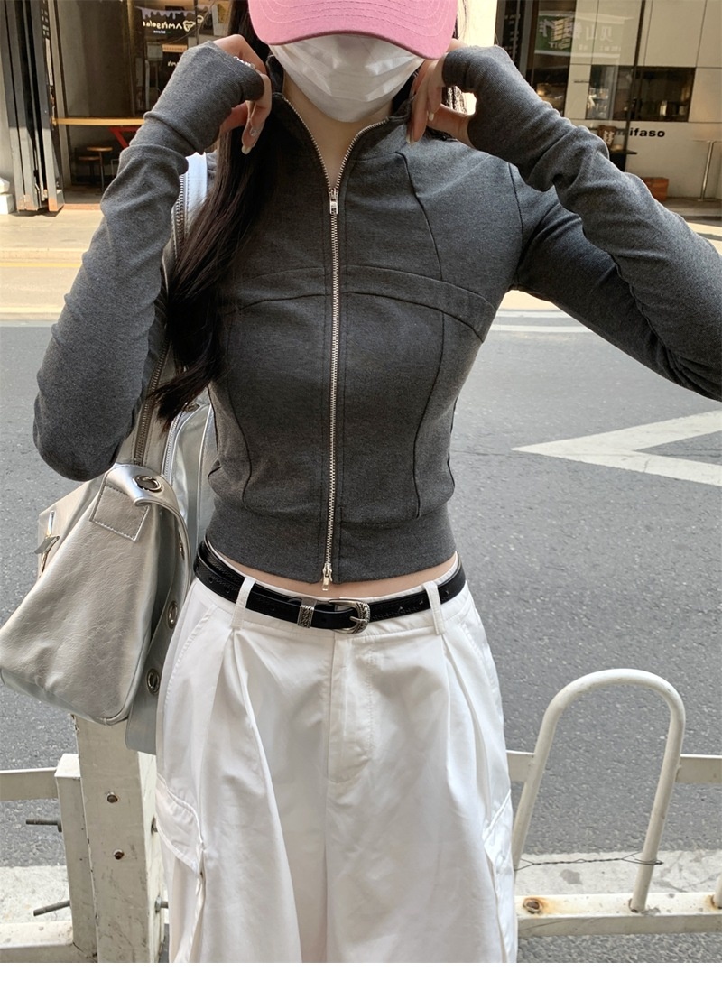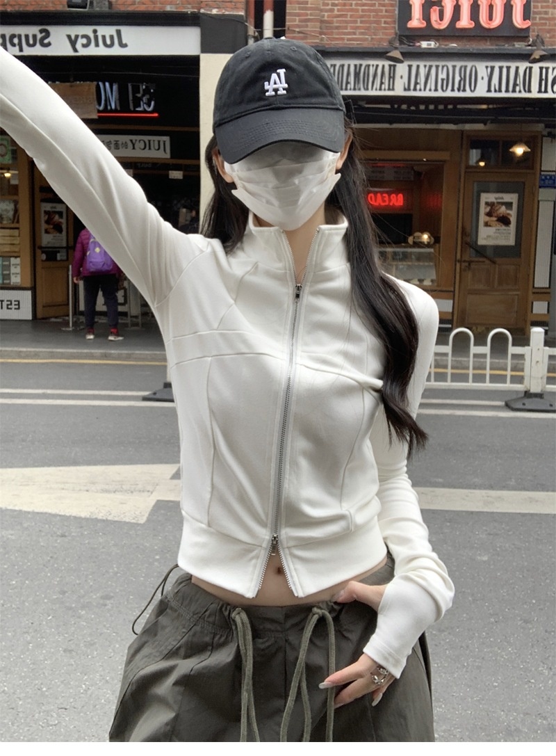 设计感鱼骨拉链长袖开衫T恤外套女早秋新款纯色修身短款德绒上衣